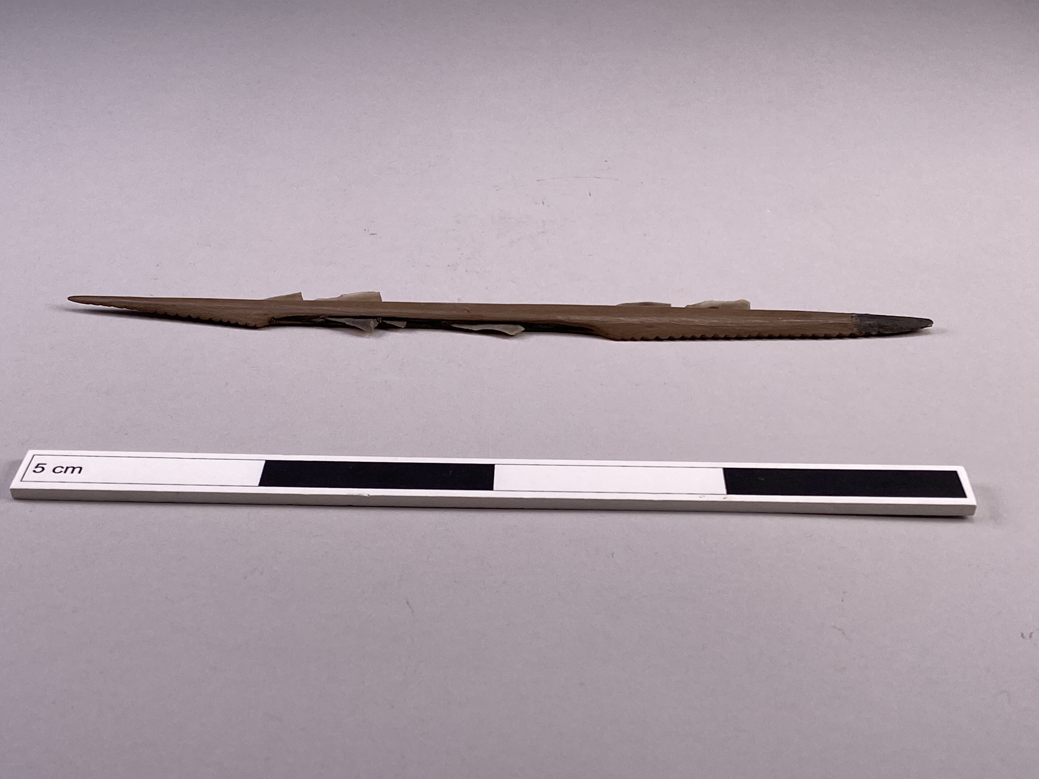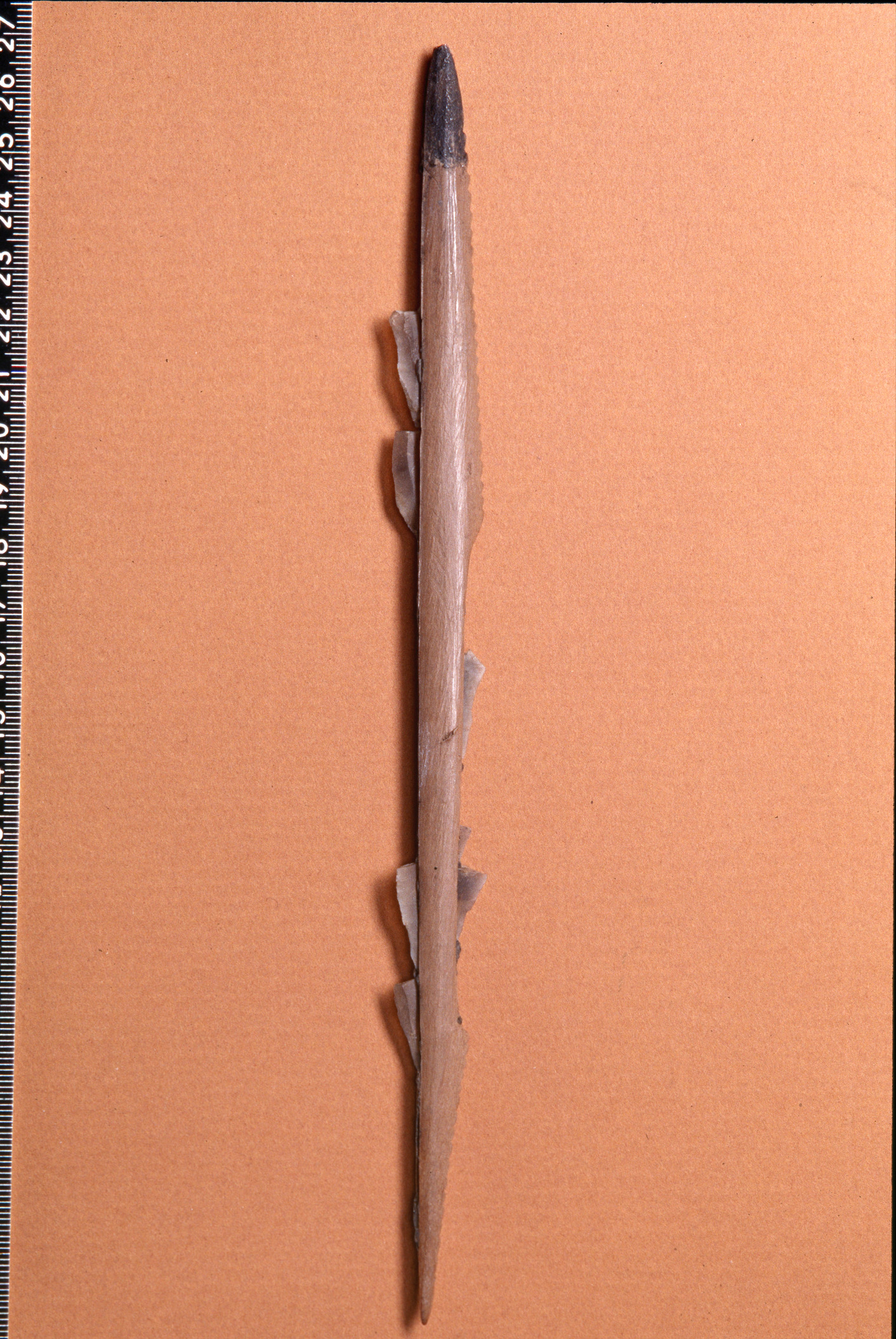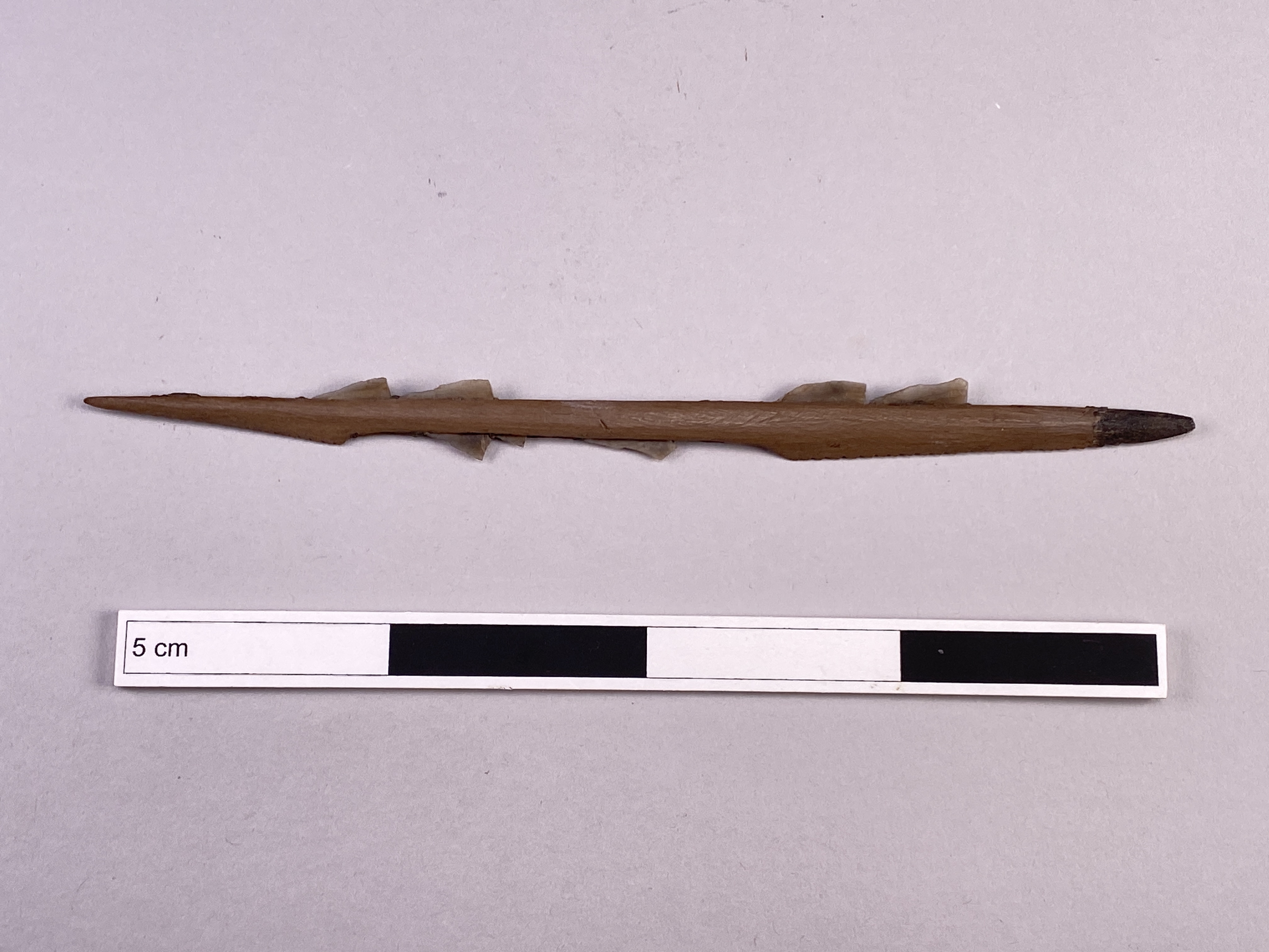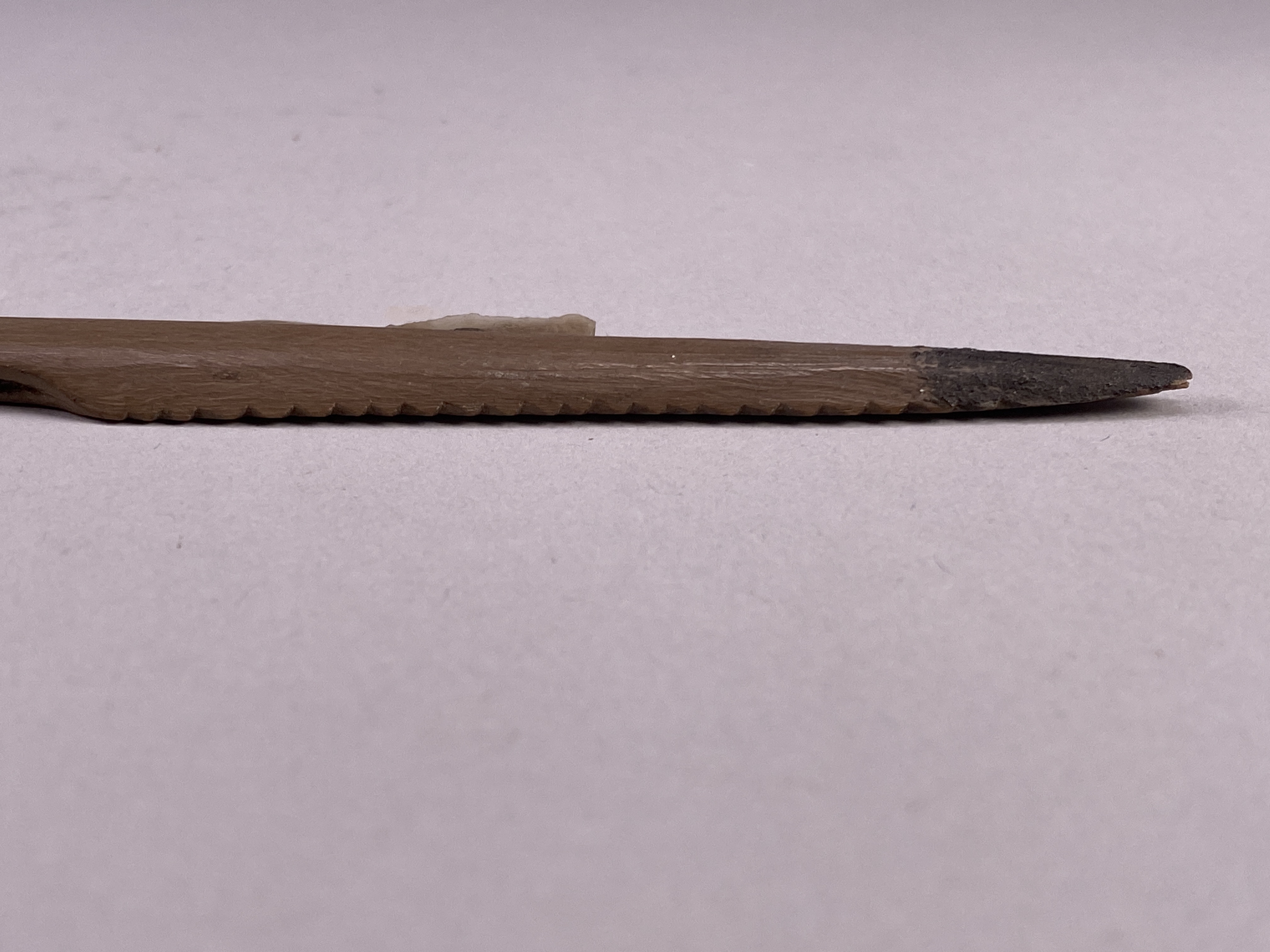 Fågelpil av ben med flinteggar och med den övriga eggen småtandad.