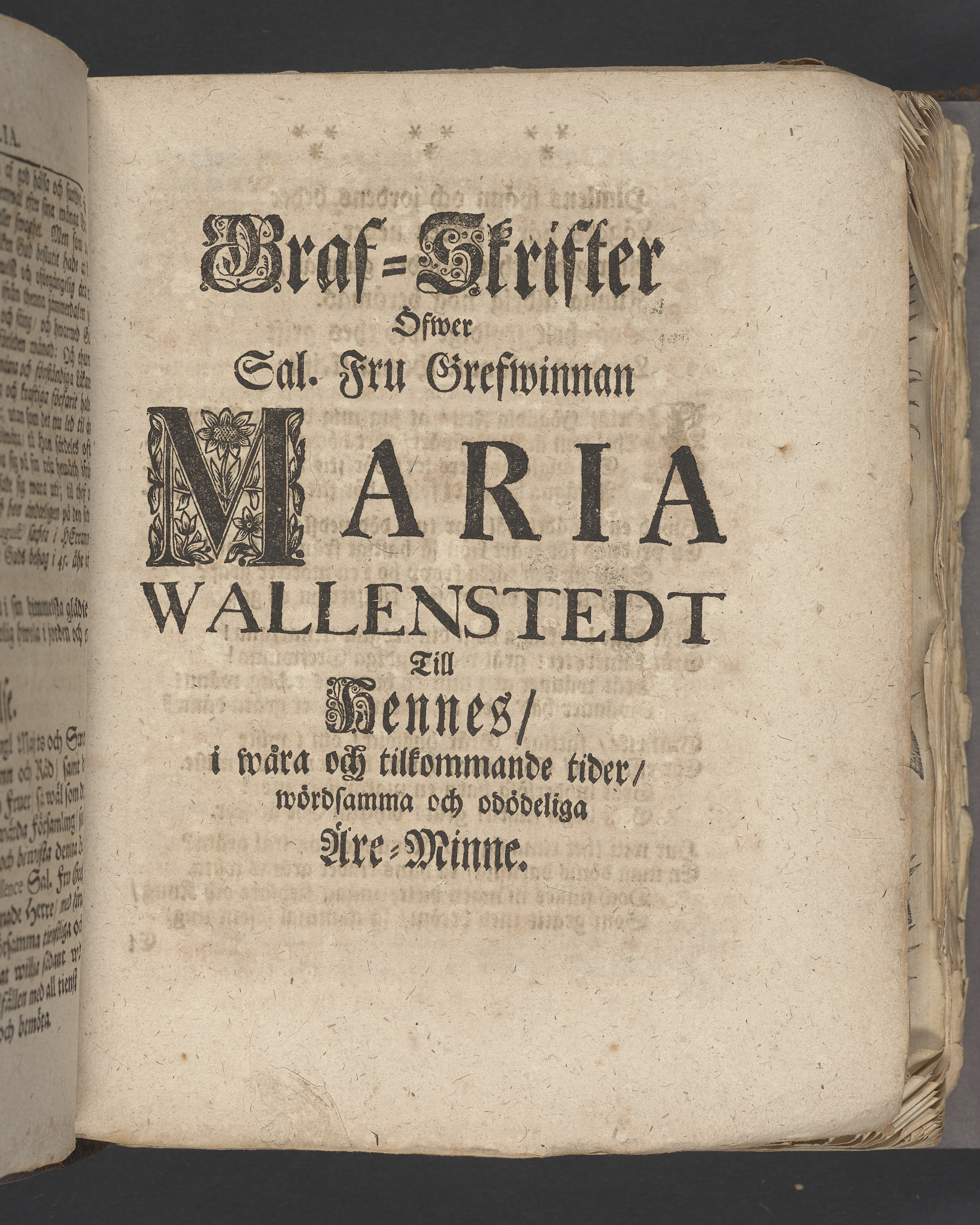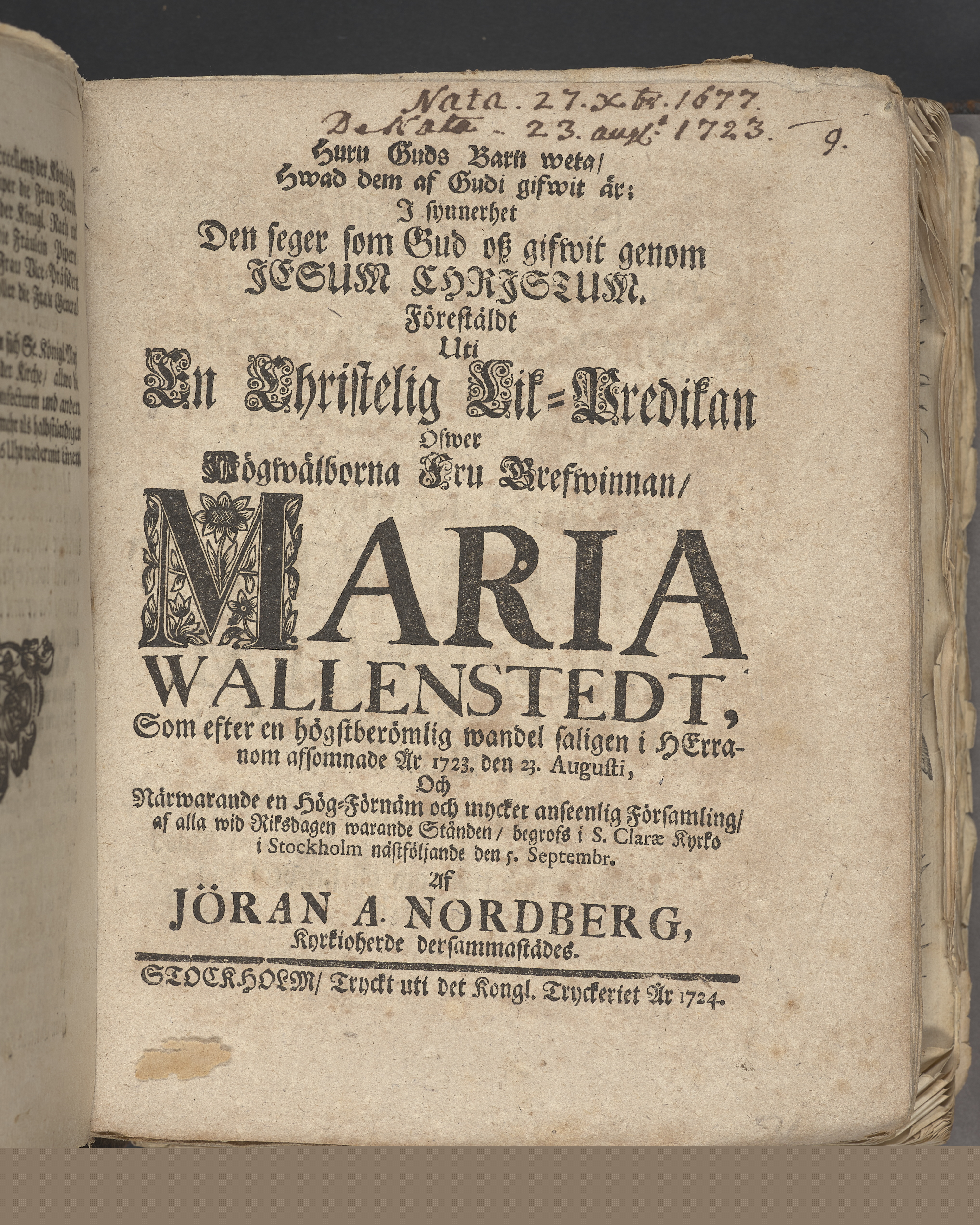 Huru Guds barn weta, hwad dem af Gudi gifwit är; i synnerhet den seger som Gud osz gifwit genom Jesum Christum. Förestäldt uti en christelig lik-predikan öfwer ... Maria Wallenstedt, som efter en högstberömlig wandel saligen i herranom afsomnade år 1723. den 23. augusti, och närwarande en hög-förnäm och mycket anseenlig församling, af alla wid riksdagen warande stånden, begrofs i S. Clarae kyrko i Stockholm nästföljande den 5. septembr. af Jöran A. Nordberg ... Stockholm, tryckt uti det kongl. tryckeriet år 1724.