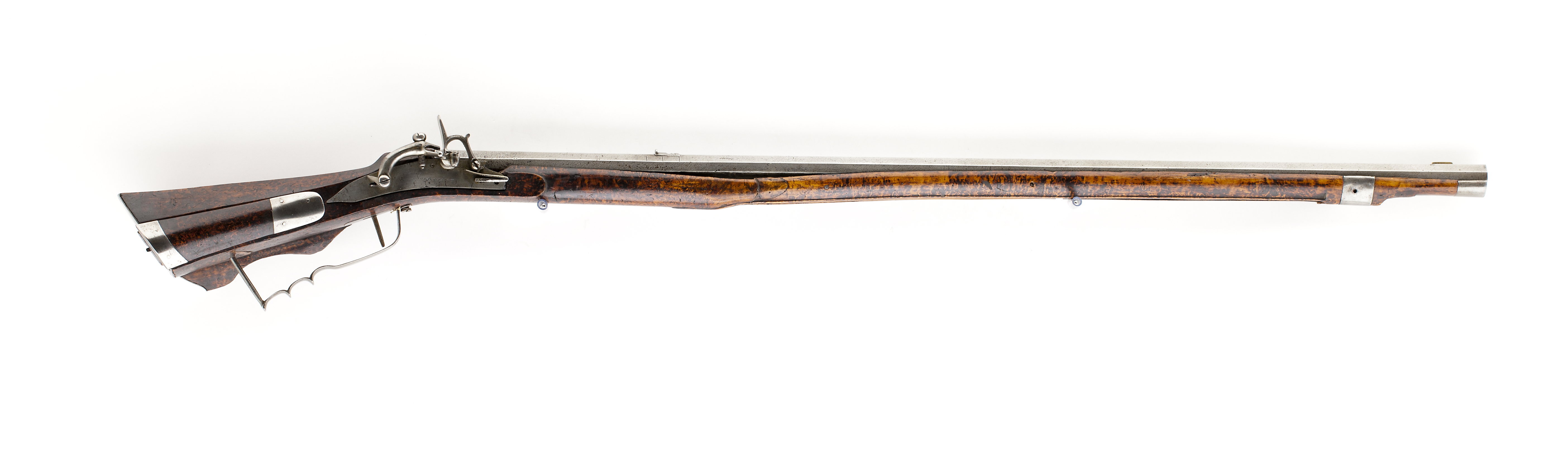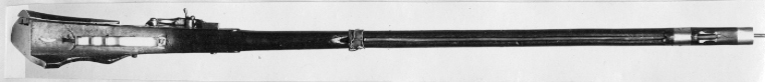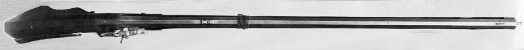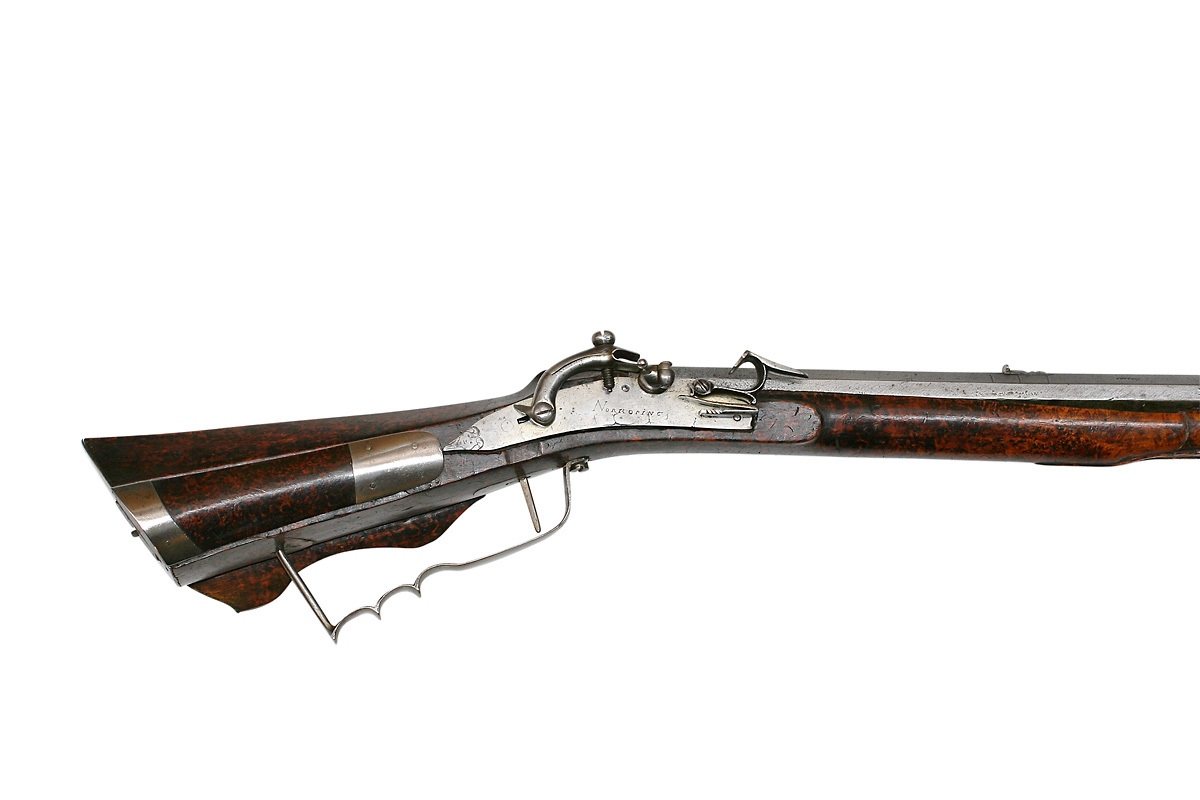 Snapplodbössa, lägglås, Sverige ca. 1650-1700, pipa av Per Gustafsson i Kassmyra, lås signerat Norrköping. Åttsidig, räfflad pipa av stål med svagt böjt, baktill tvärt avskuret svansskruvblad. På sidofaserna vid pipbasen stämplar: PG (Stöckelnr. 460). Riktmedel: Inlaxat ståndsikte på rektangulär fot med profilerad ovansida. Ifrån svansskruvbladet till siktet en infilad siktskåra. Långt stolpkorn av mässing. Fästning: Två häften. Pipan fäst med kryssskruv underifrån (varbygelskruven) samt ett, ursprungligen två, pipstift av stål. Sanpplås, lägglås av stål med plant låsbelck med graverat ansikte på bakspetsen. Framför hanen graverat: "NORRKOPING". Böjd rundad hane med spetsig fog, inlaxad överkäke, fyrsidiga käkar, graverat öga. Käkskruv med kulformigt huvud och x-skåra. Rundad fängpanna med vridlock med kulformigt grepp. Batteri med välvt fängpannelock, eldstål med rundad överdel, bågformig arm. Batterifjäder med delvis något fasade kanter, ingen studel, nederarmen kortare än den övre. Nöt utan studel. Helspänn på hanfoten. Fästning: Två låsskruvar. Rak avtryckare. Ovalt avtryckarbleck av stål. Helstock av masurbjörk triangulär kolv med kolvlåda och konturerad vinge med volut. Kolvlådelock av stockens trä. Beslag av stål. Slät bakplåt, ändbeslag på kolvlådelocket. Låsskruvbrickor i form av fyrbladiga blommor, den bakre med knoppar på varje blad. En bandformig rörka om framstocken, slätt näsband. Varbygel med 2 1/2 fingerläge, smal bakre stolpe inskruvad i kolven, framänden fäst med krysskruven. Tillbehör: Laddstock av ljusare trä, avbruten och fast i rännan.