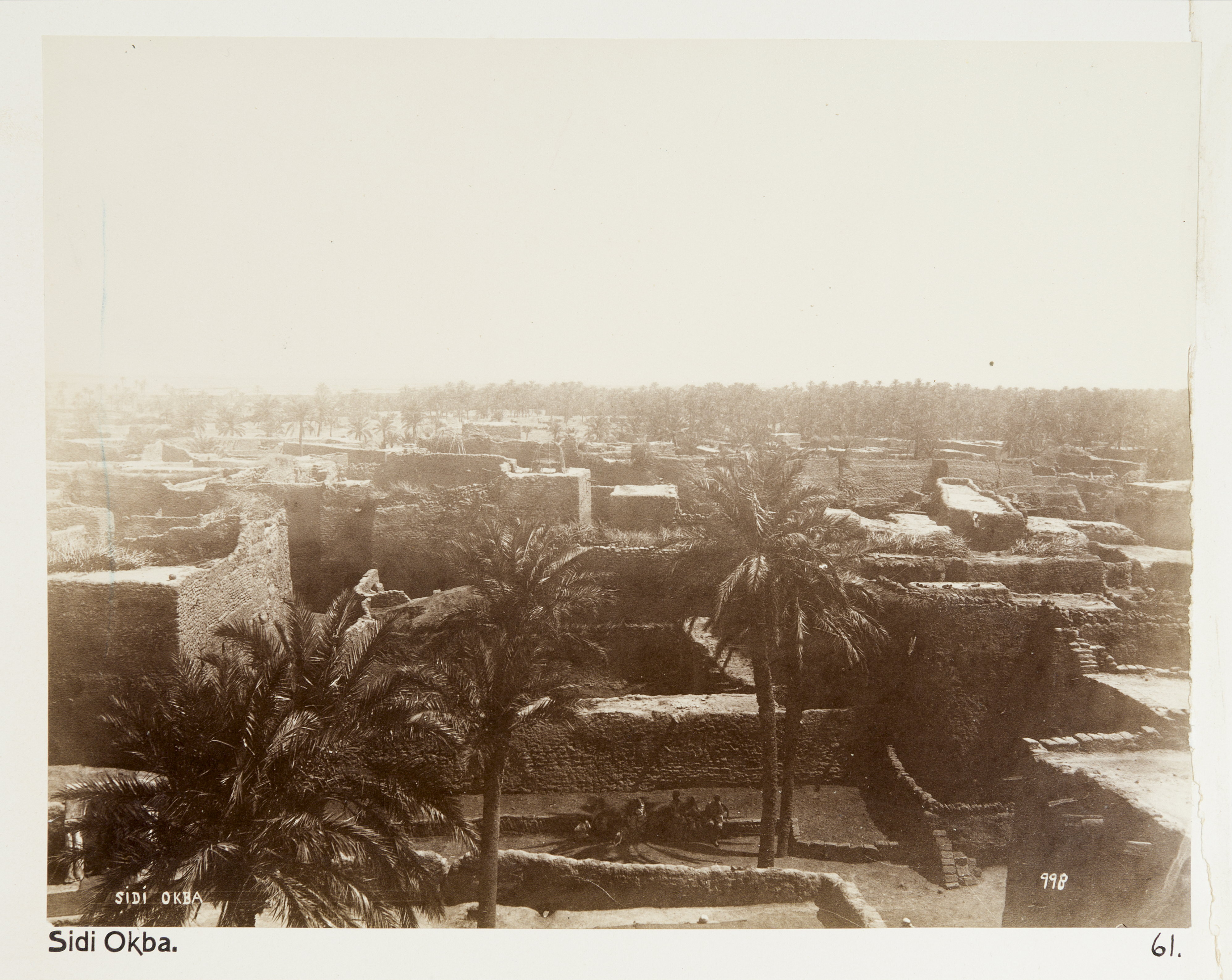 Sidi Okba, Algeriet. Bilden är en dubblett till LXVI:F.60. Bilderna med inventarienummer LXVI:K.H.01.-137. är inköpta av Johanna Kempe, f. Wallis, i Alger, Biskra, Tunis, Constantine, Oran och Blidah vid hennes vistelse i nämnda städer tillsammans med sin dotter och svärson, Wilhelmina och Walther von Hallwyl, dotterdottern Irma samt fröknarna Caroline Pflaum och Ida Uhse under deras resa genom Algeriet och Tunisien samt åter över Schweiz 11 februari - 19 maj 1889. Förestående uppgifter lämnade med ledning av fröken Ida Uhses Reseanteckningar. Vissa av bilderna är dubbletter till bilder i inventarienummerserien LXVI:F.01.-138. som köptes in av Wilhelmina von Hallwyl under samma resa.