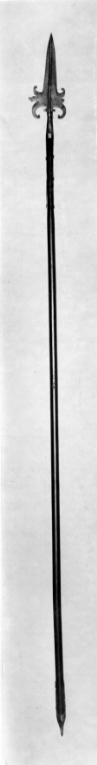 Klinga smal, jämnt avsmalnande, med markerad ryggås. Vingar med en mindre uppåtböjd och en större nedåtböjd volutformad spets. Mitt emellan dessa en vågad spets på ena sidan, på andra sidan ett hakformigt utskott. Vid klingbasen två små utskott. Ingen dekor. Balusterformad hals L:23 mm, som nästan omärkligt övergår i en åttsidig holk L: 56 mm. Ändarna av en tvärslå av stål sticker ut på var sida av holkens nedre del. Holken fäst vid skaftet med stålskenor L: 208 mm. Skaft av brunbetsat trä med spetsig doppsko 63 mm nedtill, som är fäst vid skaftet medelst 97 mm långa skenor.