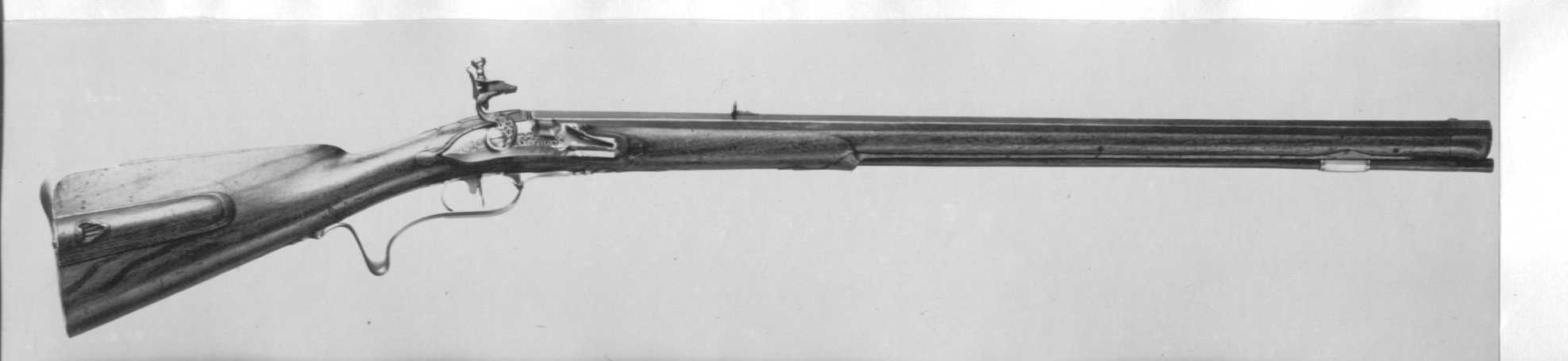 Åttsidig, blånerad, åttaräfflad pipa. På de tre övre sidorna vid pipbasen en försänkt pärlstav i relief, över skarven pipa svansskruvblad, inslaget en spira. Oblånerad svansskruv, svagt böjt rektangulärt svansskruvblad. Riktmedel: Inlaxade riktmedel, ståndsikte av blånerat stål med stor u-formig skärm, spolformigt korn av mässing. På båda sidor om siktet samt bakom kornet dubbla linjer på pipans översida. Fästning: Tre häften. Pipan fäst med krysskruv, bakre låsskruven genom svansskruvplattan samt tre pipstift av stål. Flintlås med plant låsbleck, brett fasade kanter. Graverad signatur på mittfasen, bakom hanen trofégrupp, framför hanen signatur i relief mot mörkpunsad bakgrund: "Gerhard", på nederfasen därnedanför: "STOCKHOLM". S-formig, platt hane med fasade kanter, rankdekor i relief mot mörkpunsad bakgrund. Fasetterade, kantiga käkar, käkskruv med päronformigt huvud. Fasetterad fängpanna med bred fals. Batteriet saknas, batterifjäder med delvis fasade kanter, kägelformigt fjäderlöv. Låset invändigt fint polerat. Fästning: Två låsskruvar. Rak avtryckare. Helstock av valnöt (?) med målade (?) mörka strimmor på kolven. Fransk kolv med kindstöd och kolvlåda. Snidad dekor vid kindstödets framände, vid svansskruvbladet, varbygeln och laddstocksrännans ände, på kolvlådelocket kantlist och snäckformigt fingergrepp. Beslag av stål. Bakplåt med bred, konturerad flik på kolvryggen, graverad kantlinje, två skruvar. Ändbeslag på kolvlådelocket, två skruvar. Sidbleck i form av plant rankverk med fasade kanter, två ovala välvda medaljonger. En kantig rörka. Näsband av horn. Rektangulärt avtryckarbleck med bredare del vid avtryckarhålet. Varbygel med plan bygel och fasade kanter, platt främre arm med fasade kanter, avslutning i form av urna med treflikigt blad. Fri, pungformigt nedsvängd bakre arm med avslutning i form av treflikigt blad. Tillbehör: Laddstock av trä, L: 786 mm, framtill hornskoning, L: 32 mm