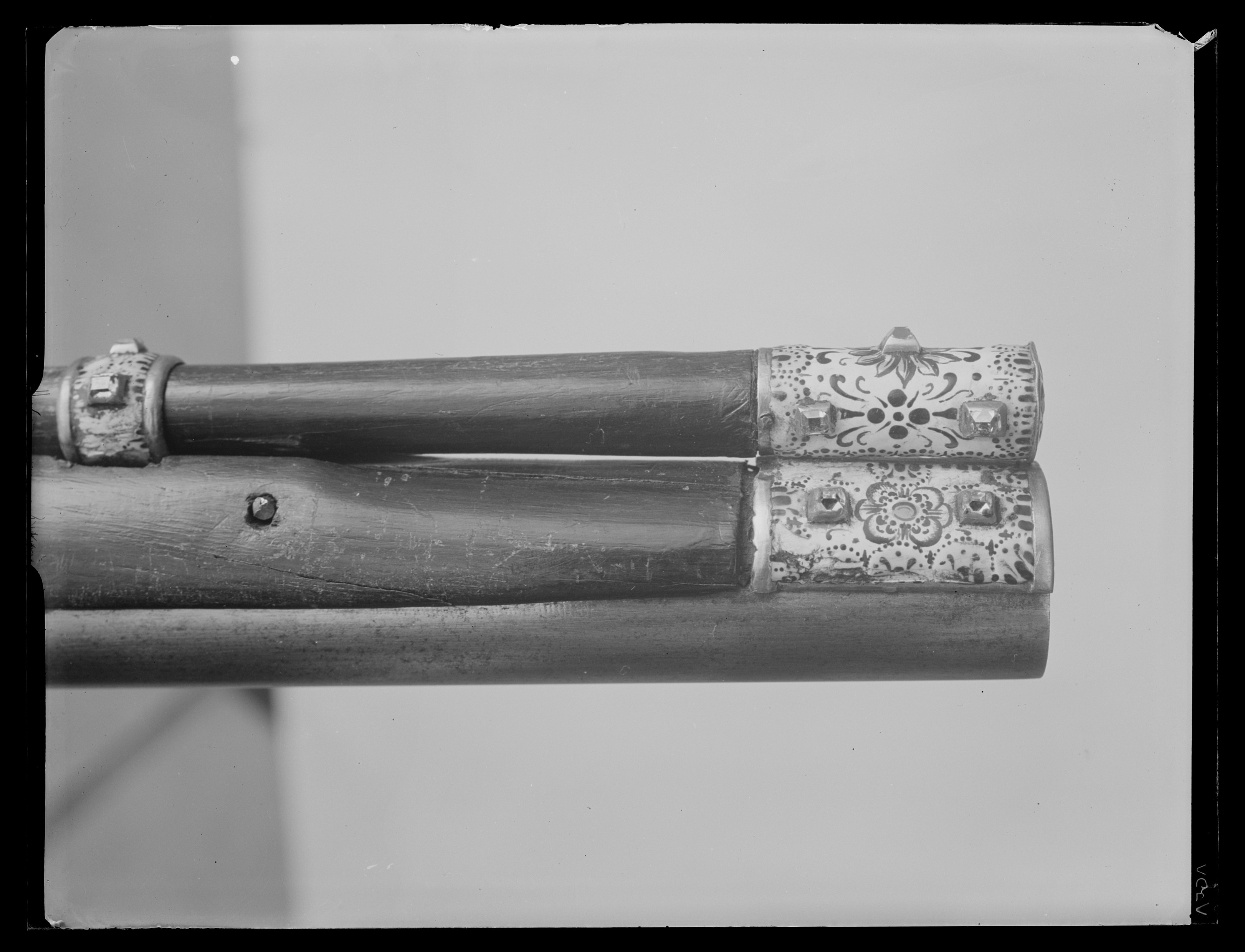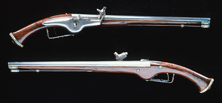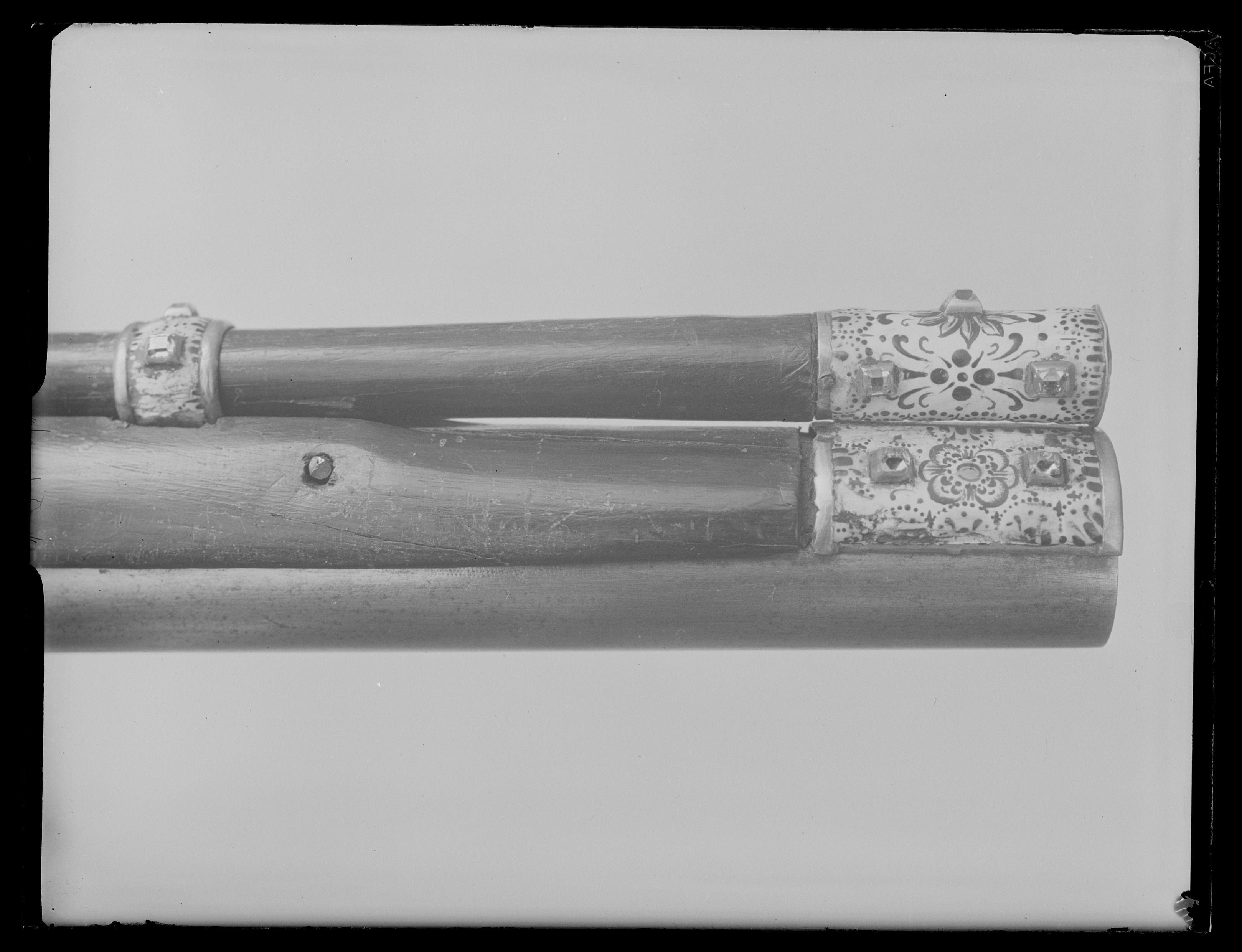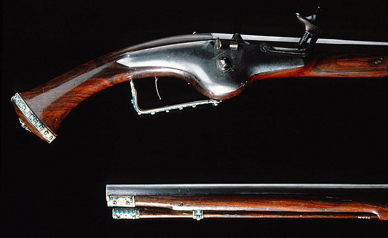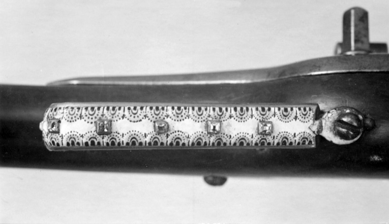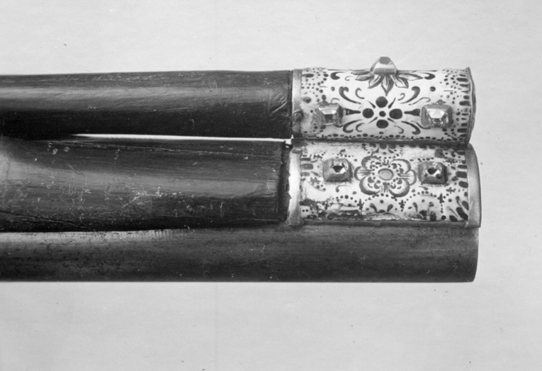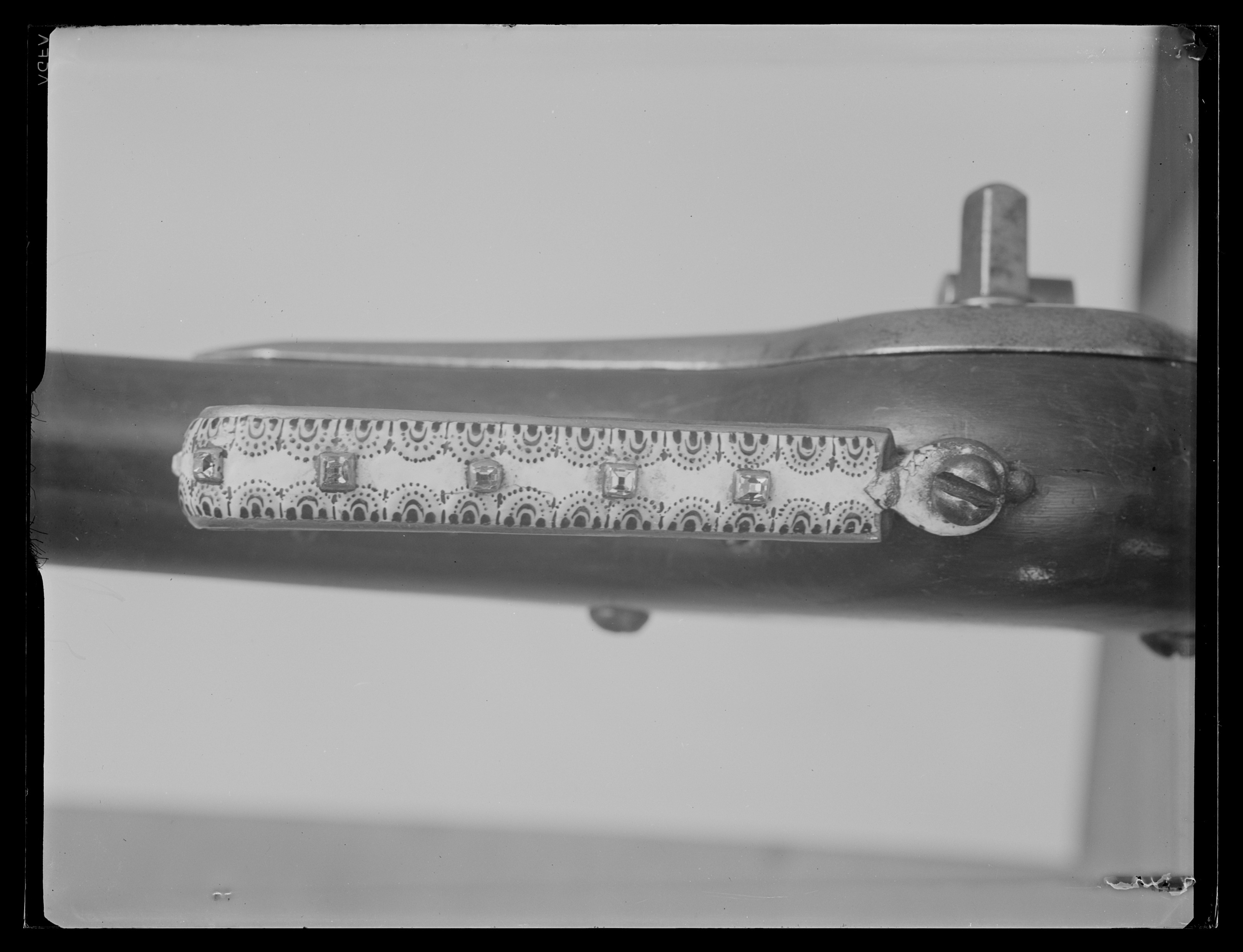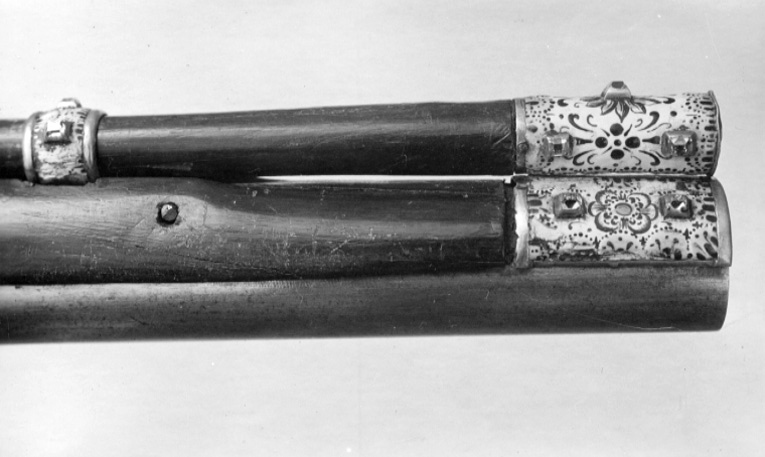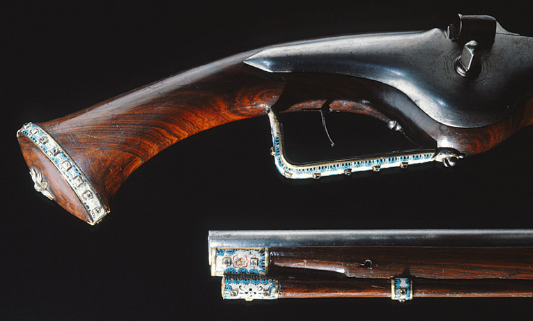Rund, vid kammaren åttsidig, slätborrad pipa, stämplad på kammarens ovansida I I C och krönt huvud (Stöckel nr 3383). Rektangulärt svansskruvblad, avbrutet vid krysskruven. På pipbasen två linjer på sidofaserna, likaså längst bak på svansskruvbladet. På pipans undersida stämpel: C M L C (jfr Stöckelnr2134). Fästning: Två häften. Pipan fäst med krysskruv underifrån. Hjullås med invändigt hjul. Välvt låsbleck av nederländsk typ, l: 175 mm, nedsvängt vid hjulet, bakänden spetsig. Fyrsidig hjulaxel med blånerad, rund bricka, däromkring en graverad, sexbladig, stiliserad ros. Hane i flykt med låsblecket, fyrsidig kropp, övre främre kanten rundad. Vinkelböjd, fyrsidig hals, en kant rundad. Fyrsidiga, rundade käkar, underkäken lös och blånerad, käkskruv med fyrsidigt huvud. Vid hanaxeln graverat en stiliserad, sexbladig ros. Blånerad, fyrsidig fängpanna med rundad nedre framkant, låg, rak krutskärm. Fyrsidigt fängpannelock med rörlig arm, kort, kraftigt konturerat fingergrepp. Invändiga slag- och hanfjädrar. Fästning: Två låsskruvar. Svagt böjd avtryckare med vulstformig ände. Helstock av jakaranda (blodträ?), fransk-holländsk typ, spetsoval kolvände. Beslag av stål samt emaljerat guld, besatt med diamanter, emaljen vit och ljusblå med detaljer i svart, röd och något gul emalj. På kolvänden en åttabladig, emaljerad guldblomma, runt kolvänden ett emaljerat guldband, b: 7 mm. En rörka samt näsband av emaljerat guld. Rak varbygel av stål, baktill böjd i rät vinkel, bakänden inskruvad i kolven. Varbygeln täckt med en emaljerad guldplåt, fäst med fyra guldnitar, framtill utdragen i ring för fästning med skruv. Beslagen dekorerade med taffelslipade diamanter av olika höjd, b: ca 2,7 mm,kistfattningar av guld, på blomman på kolvänden en sten, på bandet 16 fattningar (2 stenar på vardera sidan saknas), på varbygeln 6, på rörkan 3 och på näsbandet 4 stenar.