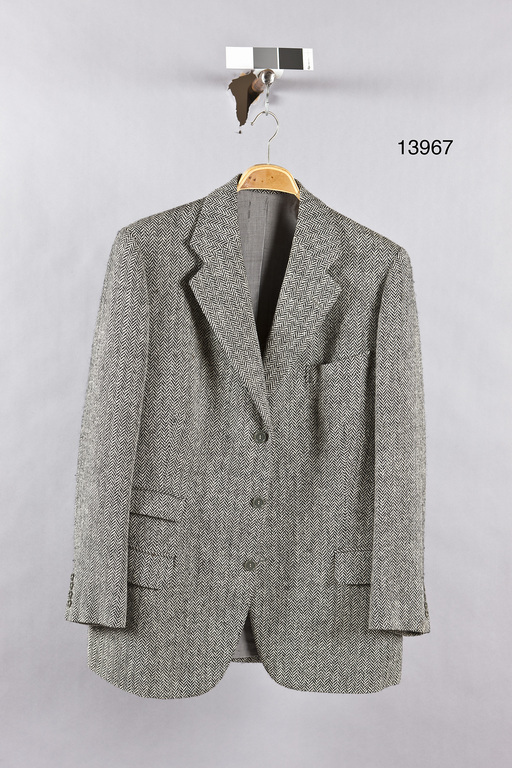 Kavaj av fiskbensmönstrat svart-vit ylle. Fällkrage med slag. I vänster slag ett knapphål. Enkelknäppt med tre grå plastknappar, diam: 19 mm. På båda framstyckena en ficka med lock, samt på höger framstycke dessutom en mindre ficka med lock. Isydda ärmar med nedtill ett sprund, L: 80 mm, vilket knäppes med fyra små grå plastknappar, diam: 13 mm. Foder av grått siden. I ärmarna vitt siden. I båda sidor innerfickor av grå bomull. I höger ficka tillverkaretikett: "AB. NORDISKA KOMPANIET // STOCKHOLM // No.4501 29.5.56 // H.M. Konung // Gustaf VI Adolf." L rygg: 810 mm, br.rygg: 460 mm, L fram: 830mm, midja: 1040 mm, L ärm: 640 mm.