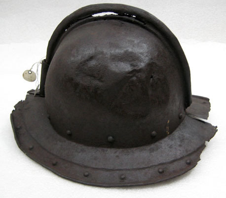 Av driven stålplåt, kraftigt korroderad med stora skador. Bestående av två halvor sammanfogade i en längsgående kam med omvikt, förstärkt kant. Rundad klocka, nertill med nitar i rad. Runtom löpande nedsvängt brätte med försänkt bård, uppdrivna nitar och invikt rundsmidd kant. Baktill plymhållare, H 61 mm, nedåt avsmalnande med tre hål. På insidan fyrsidiga nitbrickor, vid öronen med rester av läder.
