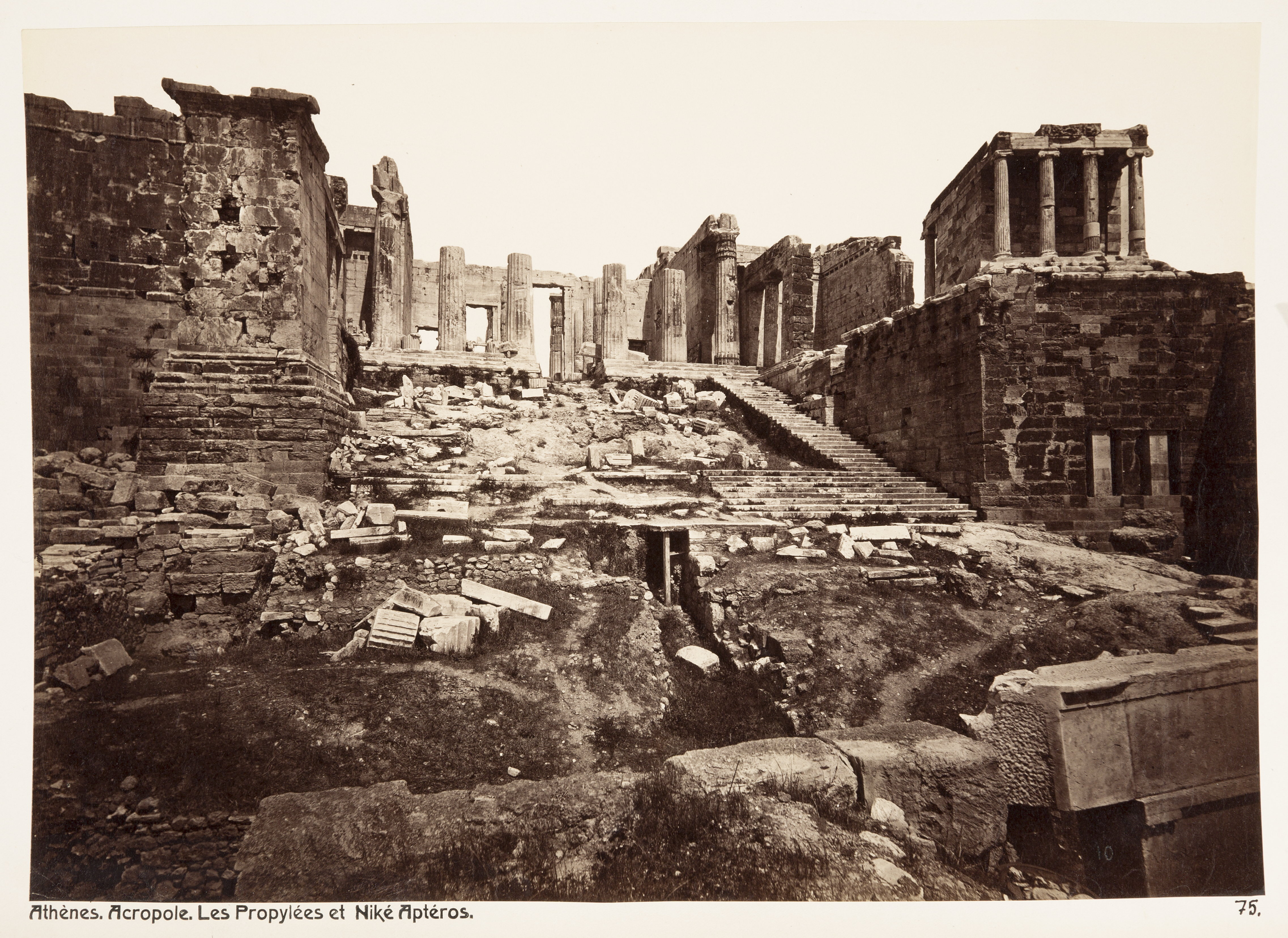 Propyléerna och Athena Niketemplet på Akropolis i Aten. Text på originalet: "Athènes. Acropole: Les Propylées et Niké Aptéros." Foto från resa genom Grekland, Makedonien och Serbien, 15 mars-6 juni 1896. Fotografierna LXVI:K.18.-147. är köpta av Wilhelmina von Hallwyl, f. Kempe på Korfu samt i Patras, Nafplion, Aten, Thessaloniki och Belgrad. Med på resan var maken Walther von Hallwyl och fröken Ida Uhse. Uppgifterna kommer från Ida Uhses reseanteckningar.