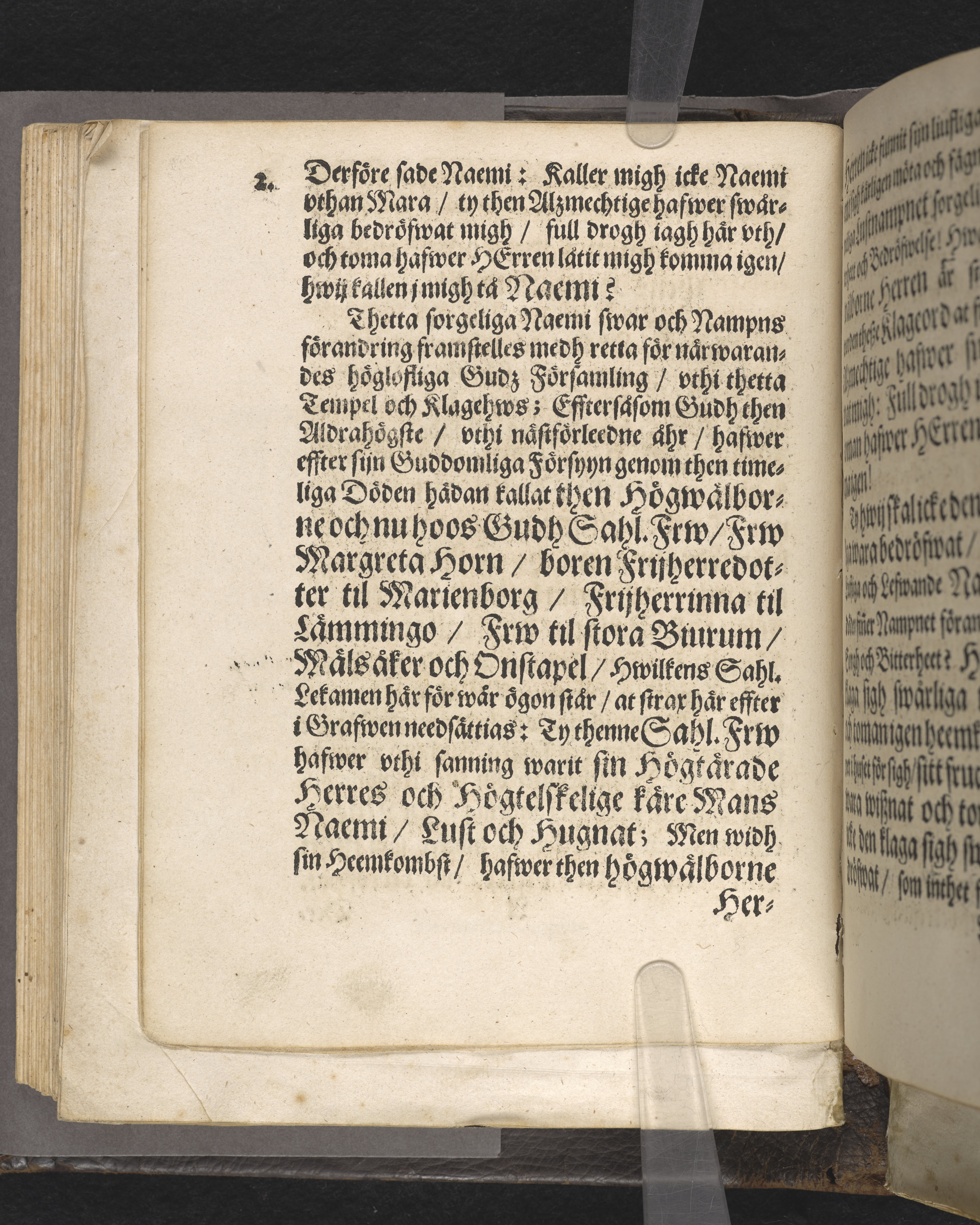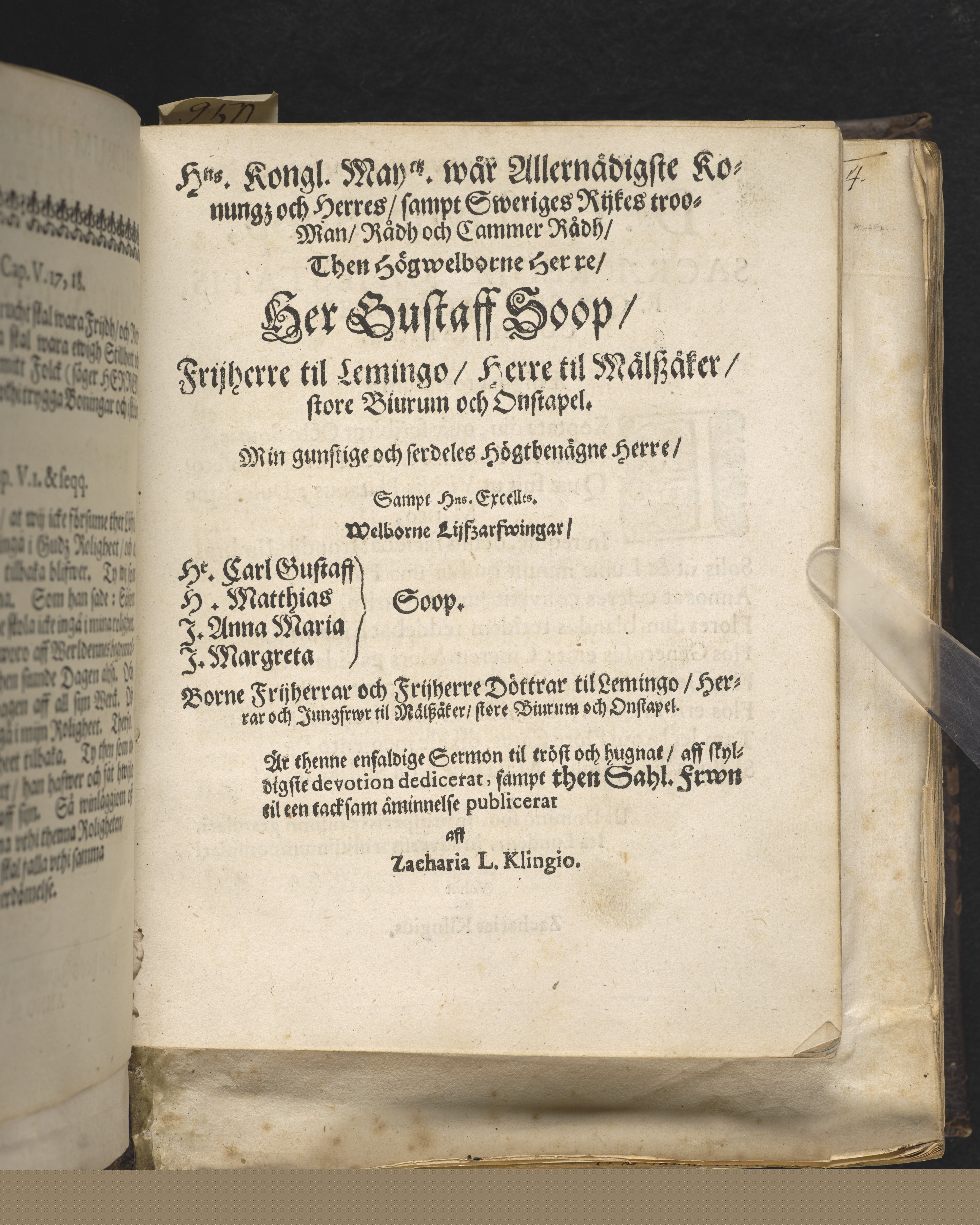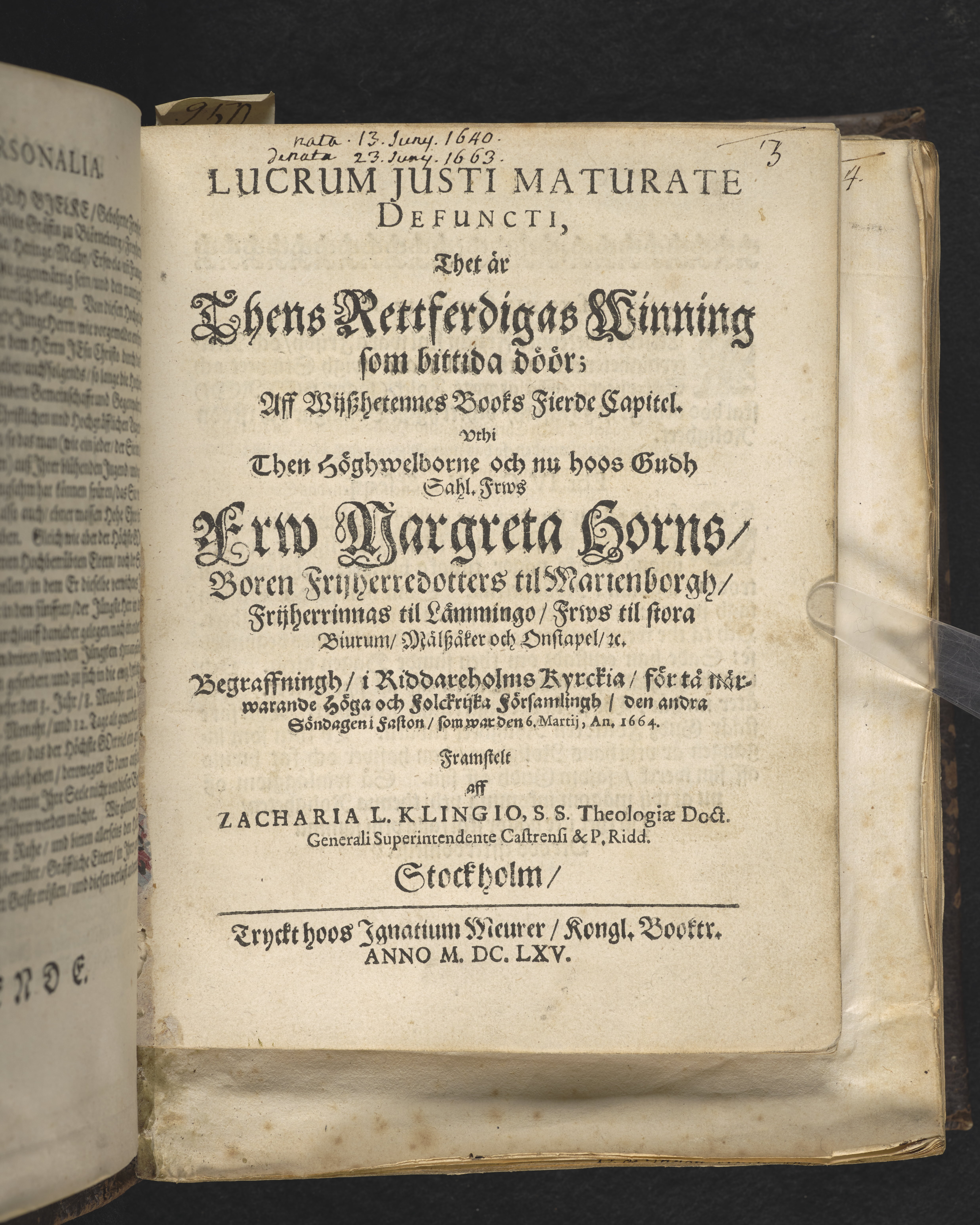 Lucrum justi maturate defuncti, thet är thens rettferdigas winning som bittida döör ... Vthi then högwelbornde och nu hoos Gudh sahl. Frws Frw Margareta Horns, boren frijherredotters til Martenborgh ... begraffning i Riddarholms kyrckia, för tå närwarande höga och folckrijka församlingh, den andra söndagen i faston, som war den 6. Martij, an 1664. Framstelt aff Zacharia L. Klingo ... Stockholm, tryckt hoos Ignatium Meurer, kongl. booktr. anno MDCLXV.