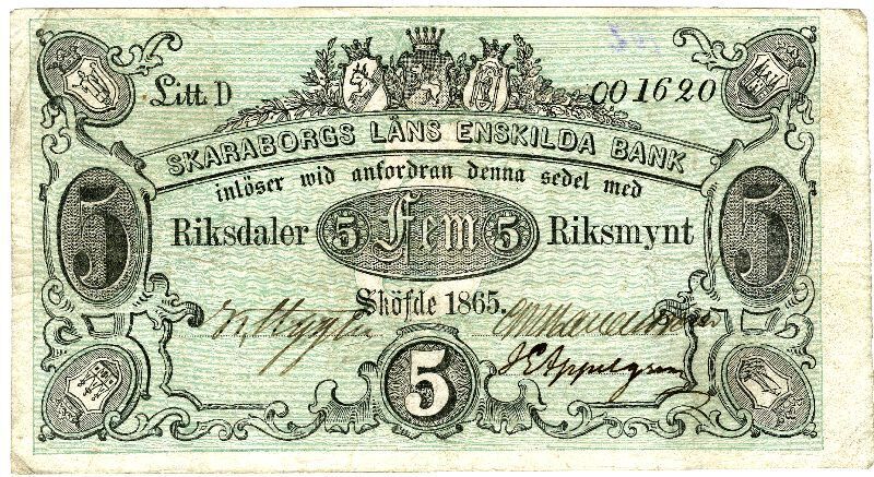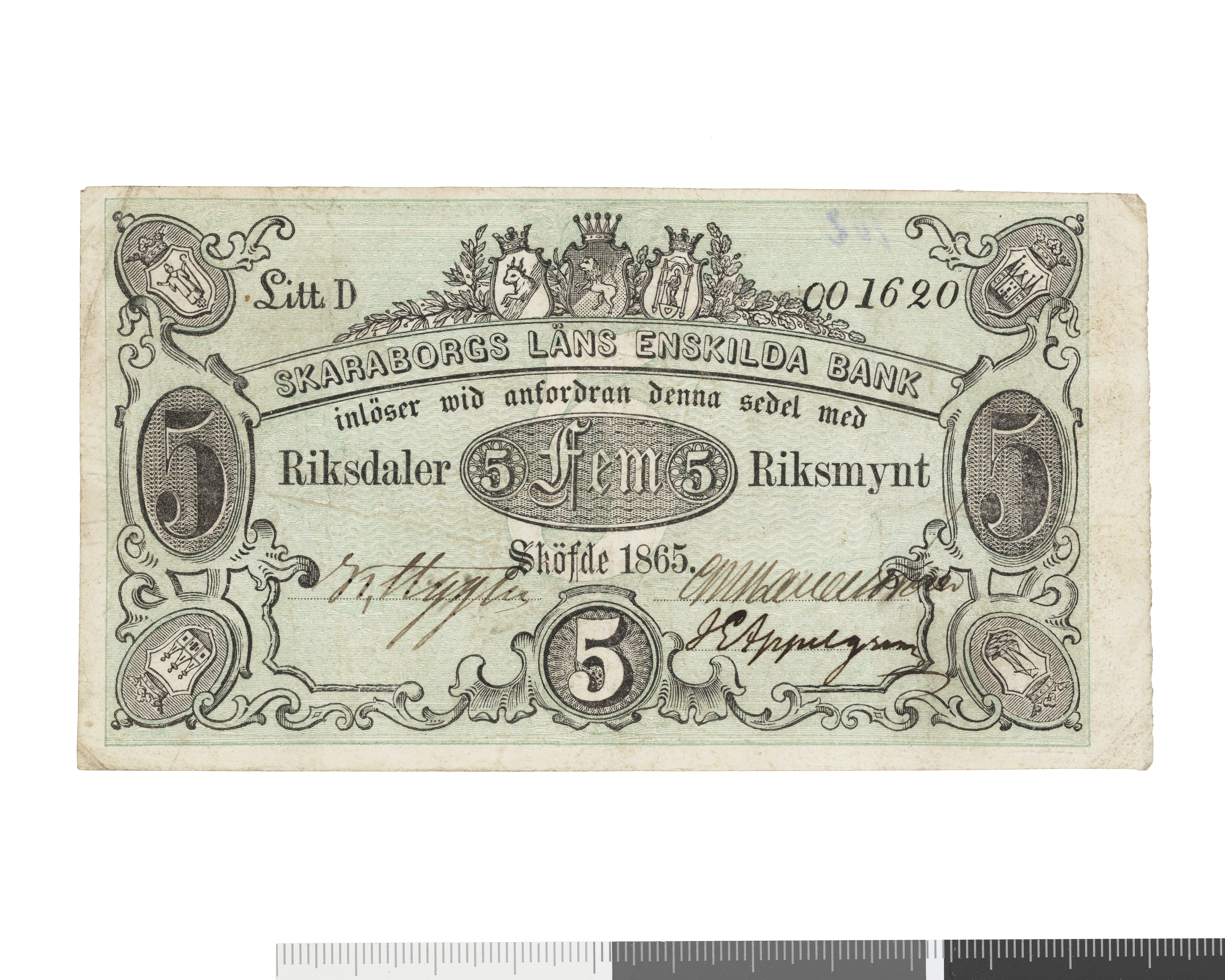 Upphov: Skaraborgs Läns Enskilda Bank. Media: Bonnevier, Helena. Ekonomiska museet - Kungliga myntkabinettet/SHM, (PDM) Upphovsrätten till detta verk har gått ut och är därmed fritt att använda på alla sätt. Ange gärna upphovsperson om denne är känd.
