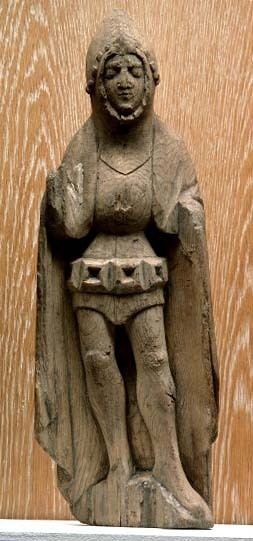 Kondition: underarmarna bortbrutna och med dem eventuella attribut, höger fot och del av fotplattan förlorade. Färg: endast obetydliga fragment.