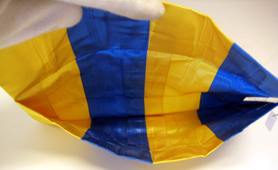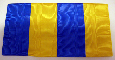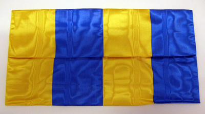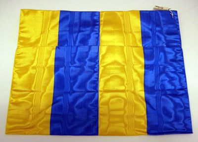 Väska med övervikt lockflik, helt av sidenmoaré/sidenrips?, randat blått-gult-blått-gult, (två ihopsydda band) randb: 60 mm, de yttre ränderna 58 mm. Väskan ligger i ett pergamentsfodral med en rosa blomsterkrans målad kring ett krönt V samt skrift i guld: "Den 7 augusti 1922."