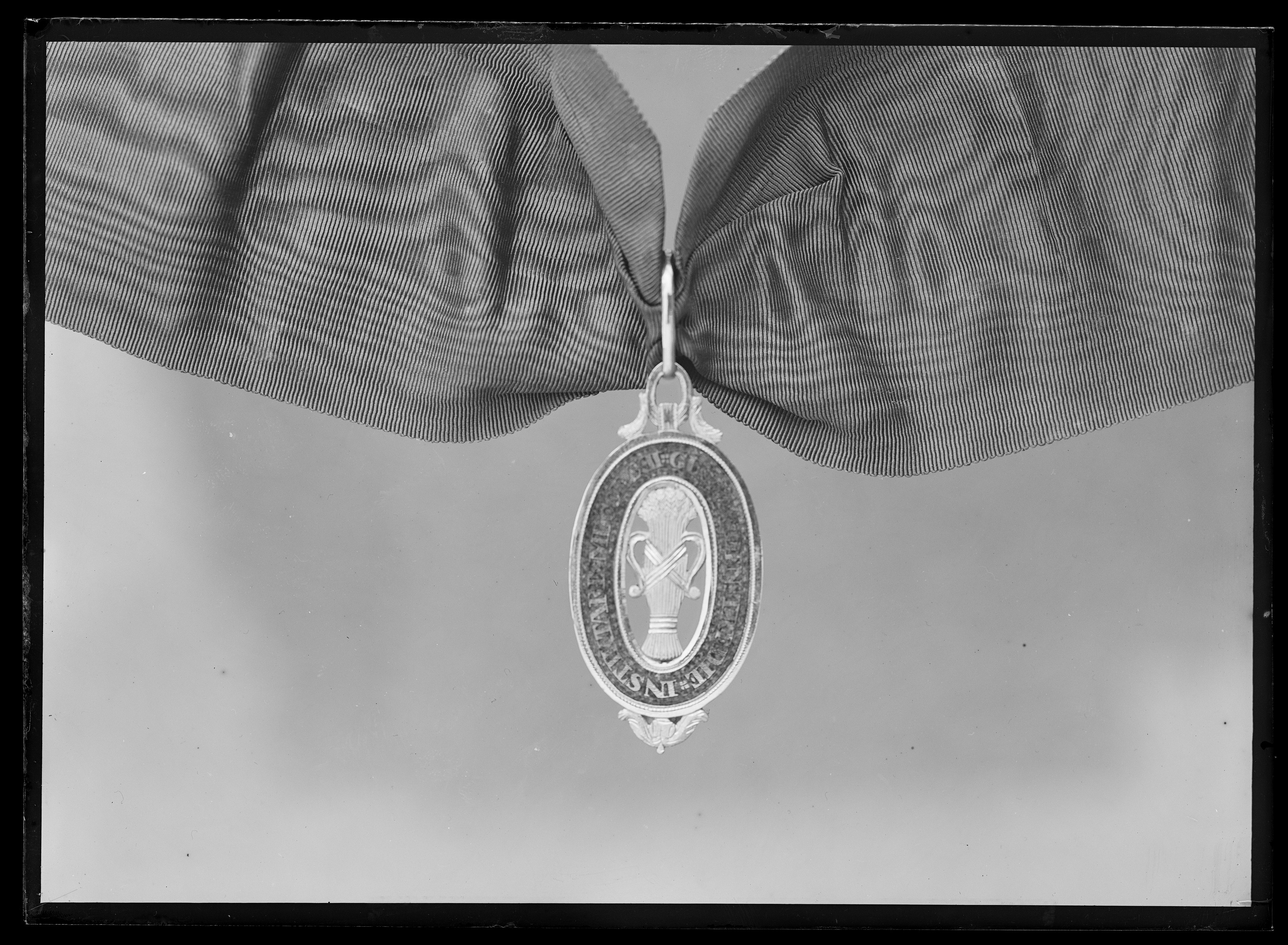 Dubbelsidigt tecken med guldvase, omgiven av ovalt, rödemaljerat guldband med guldtext: "GUSTAF DEN TREDIE INSTIKTARE MDCCLXXII". I ovalens nederkant bladornament, i överkanten oval guldring, flankerade av nedhängande blad. I ringen fäst päronformig, öppen bandring av guld.