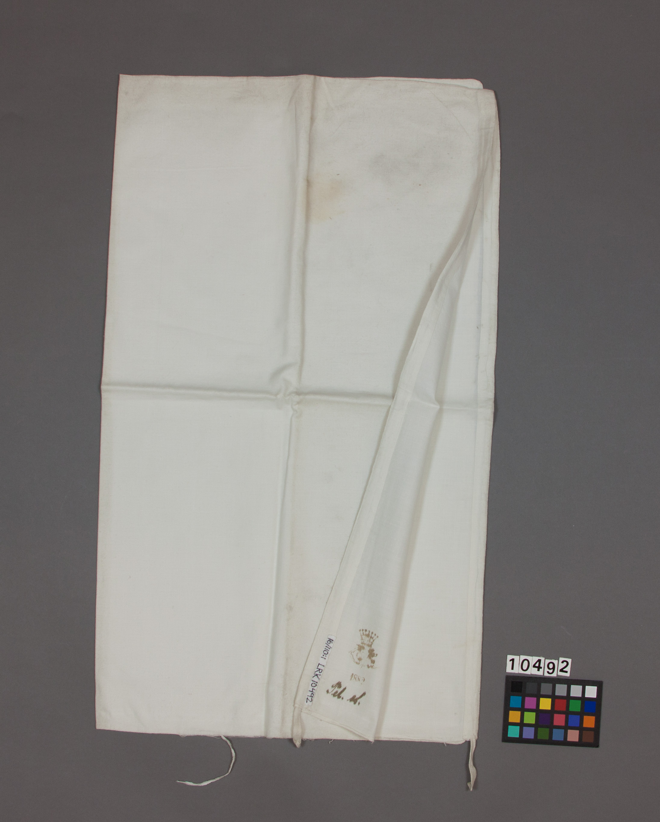Plagg ingående i en korg med babykläder som använts av Sofia och Oskar (II):s barn. Lakan av bomull, dubbelvikt med maskinsydda sömmar. Ena kortsidan öppen och ett stycke av ena långsidan. Den öppna kortsidan försedd med dragsko, bomullsband. I ett hörn märkning med märkbläck: "G V" under hertigkrona (kronprinskrona?), "1882", "Pel.sl".
