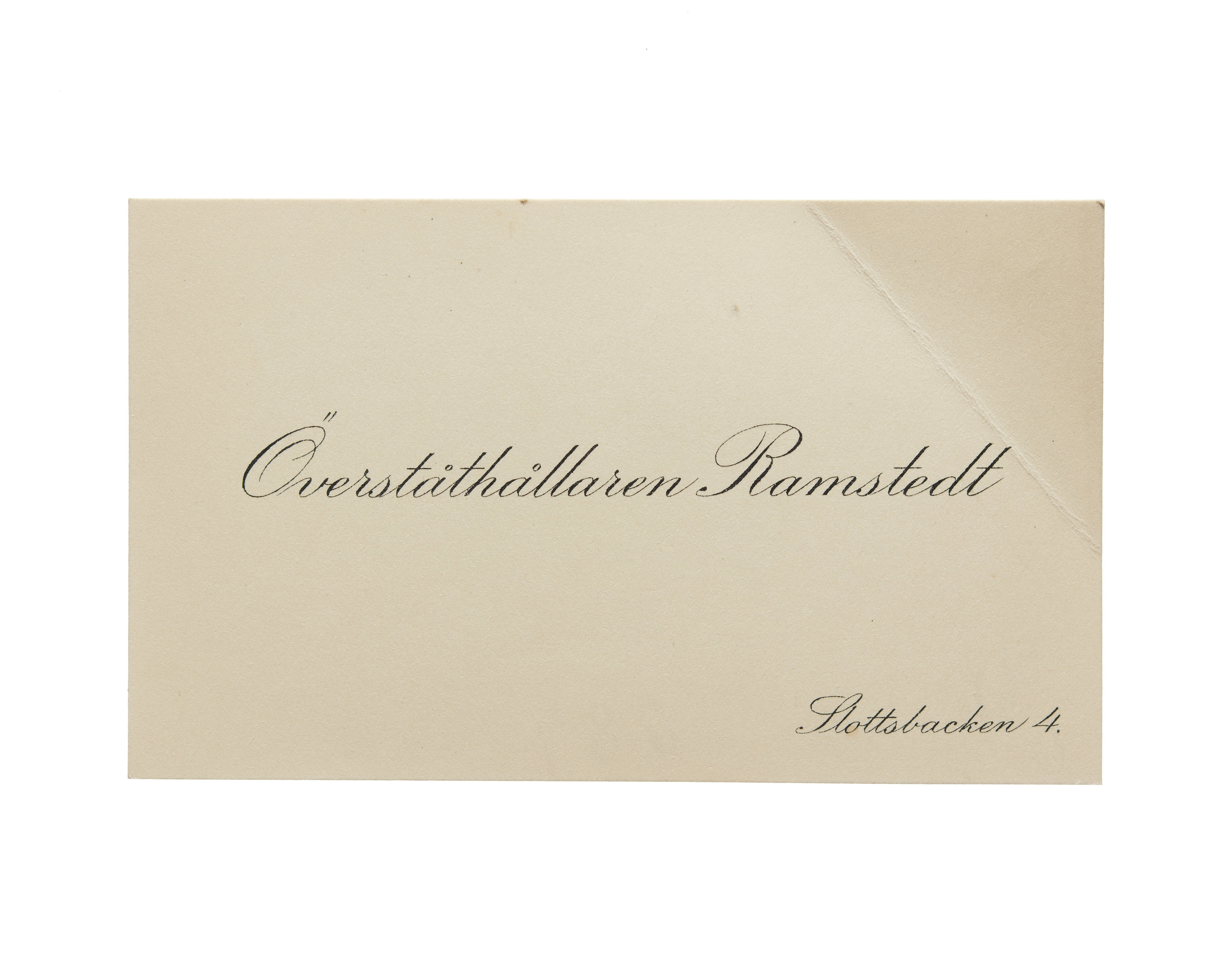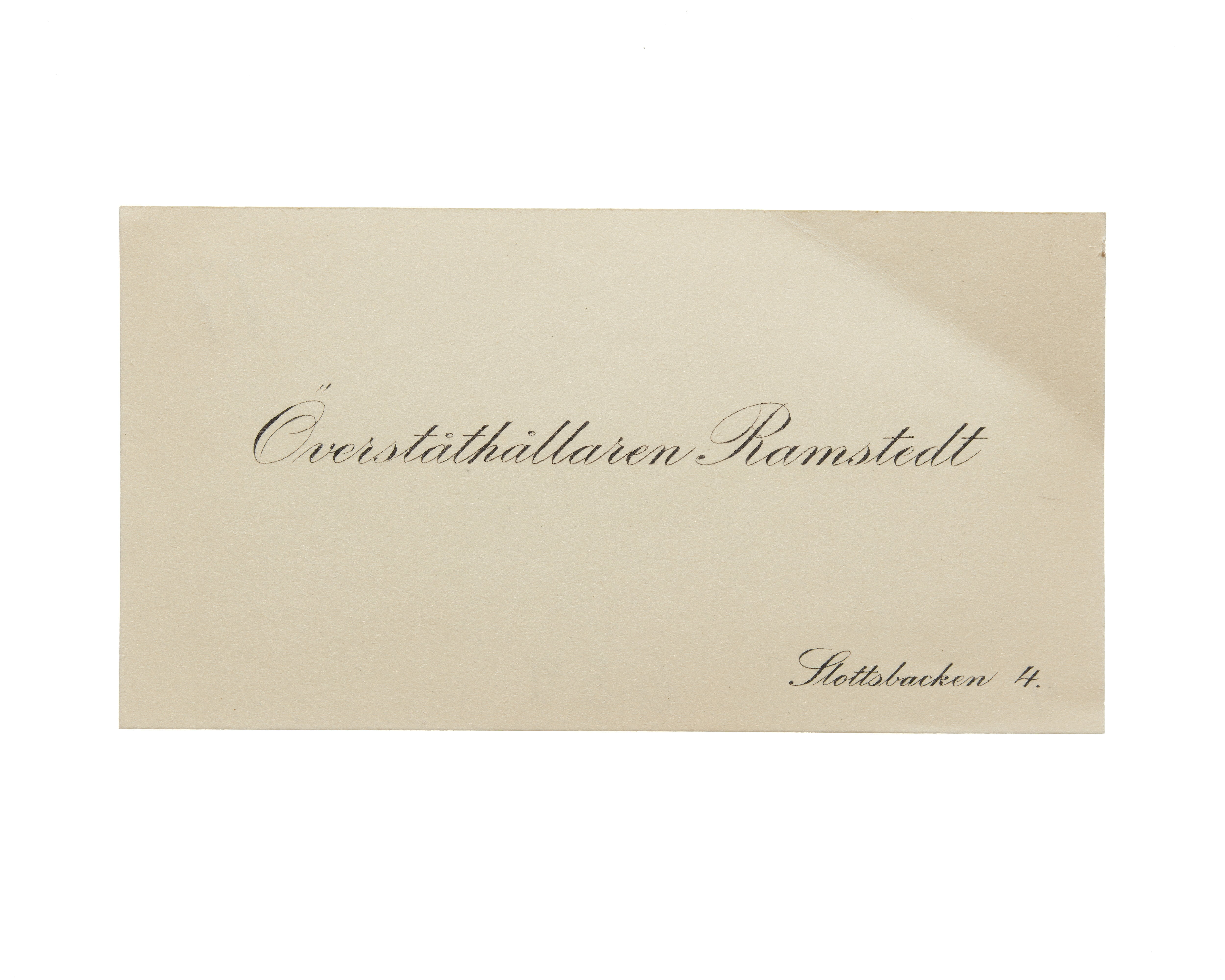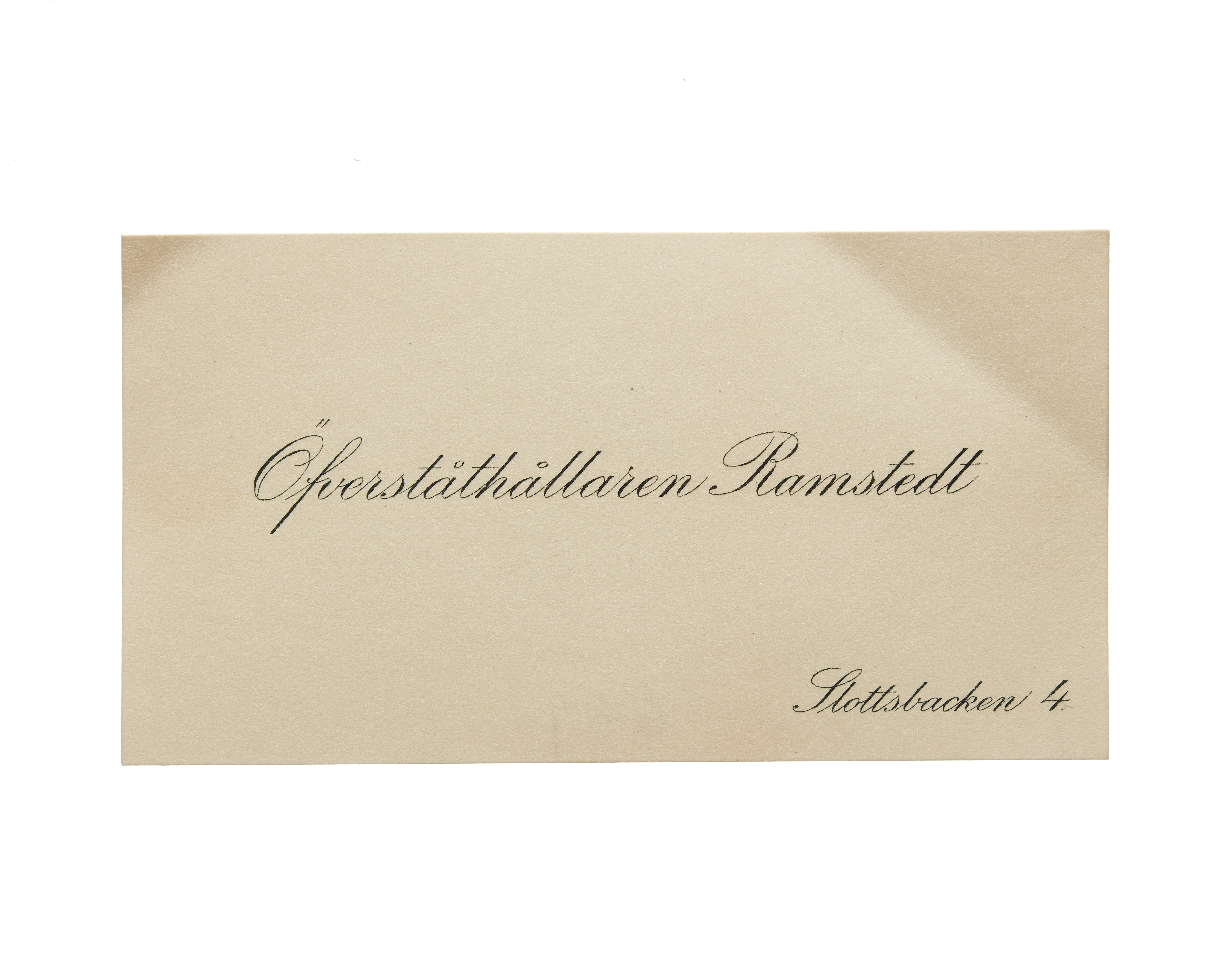 Sex visitkort från Överståthållare Johan Olof Ramstedt. Första kortet är utan datum, vikt i övre högra hörnet. Adress (nedre högra hörnet) Slottsbacken 4. Andra kortet daterat 1914, vikt i övre högra hörnet. Tredje kortet daterat 1916, vikt i övre högra hörnet. Fjärde kortet daterat 1917, vikt i övre högra hörnet. Femte kortet daterat 1918, vikt i övre högra hörnet. Sjätte kortet daterat 1919, vikt i övre högra hörnet.