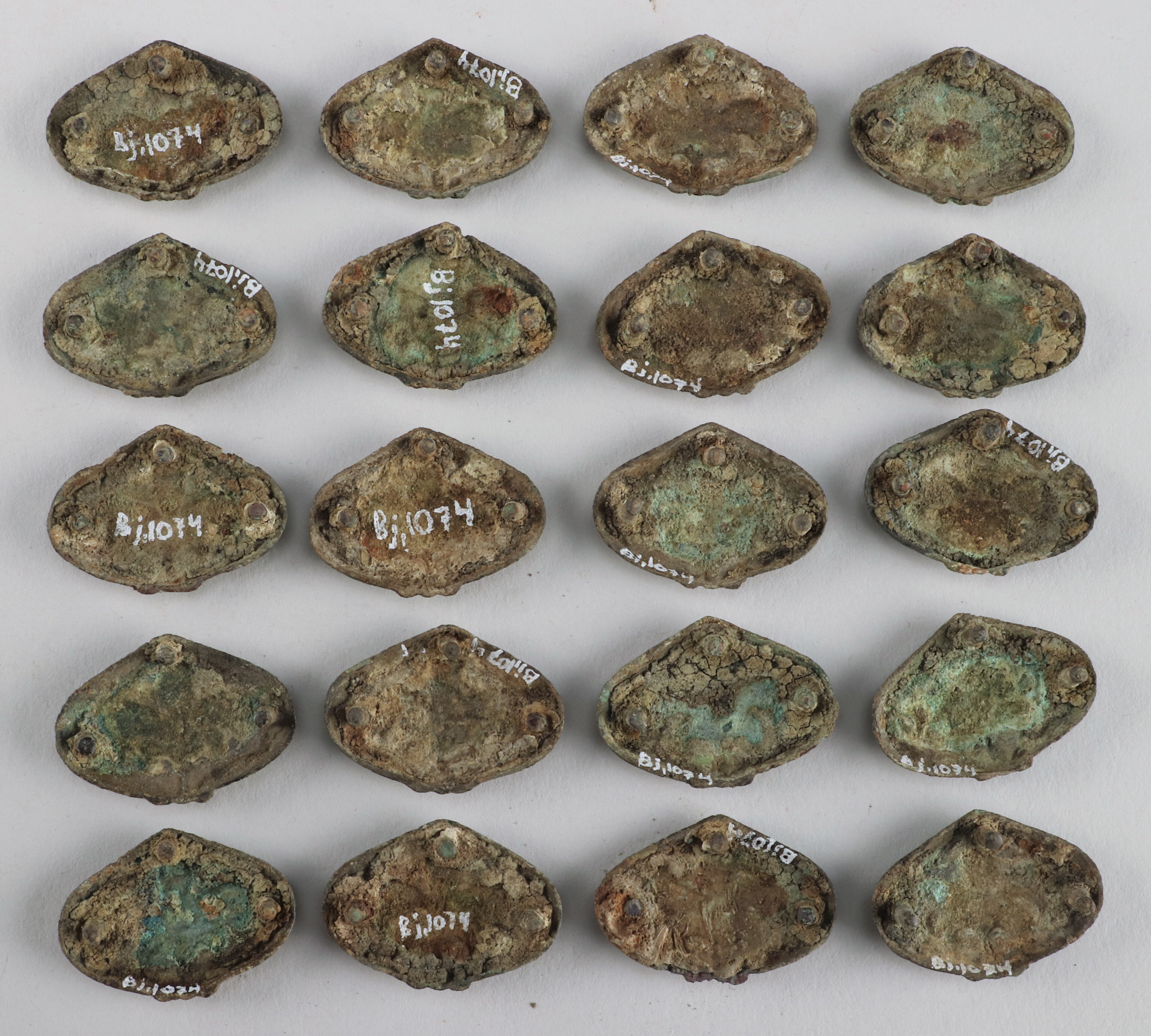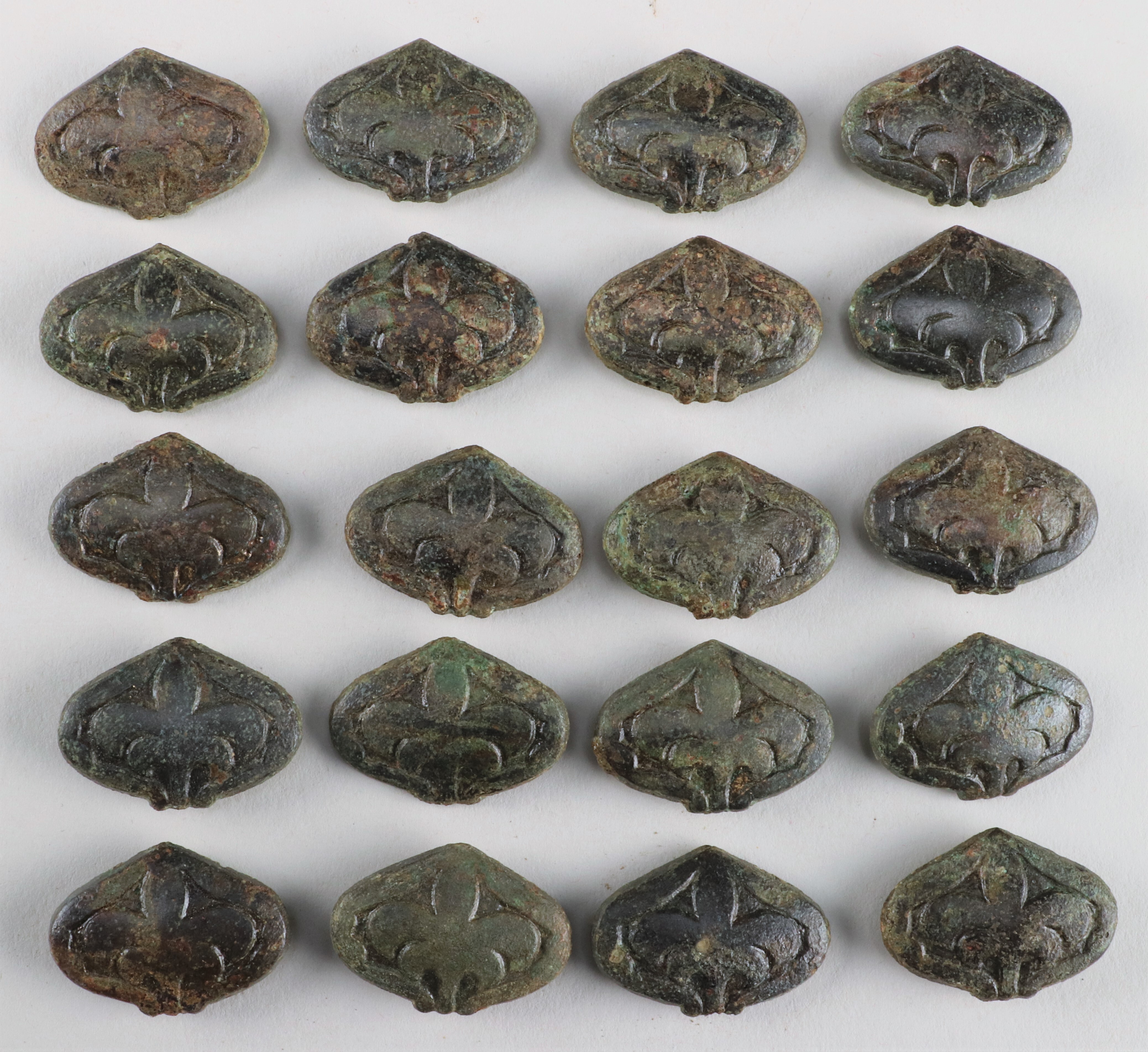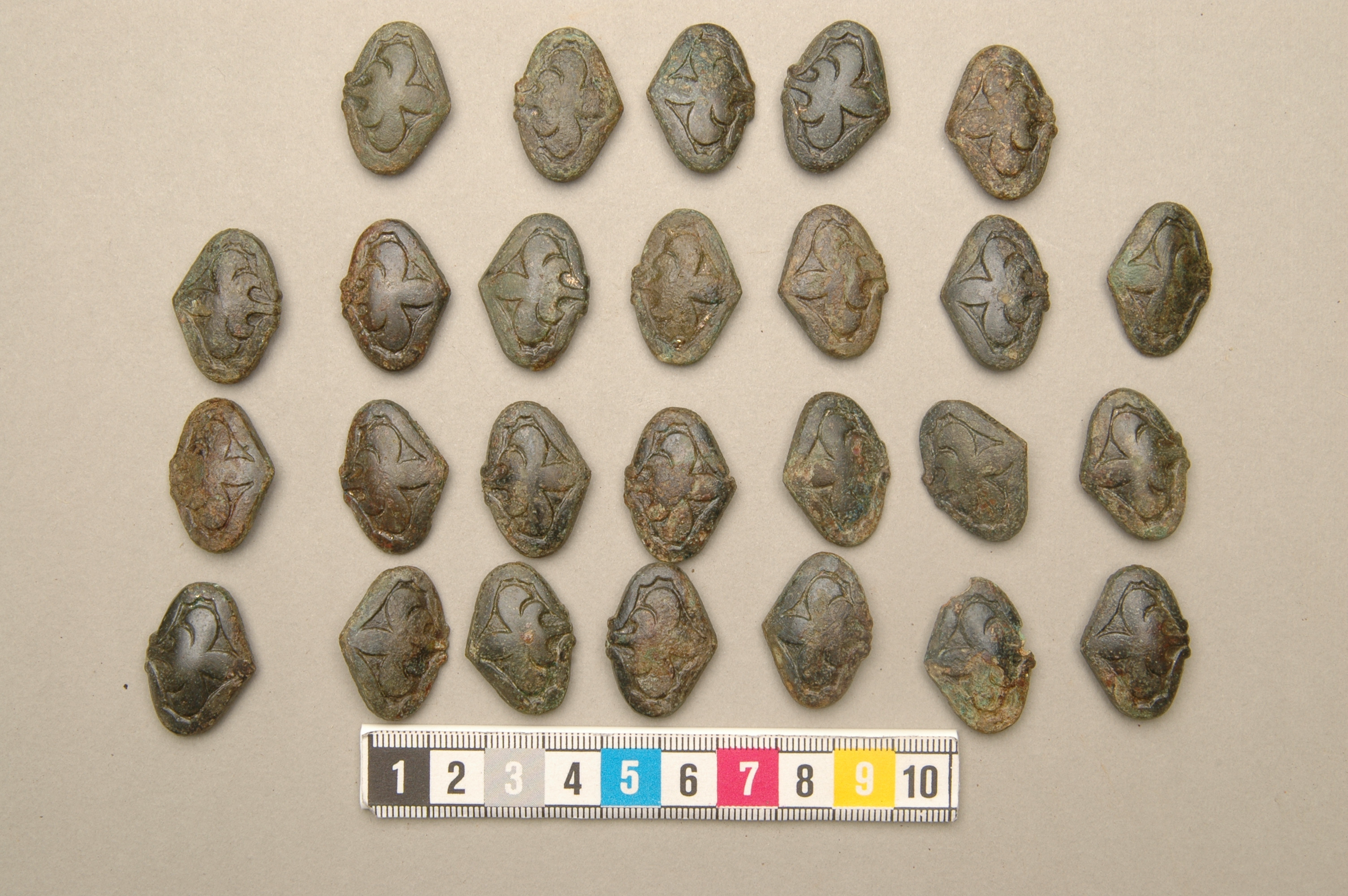26 hjärtformiga bältesbeslag med spår av förgyllning samt vidsittande rester av bältesremmen.