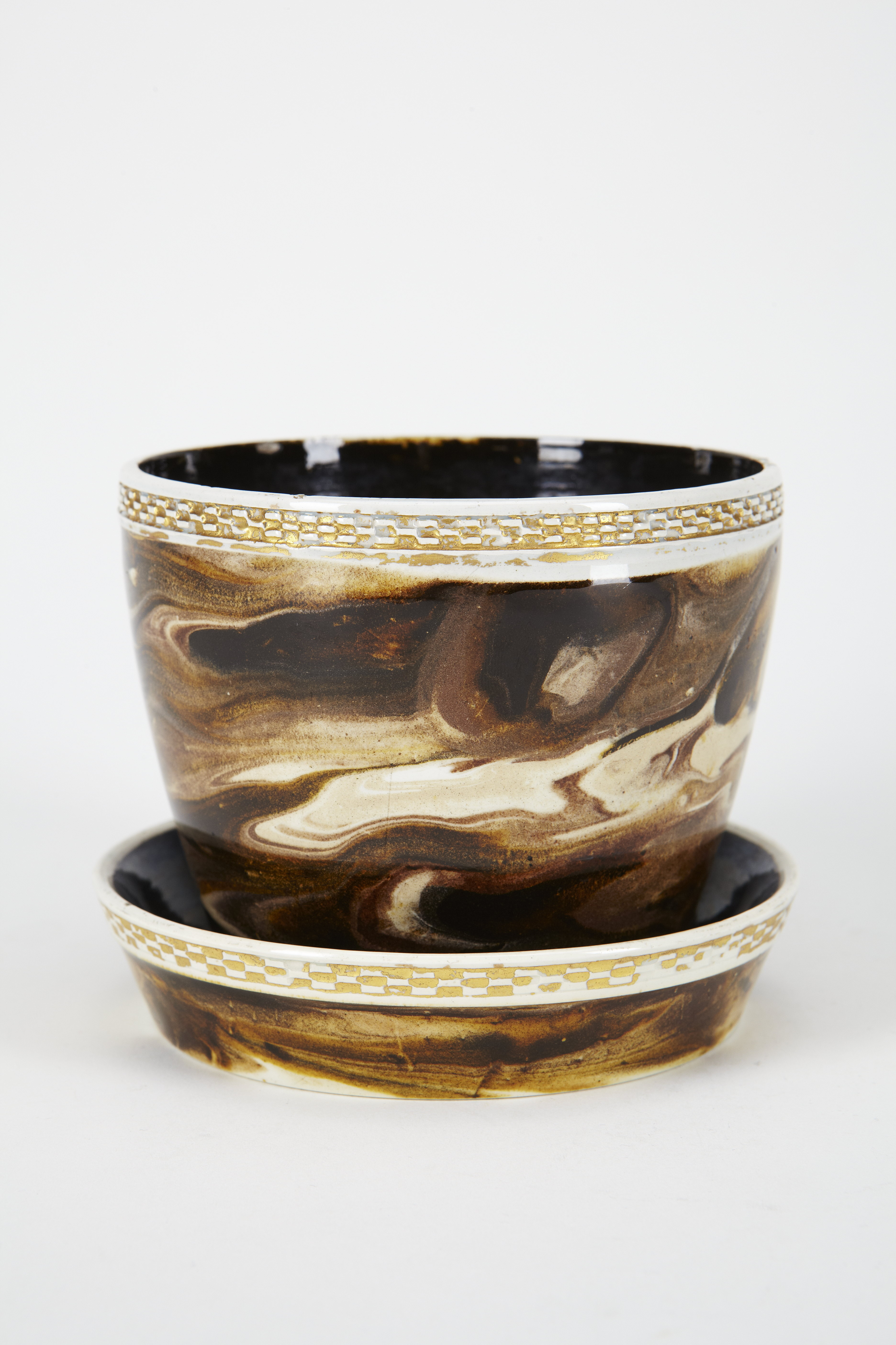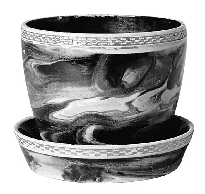 BLOMKRUKA med fat. Konisk, svagt bukig samt med insänkt botten, i vars mitt ett runt hål för vattenavloppet; runt bräddens utsida i relief en smal kedjebård mellan två flackstaviga lister. Dekor i färger under glasyren samt guld. Godset gulvitt, blyglaserat. Utsidan täckt av ett marmorliknande mönster med vindlingar i olika valörer brunt, svart samt gulvitt; bården i guld. Insidan svart. På bottnens utsida instämplat: Wedgwood 2. Höjd 8,8 cm, diameter 11 cm. Fat: med snett uppstående rak kant samt insänkt botten. Dekor som på krukan. På bottnens utsida märkning som på krukan. Höjd 2,5 cm, diameter 11,9 cm.