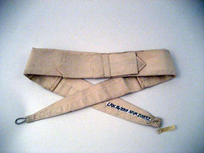 Spännhalsduken är bredare i mitten samt smalnar av i ändarna. Den har fastsydd rosett mitt fram och knäppning med en vit knapp av pärlemor med stjärnmönster på ovansidan samt en ögla av resårband. Längsgående söm mitt bak. Spännhalsduken är sydd i tre delar varav mittdelen är 363 mm lång.