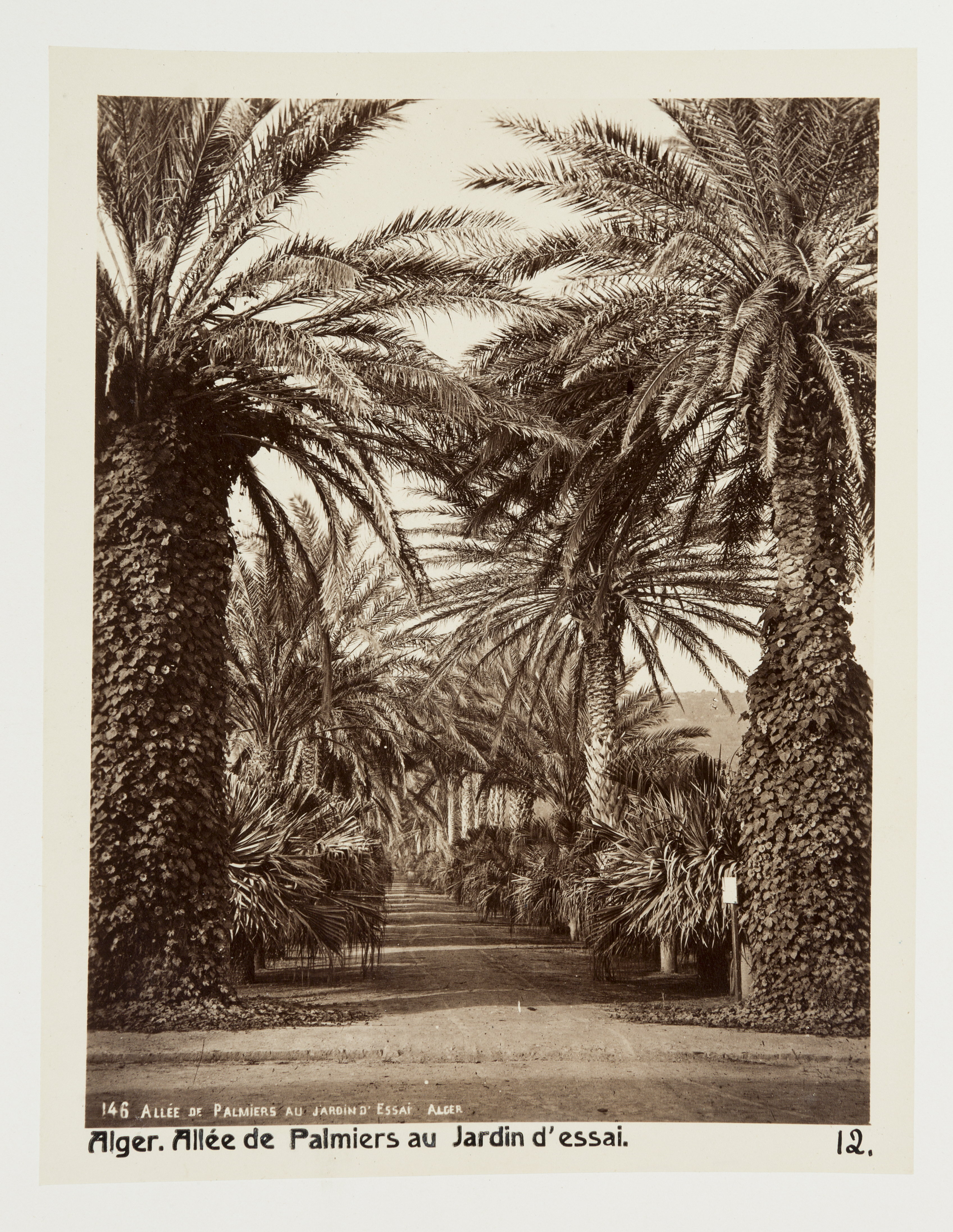 Alger, Algeriet. Palmallé i Jardin d'Essai. Dubblett till LXVI:F.13. Bilderna med inventarienummer LXVI:K.H.01.-137. är inköpta av Johanna Kempe, f. Wallis, i Alger, Biskra, Tunis, Constantine, Oran och Blidah vid hennes vistelse i nämnda städer tillsammans med sin dotter och svärson, Wilhelmina och Walther von Hallwyl, dotterdottern Irma samt fröknarna Caroline Pflaum och Ida Uhse under deras resa genom Algeriet och Tunisien samt åter över Schweiz 11 februari - 19 maj 1889. Förestående uppgifter lämnade med ledning av fröken Ida Uhses Reseanteckningar. Vissa av bilderna är dubbletter till bilder i inventarienummerserien LXVI:F.01.-138. som köptes in av Wilhelmina von Hallwyl under samma resa.
