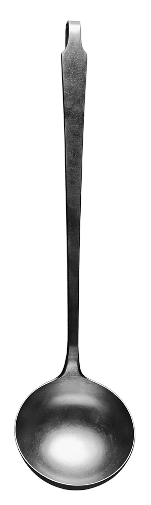 SOPPSLEV Av nickel. Blad runt, skåligt, nästan halvsfäriskt. Skaft långt, platt, avsmalnande inåt samt uppsvängt vid skaftroten, ytteränden avslutad i en från kanterna inknipen, åt undersidan omböjd hake. Längd: 43 cm. Blad, diameter: 11 cm. Österrikisk tillverkning, Berndorf i Nedre Österrike.