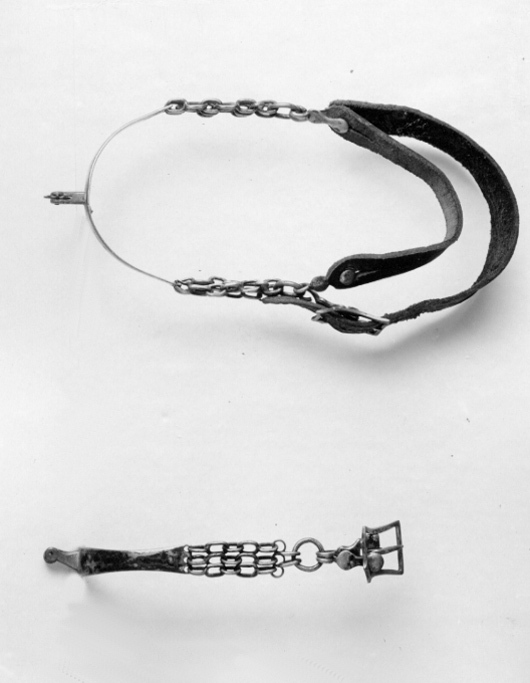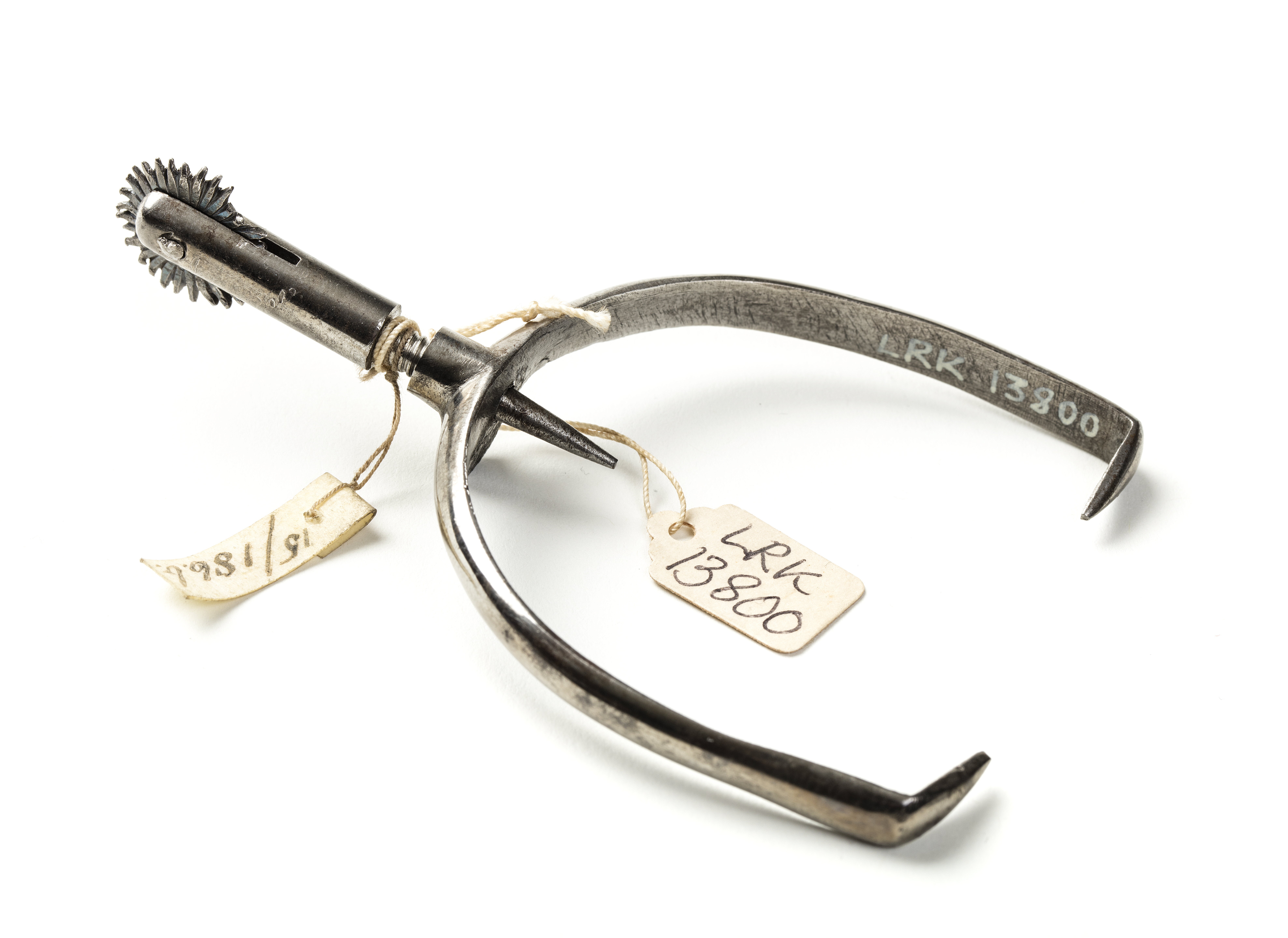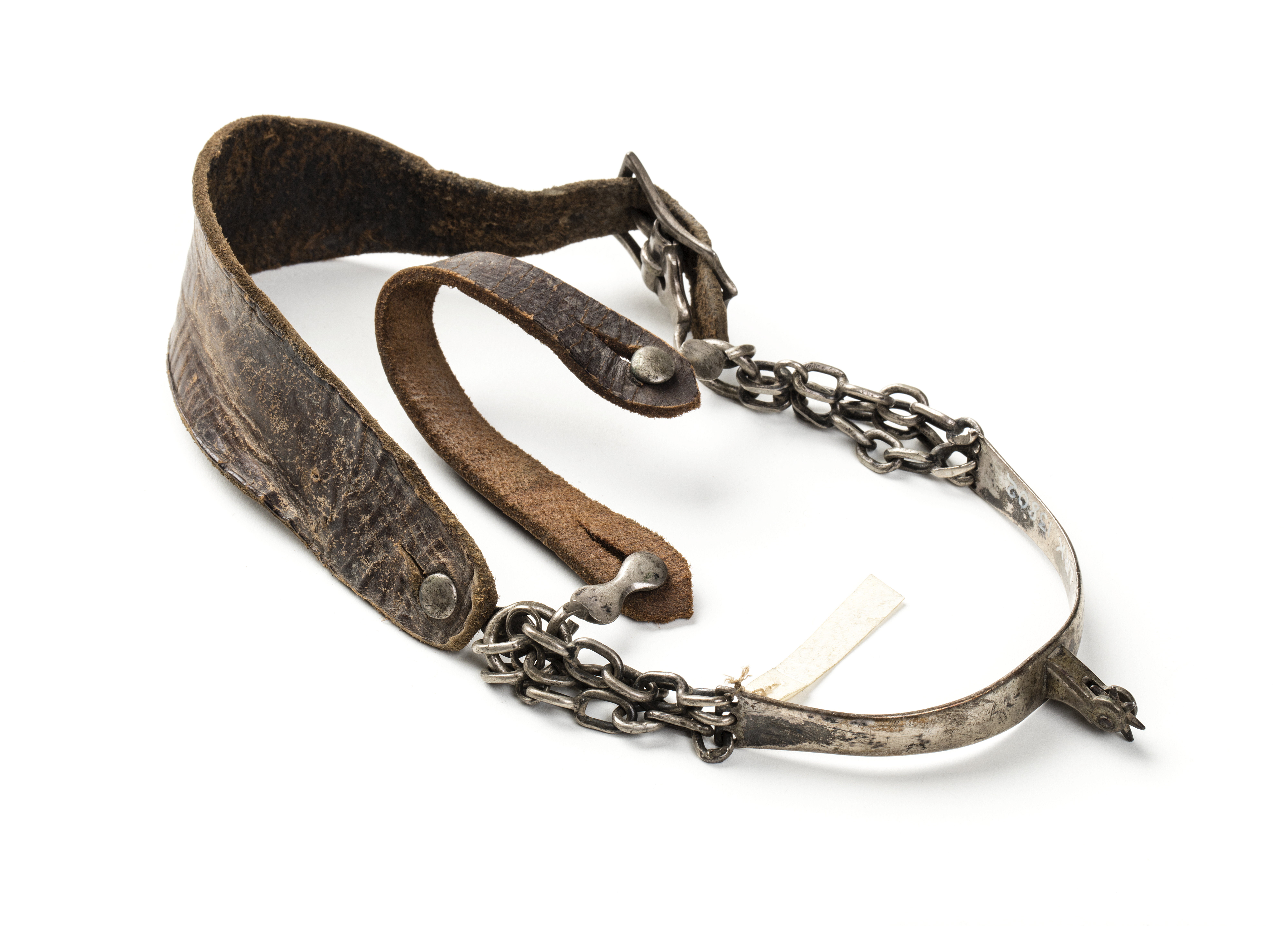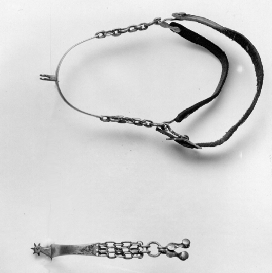 Sporre av slätt silver med korta U-formade skänklar, tunna och plana. I skänklarnasytterändar vardera tre små hål, i dessa fäst tre korta kedjor med ovala länkar. Länkarnasammanfästa med en ring och från ringen utgår två balusterformade spännen medknappformigahållare på hals för läderhällor. I ytteränden av den ena kedjan är dessutom fäst enrektangulär sölja, något konturerad. I hållarna en läderrem, 12 mm. Samt vristrem i söljan,den senare remmen 30 mm bred, bredast på mitten och avsmalnande utåt sidorna. Tureholm