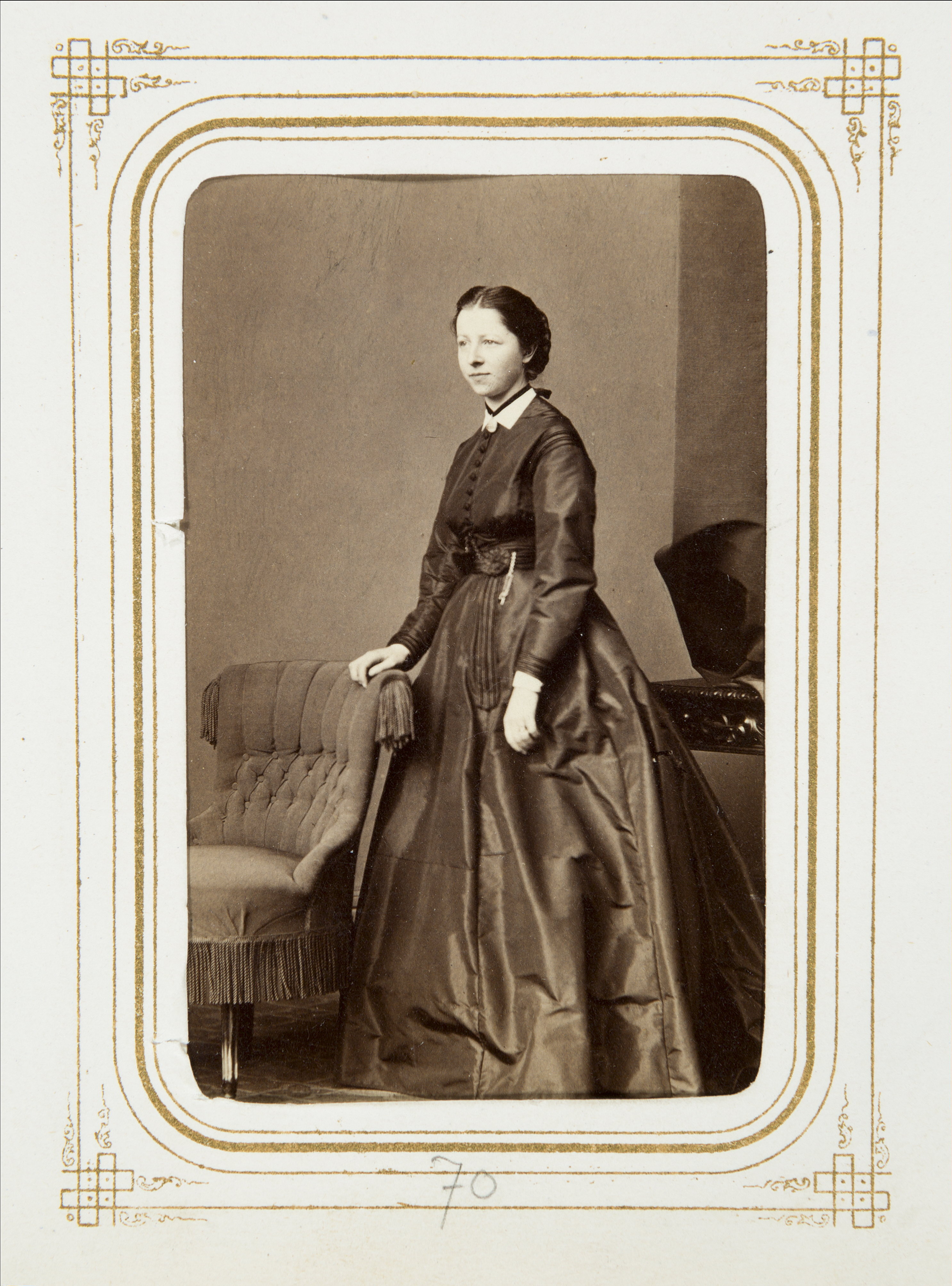 Biografi. Fotografiporträtt. 101 porträtt i album. Medelålders dam. Erhållet av Johanna Kempe, f. Wallis på 1860-talet. 26,5x20,7x4 cm.