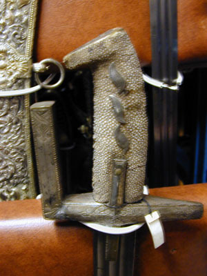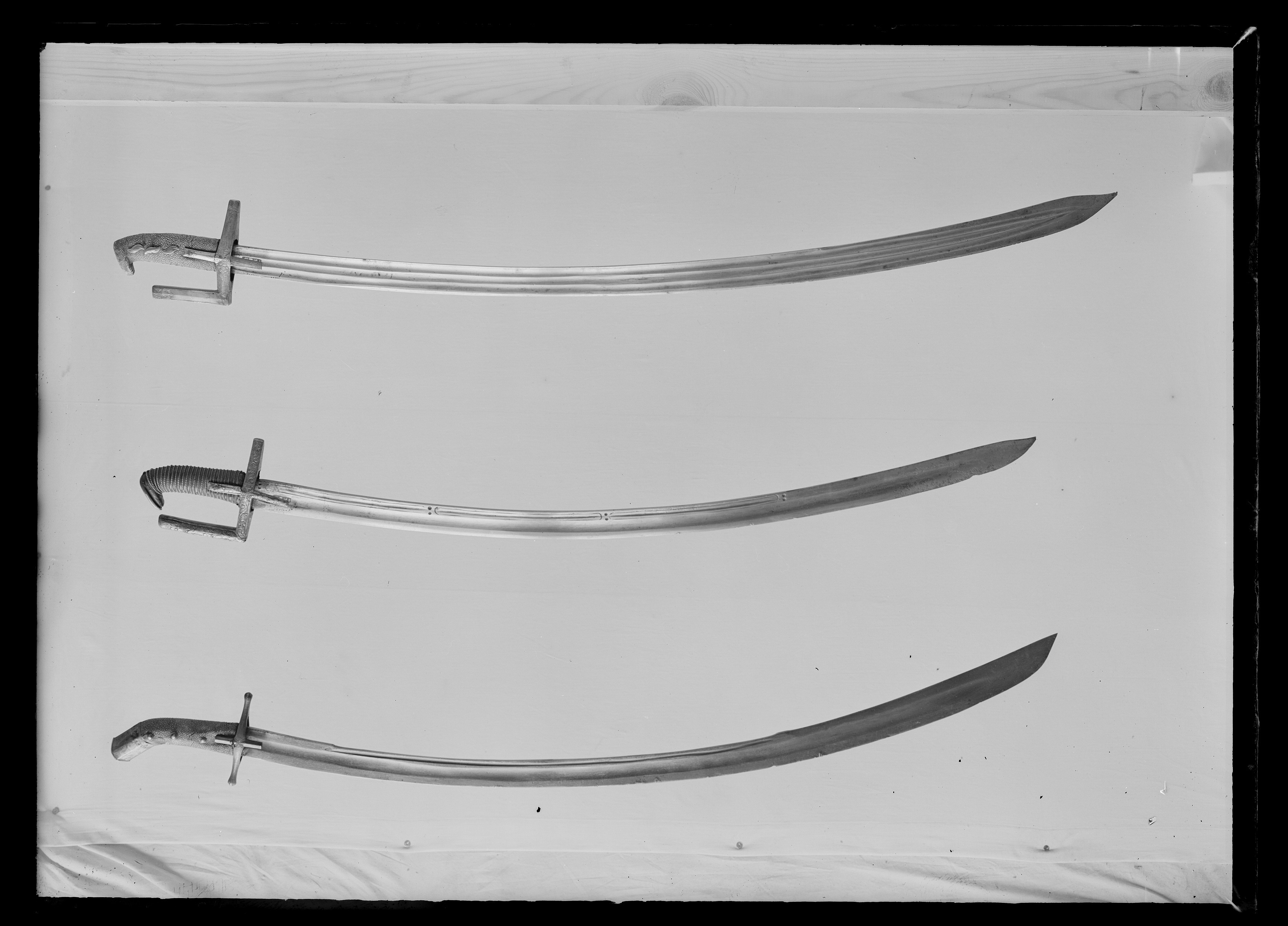 Fäste av försilvrad slät mässing med graverad ornering. Kappa saknas (förkommen). Handbygel rak, öppen, nederdelen rätvinkligt övergående i främre parerstången, som liksom den bakre är rak. Styrskenor uppåt- och nedåtriktade. Vid krysset samt parerstängernas och styrskenornas ändar blom- och bladornament, utmed kanterna smal tvärräfflad bård. Kavel med ovalt tvärsnitt, klädd med hajskinn hopsytt utmed framsidan. På ut- och insidan ovanför styrskenorna en rad av tre spetsovala svängda bladornament. Klinga böjd, eneggad utom vid spetspartiet. På ut- och insidan tre fram till spetsen lika breda hålkälar. På starka delens utsida spår efter kort inskription (bortslipad), på dess insida grovt inpunsat: "IEZVZ, MARIA IOZEF". På klingbasens utsida innanför nedre styrskenan på nedetsad botten: "IPZD" (klingsmedsmärke).