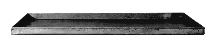 LÅNGPANNA (ugns-) Av järnplåt. Rektangulär, med skarpa hörn, på kortsidorna i varje hörn en omvikt spetsig hörnflik, rakt uppvikt, mycket låg kant och plan botten; kring brädden en utvikt smal kant. Höjd: 2,2 cm.; längd: 52,5 cm.; bredd: 33 cm.