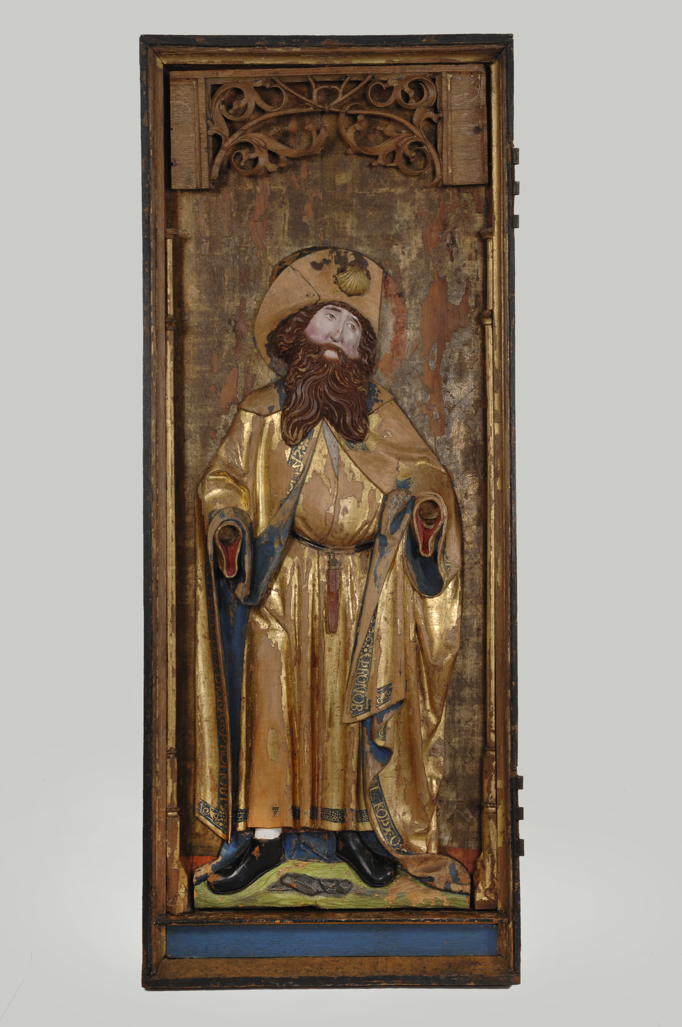 skulptur av lövträ, skåp av ek, furu. Altarskåpsdörr med St Jakob av Compostela
