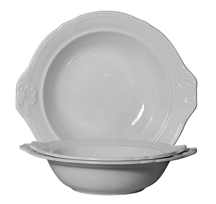 KAROTTER, tre stycken av porslin. Runda, skålformiga, med snett utstående brätte med två breda flikar som handtag samt på låg fotkant. På brättets översida längs ytterkanten i relief ett profilerat band, avbrutet på fyra ställen; brottändarna inböjda, mellan ändarna en kort båge som bandet; på vartdera handtaget ett inåtvänt musselornament mellan två bladornament. Mått: H:6-7,7; D: 21,3-27 cm.