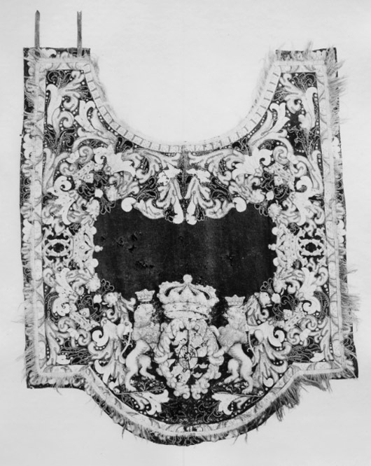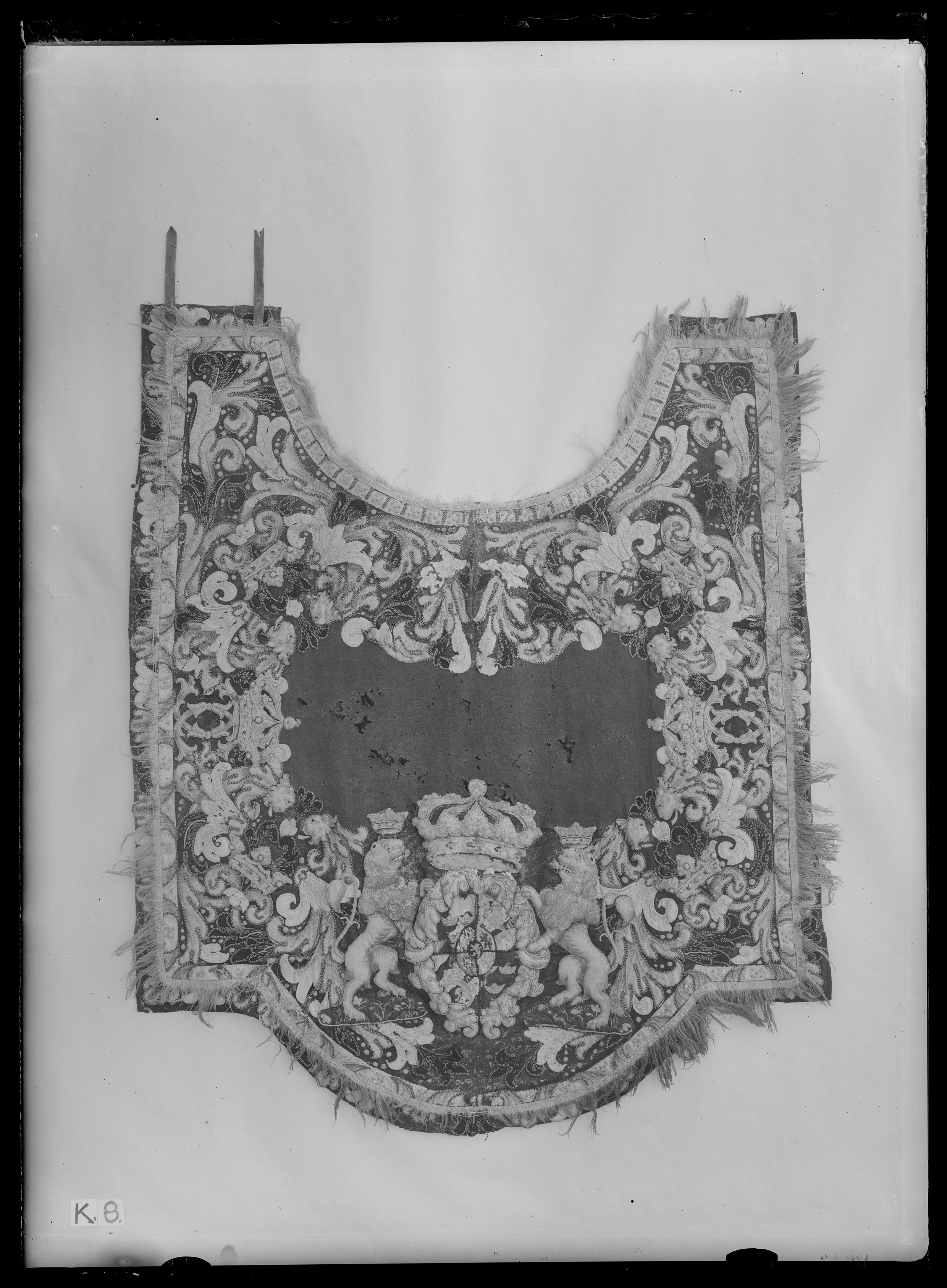 Handhästtäcke, ur en svit om 30 st med svenska riksvapnet och Karl XI:s namnchiffer.