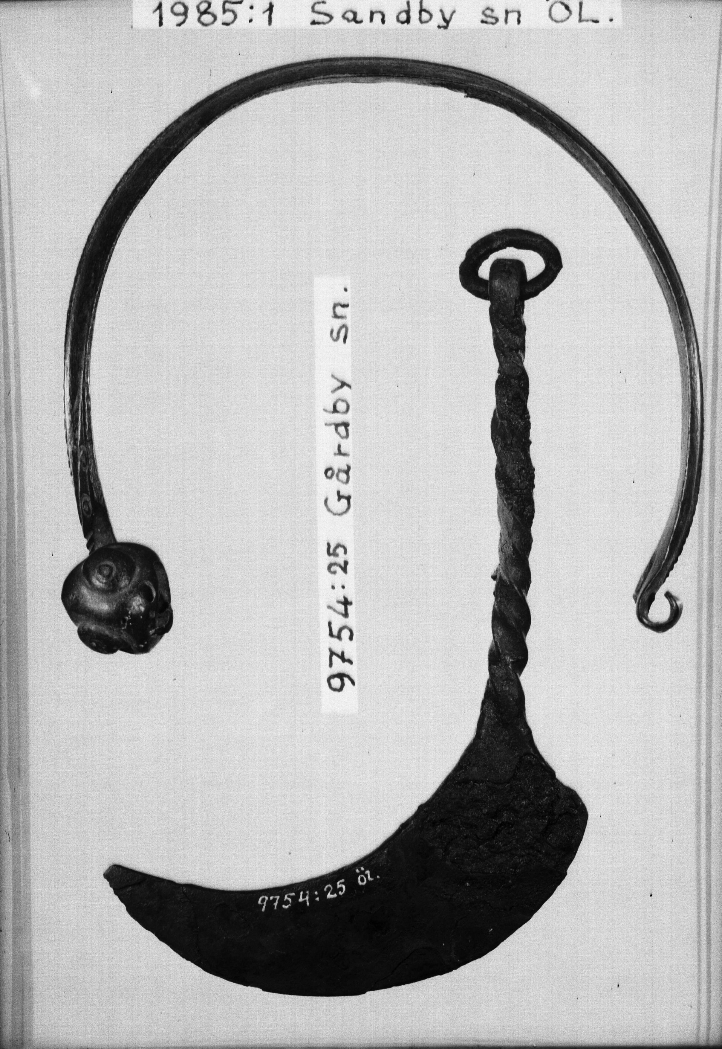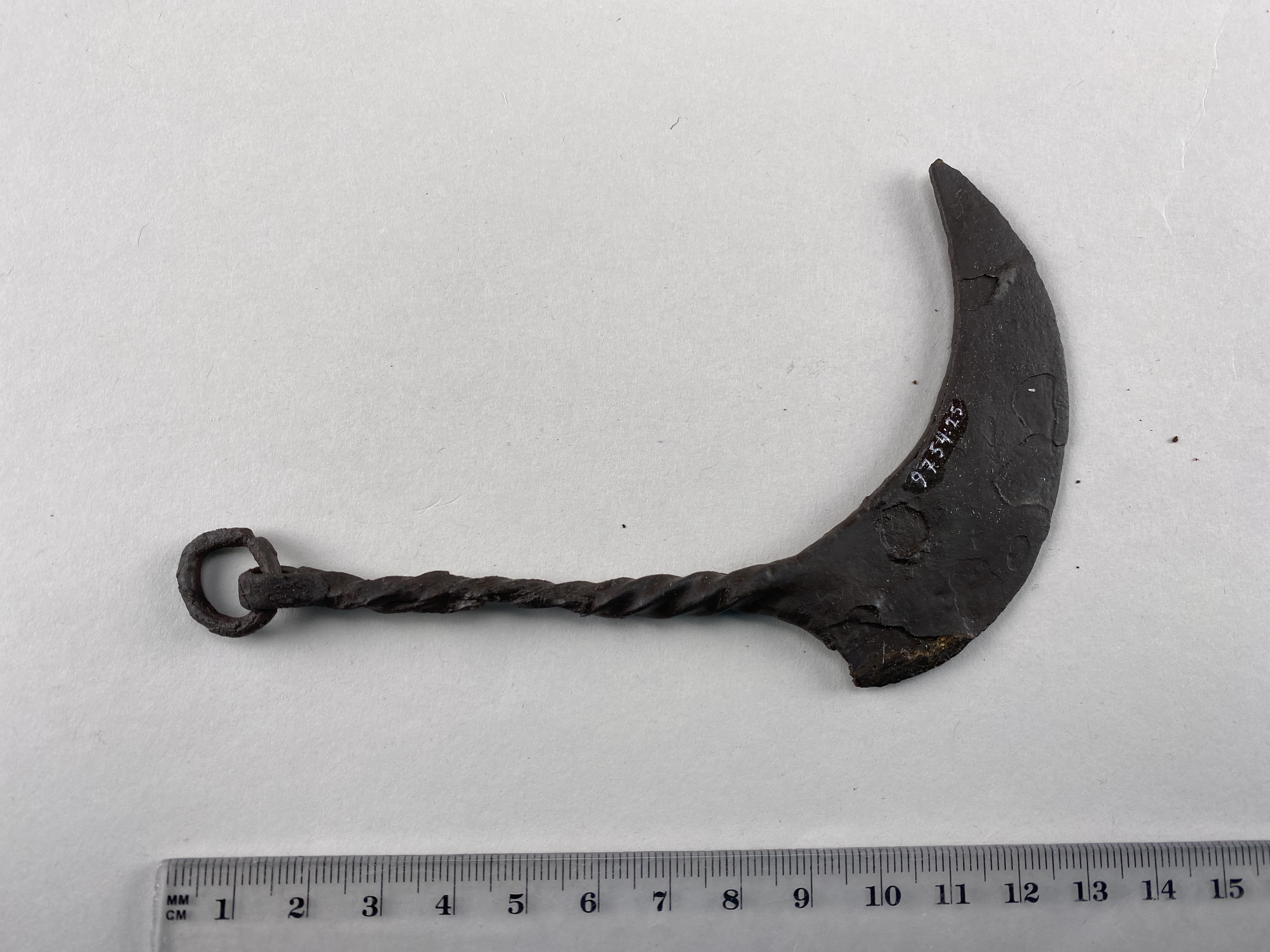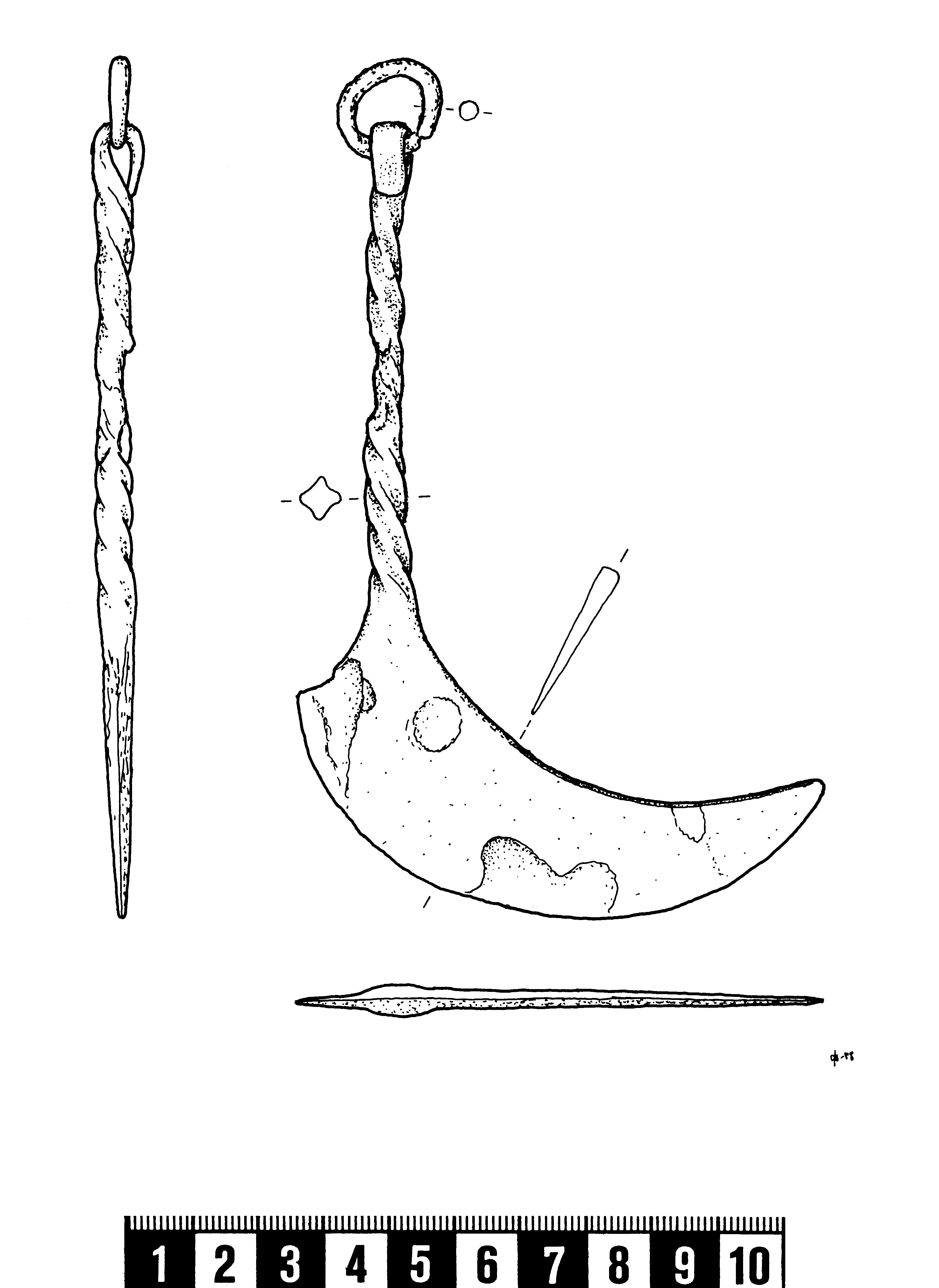 krumkniv med konvex egg. Skaftet av kvadratiskt tvärsnitt som spiralvridits. I änden lös ring. Oklar kontext. Sannolikt inte fyndnummer 25