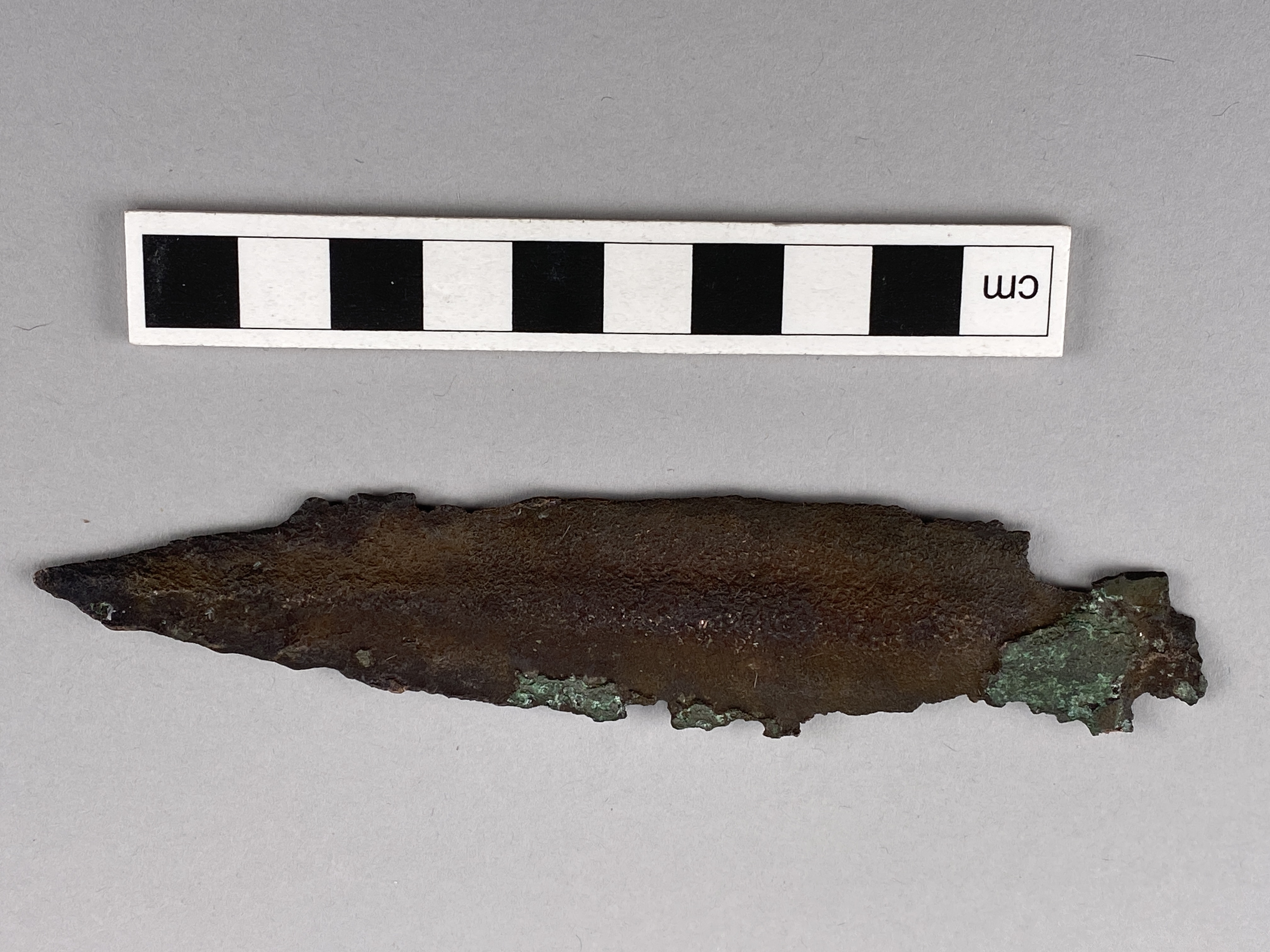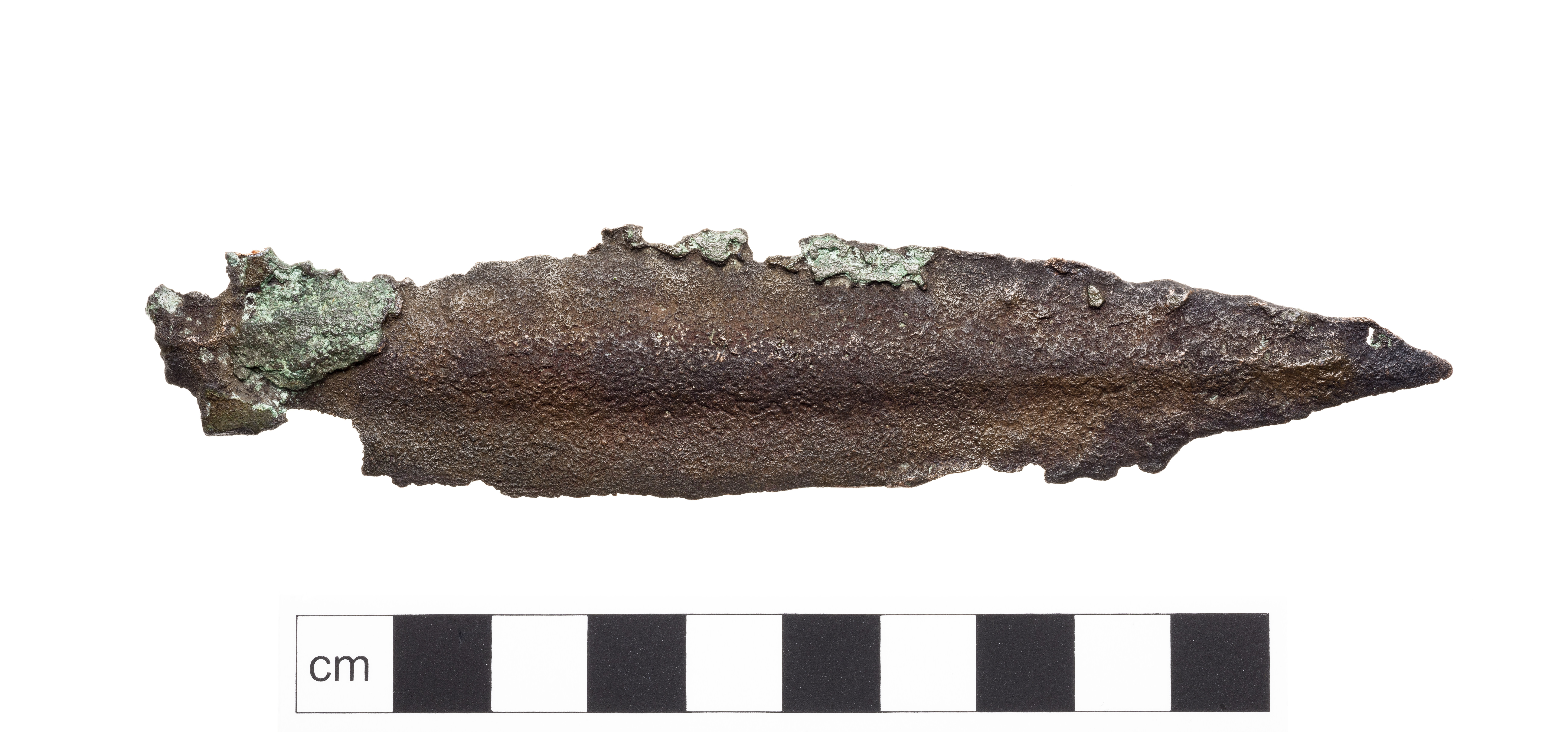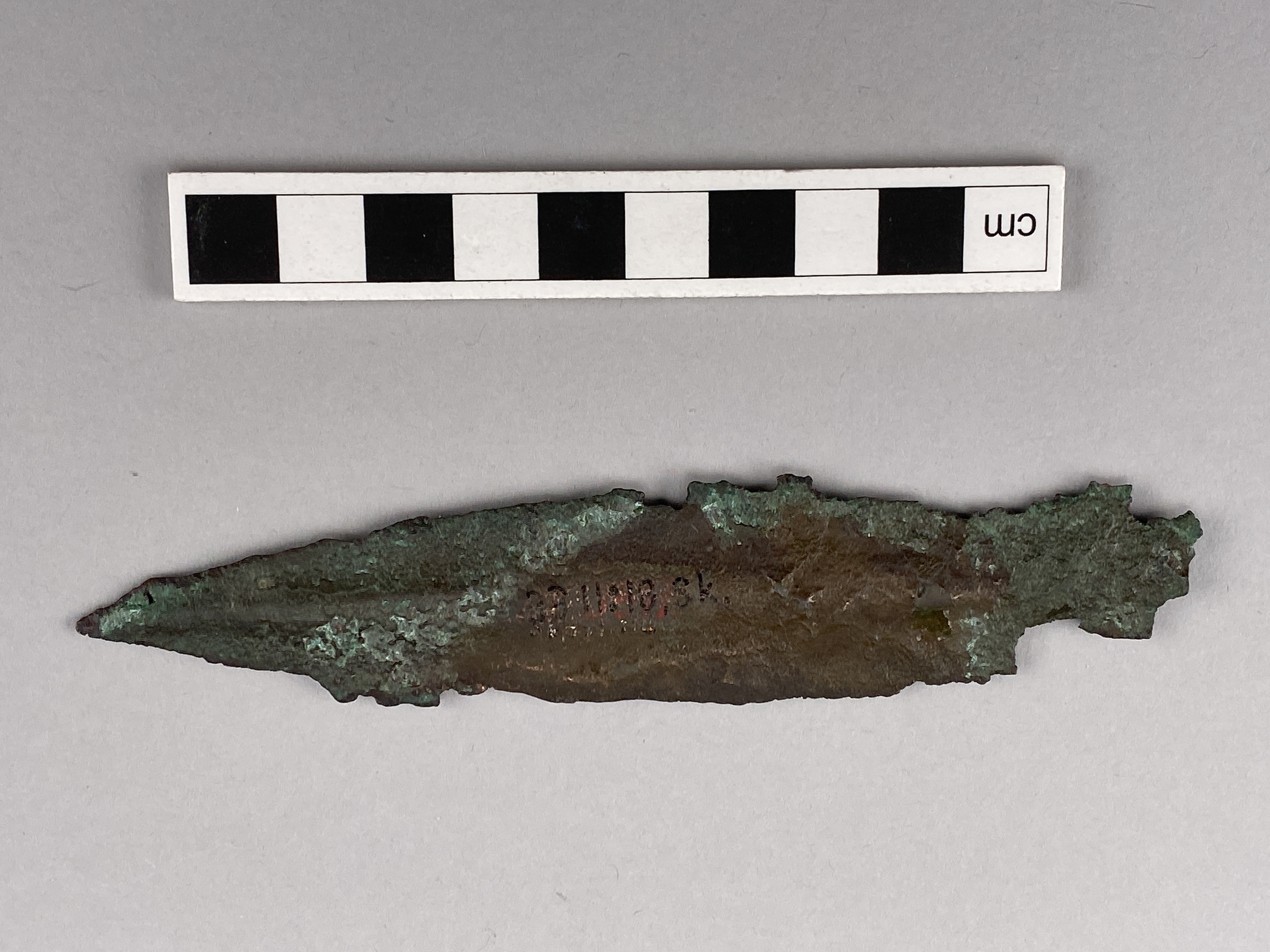 Klinga till en grepplattedolk/greppfästedolk av brons.