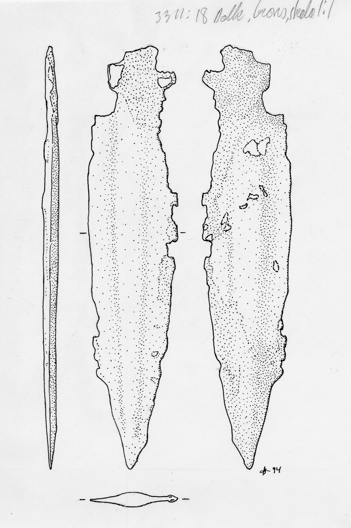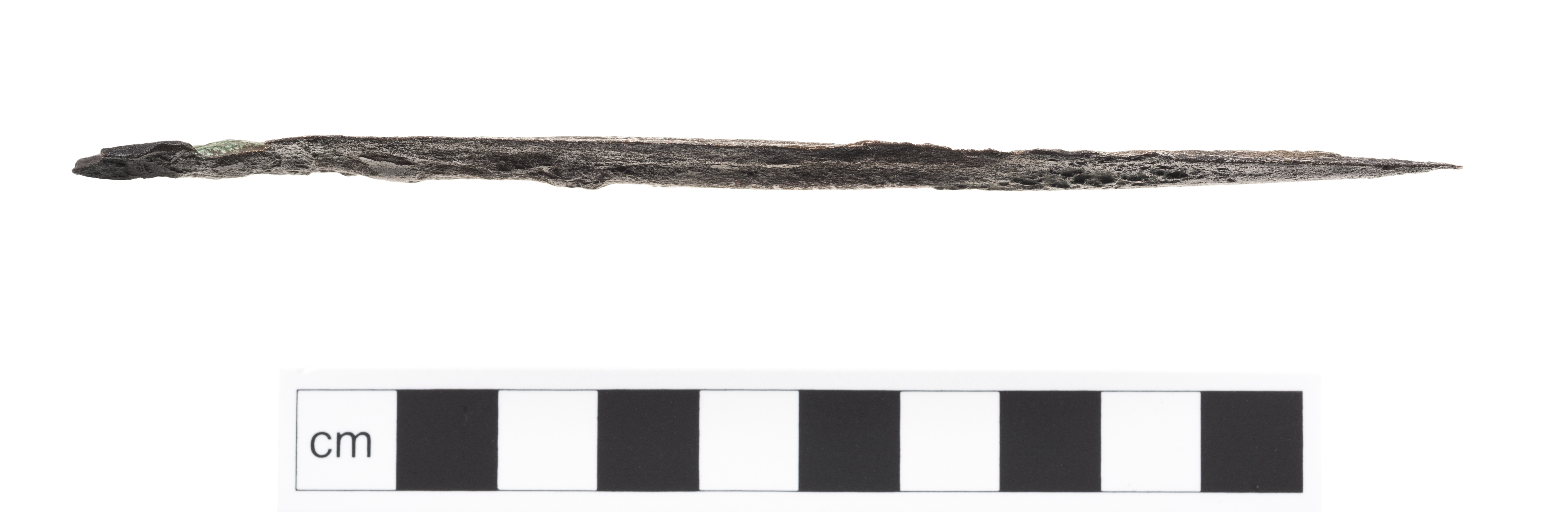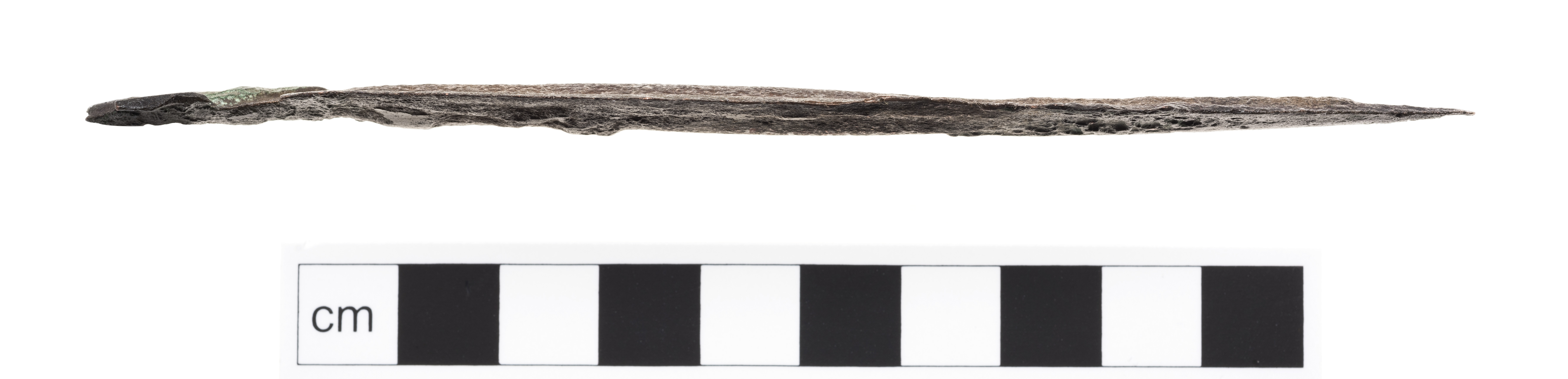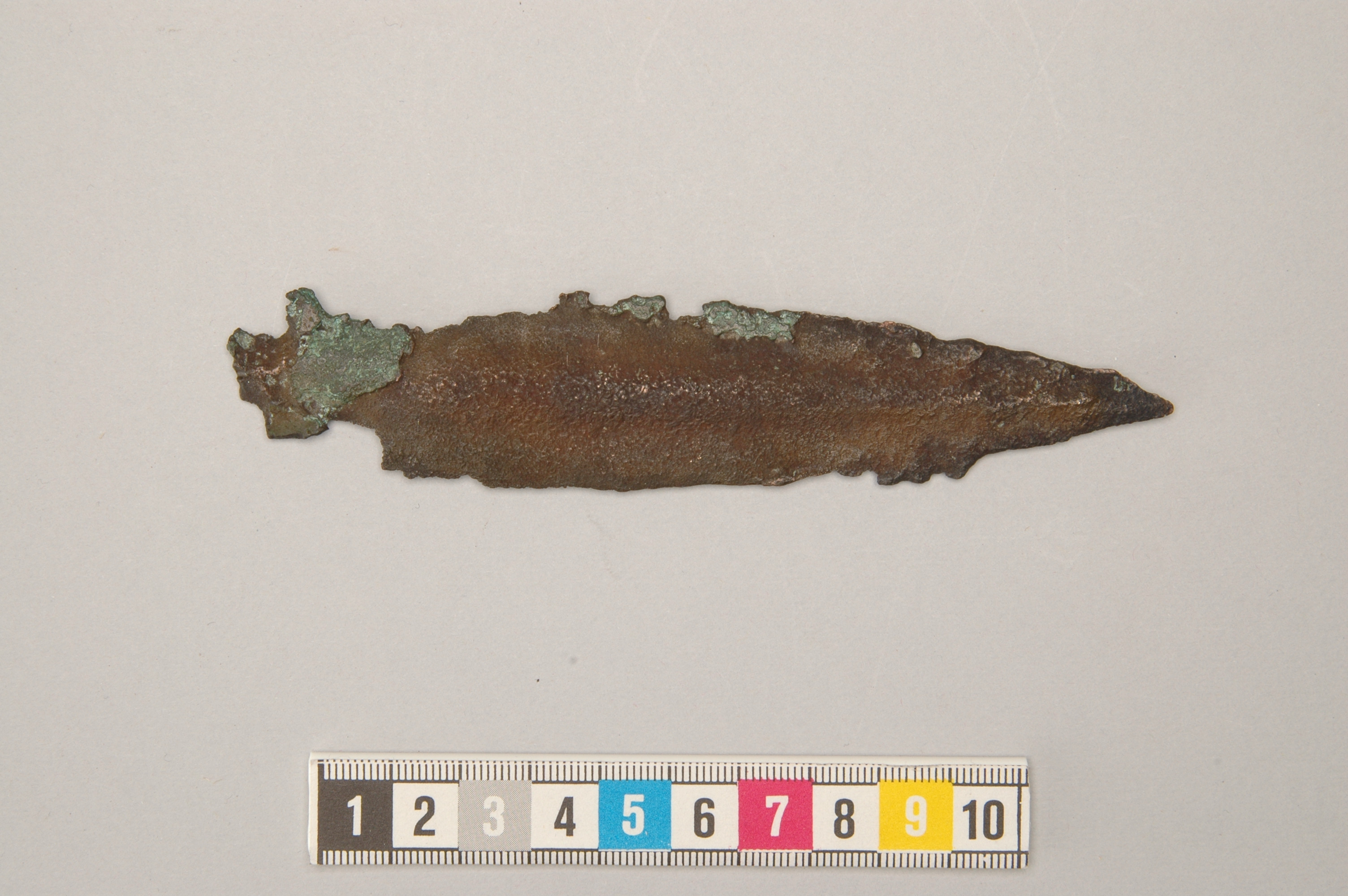 Klinga till en grepplattedolk/greppfästedolk av brons.