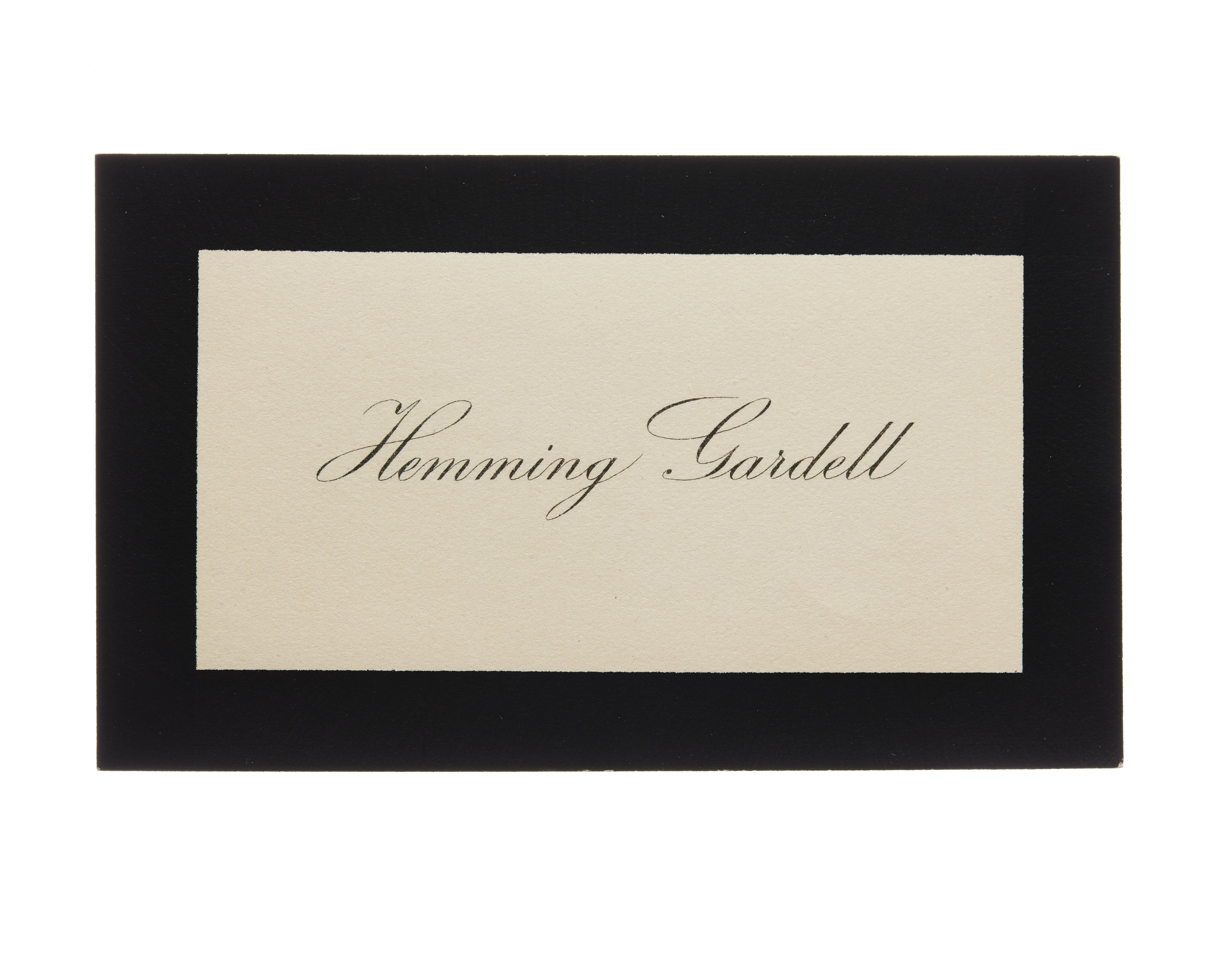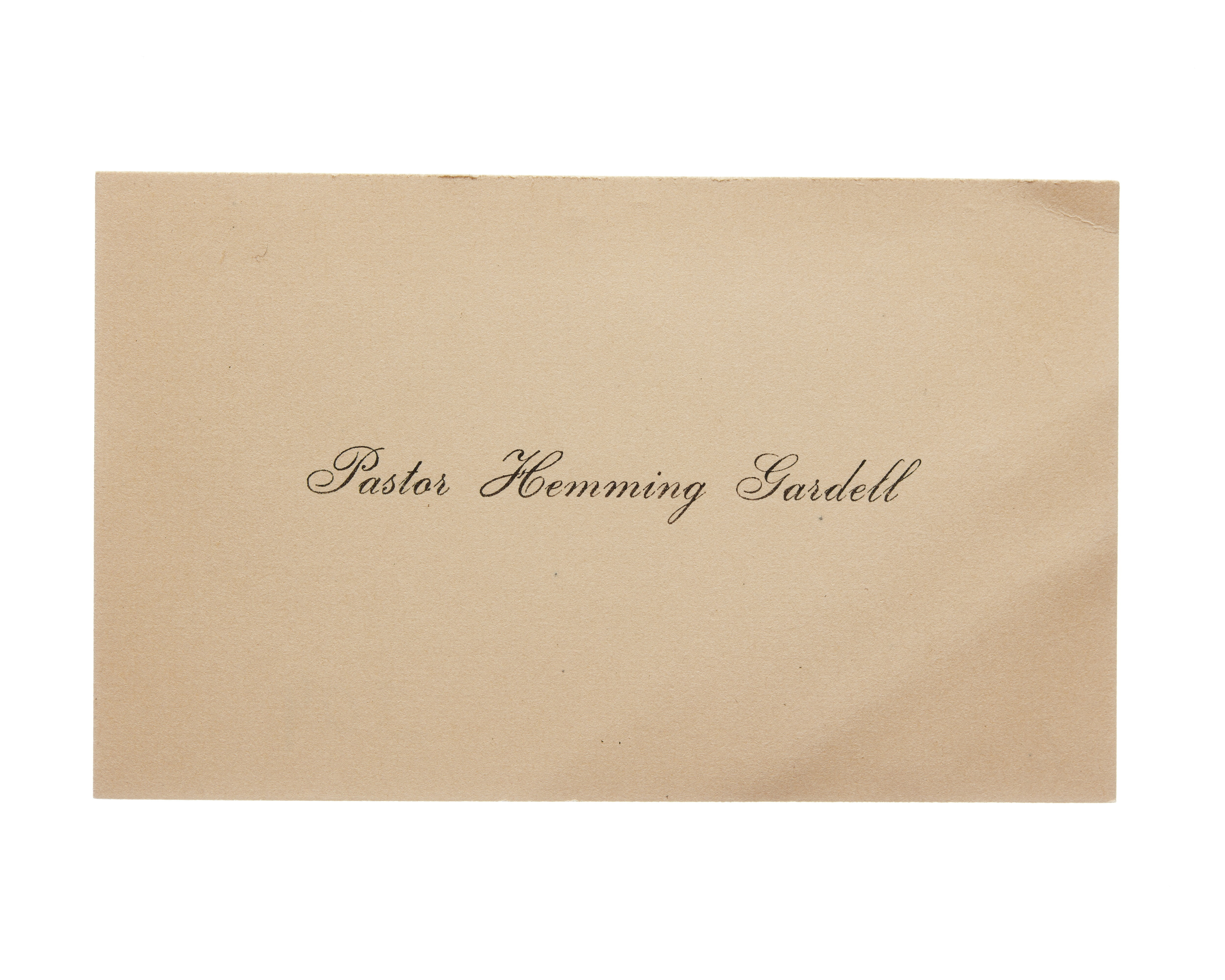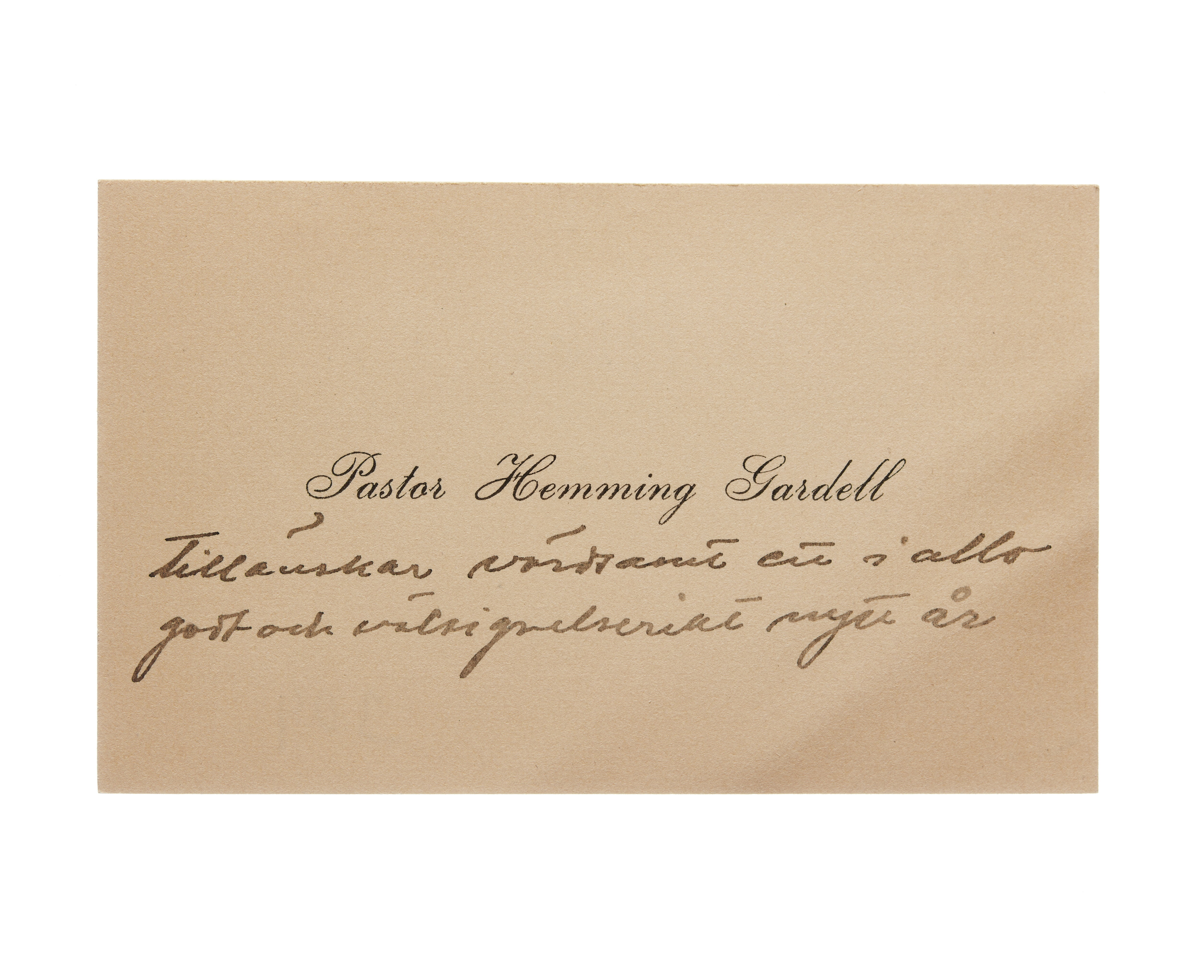 Fem visitkort från Pastor Hemming Gardell. Första kortet är utan datum. Andra kortet daterat 1915, handskrift (nedanför namnet) " tillönskar vördsamt ett välsignelserikt nytt år". Tredje kortet daterat 1916, vikt i nedre högra hörnet, handskrift (nedanför namnet) " tillönskar vördsamt ett i allt gott och välsigneserikt nytt år". Fjärde kortet daterat 1917 samt sorgkant. Handskrift (nedanför namnet) " tillönskar vördsamt ett i allt gott och välsigneserikt nytt år". Femte kortet daterat 1917 samt sorgkant.