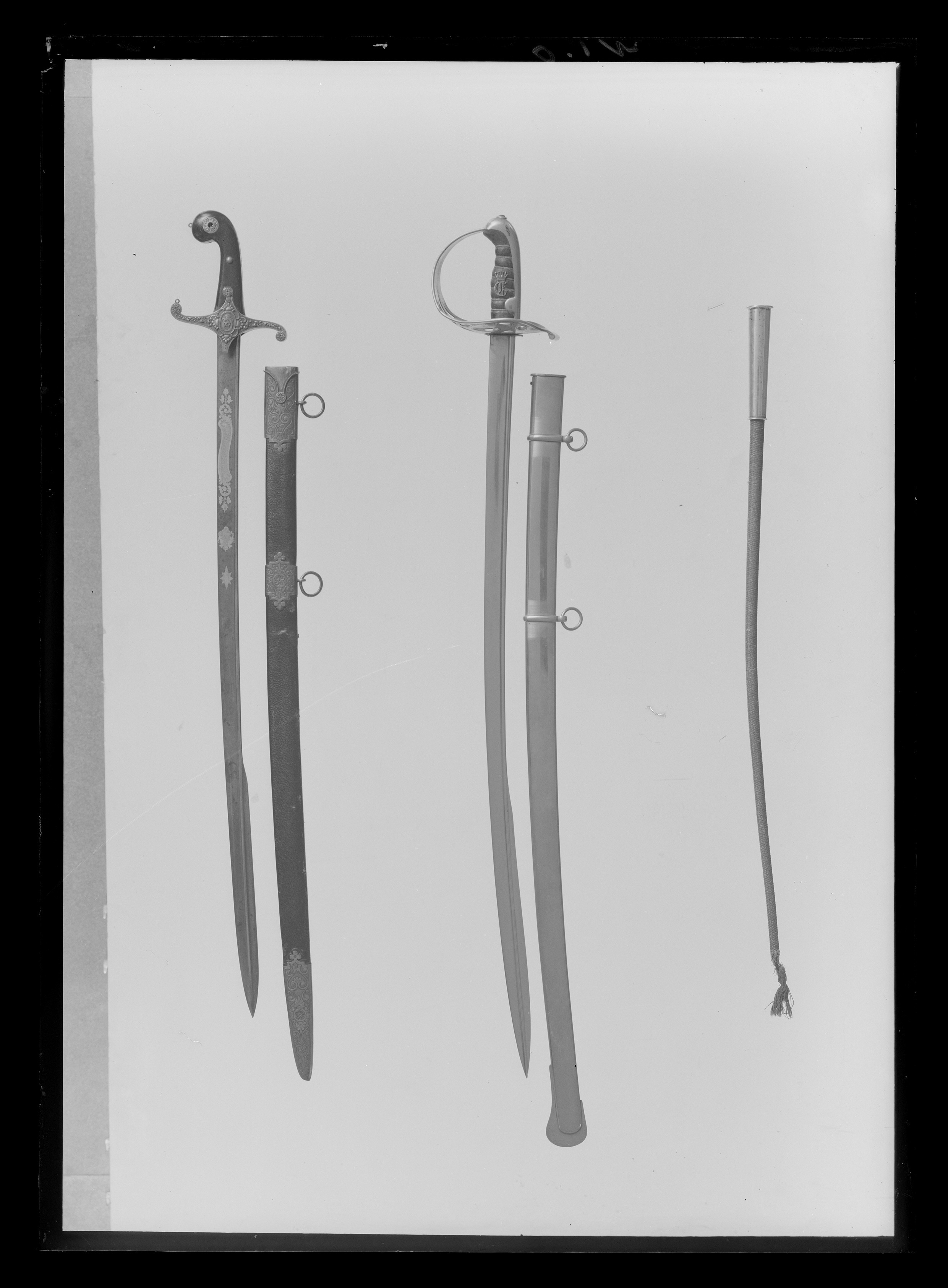 Fäste av polerat stål. Kappa slät, direkt övergående i det likaledes släta ryggbeslaget. Handbygel nedtill breddad och övergående i den genombrutna parerplåten, som på utsidan har graverade, smala ränder kring de genombrutna ornamenten. Bakre parerstång, bred, nedåtböjd. Kavel klädd med fiskskinn, lindad med två parter förgylld mässingstråd. Nitat på kavelns sidor ett krönt C med hertigkrona av förgyllt silver. Klinga böjd, eneggad, förnicklad. Spetspartiet tvåeggat format med jelman. Gåva av Karl XV som kronprins till översten, friherre C.A.Bror Cederström (1824-1893).