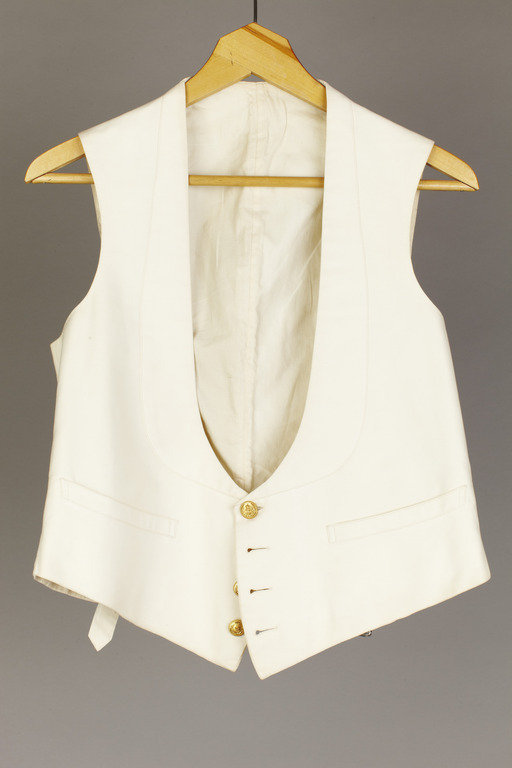 Vit väst av bomullspiké med schalkrage och enkel rad om fyra knappar. Knapparna förgyllda, med krönt ankare, lagerkvist och repstavsbård, allt i kraftig relief, d: 17 mm, på undersidan inpräglat: "JENNENS & Co // LONDON". Två stolpfickor fram. Ryggstycke av vit bomullstuskaft, samma tyg i livstyckenas foder. Nedtill bak sprund och spänntampar med förtent mässingssölja med: "PRIMA // SOLIDE".