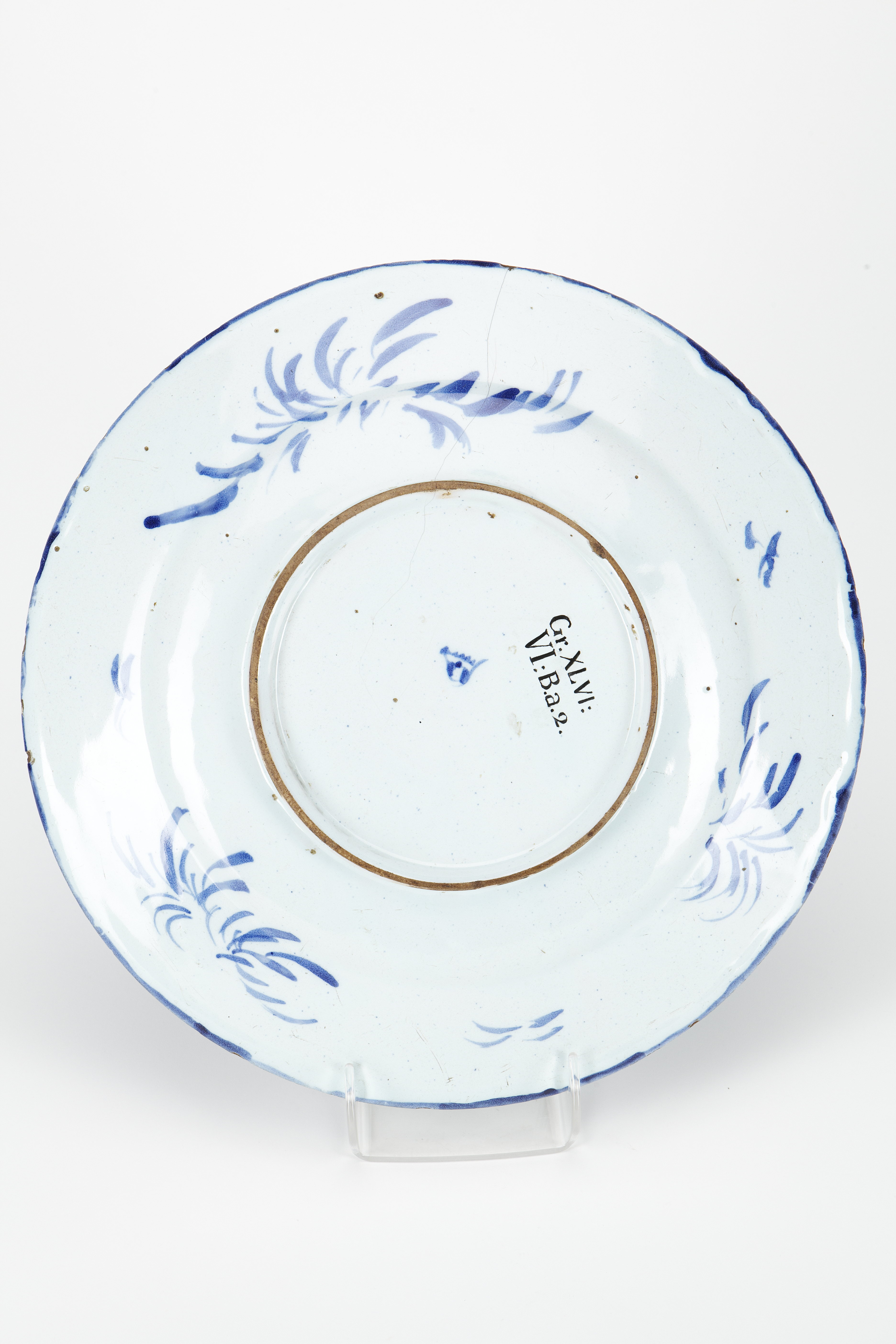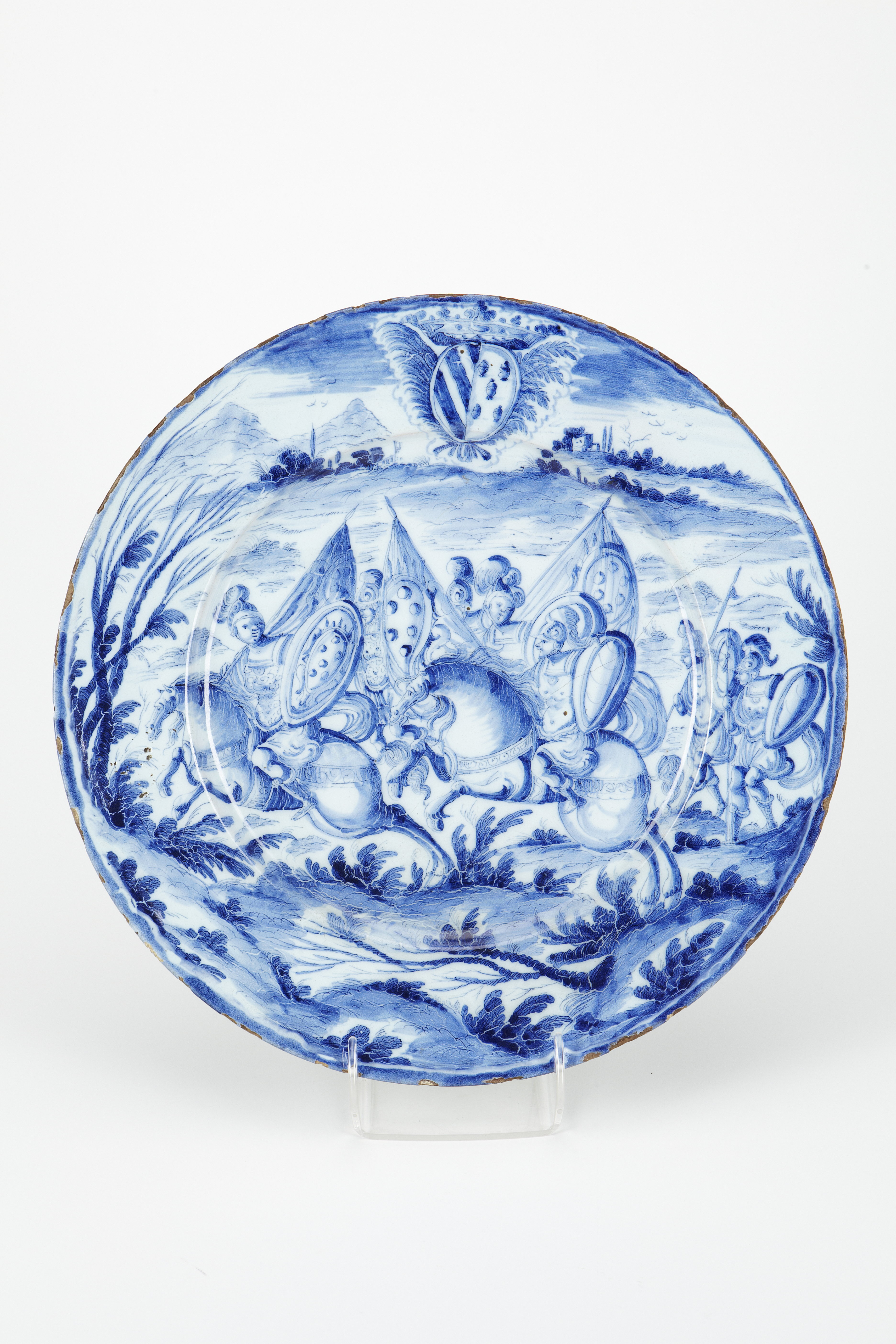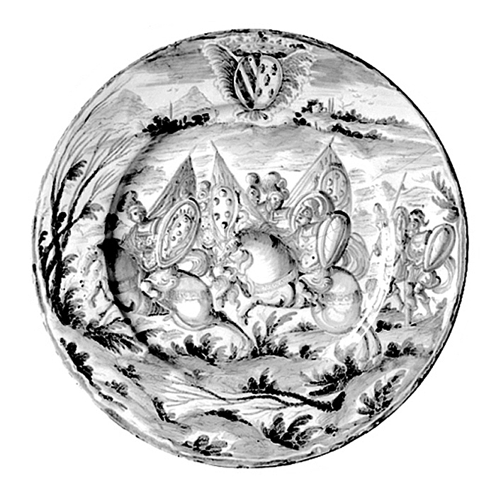 FAT. Runt, med kälformig kep och snett utstående, svagt kälformigt brätte samt på fotkant. Dekor i blått på ljust grönaktig tennglasyr. Godset blekgult. På hela insidan en soldatscen: På ett öppet fält, bevuxet med små bladväxter samt med några nästan kala buskar till vänster, två ryttare i galopp åt vänster, bortom dessa tre fotsoldater samt längst till höger två dylika, samtliga i rustningar och hjälmar med plymer samt med nedtill spetsiga ovala sköldar, den främste ryttarens med ätten Medicis vapen (sex kulor); ryttarna samt fotsoldaten bakom den eftersta av dessa bärande fanor med Medici-vapnet; fotsoldaterna längst till höger med lansar. Upptill på brättet utspart i dekoren ett krönt vapen, tillhörande en gren av ätten Pignatelli. På bottnens utsida en märkning i blått. Höjd: 4,6-5,5 cm, diameter 35,5 cm