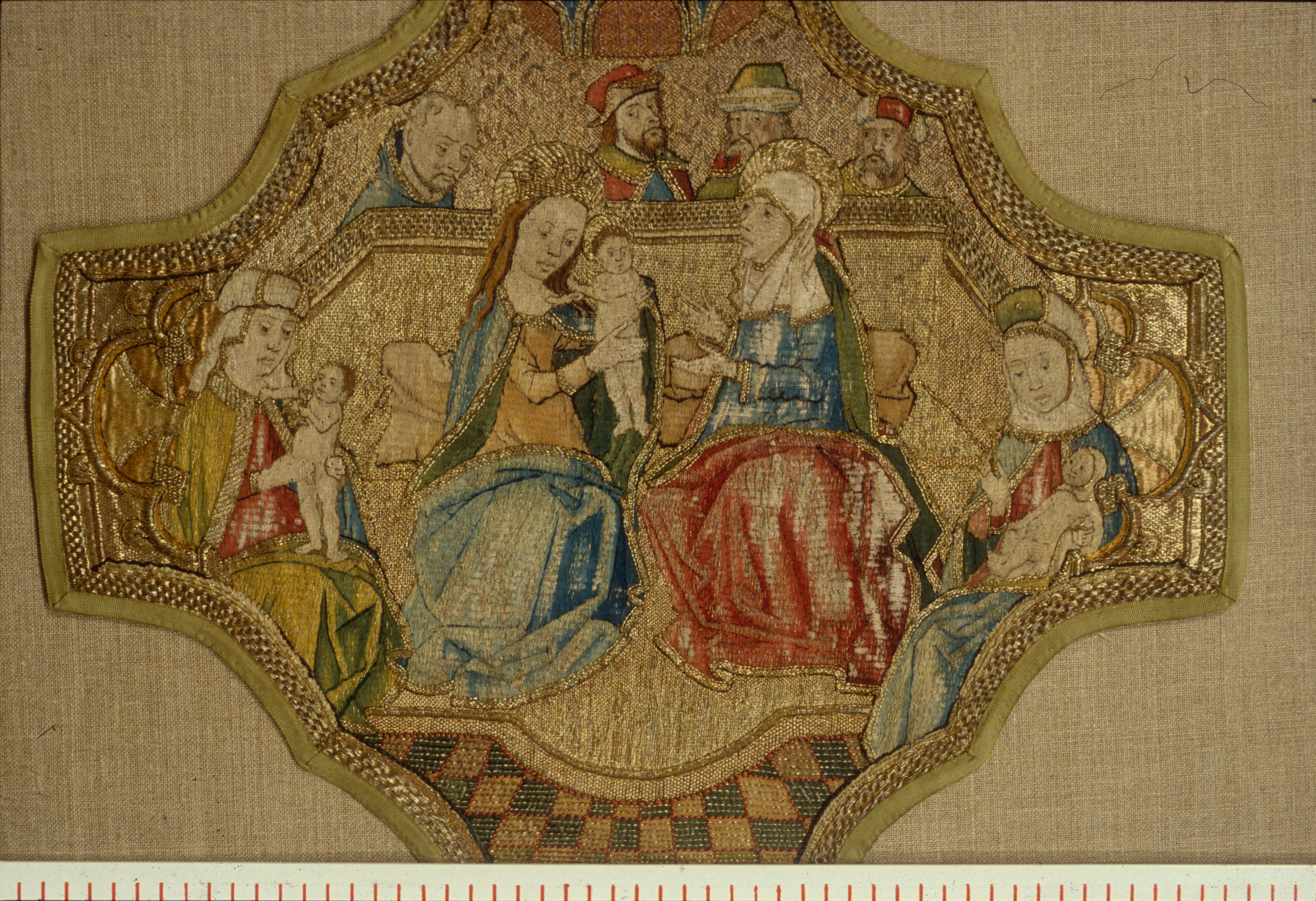 Figurbroderi i guld och silke på lärft. Den Heliga släkten, S. Katarina och S. Apollonia. Flandriskt arbete. Inköpt 1859.