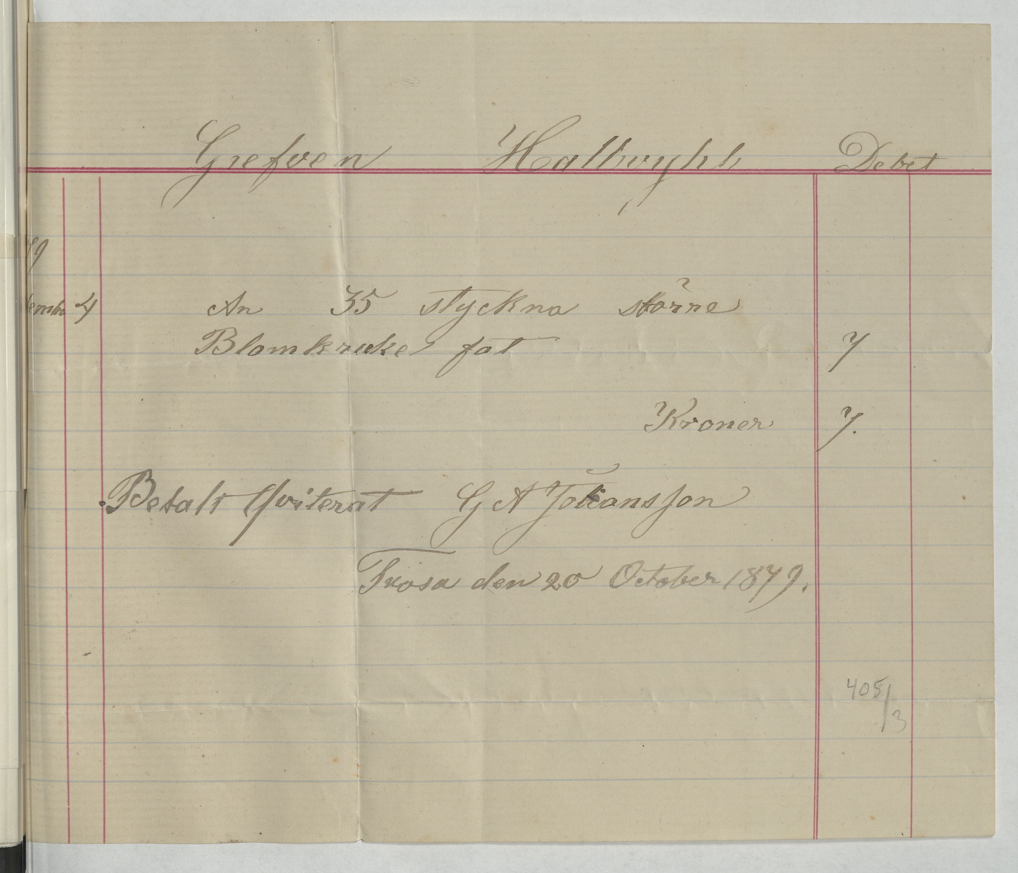 Kvitto från G. A. Johansjon, kakelugnsmakare. Gällande betalning för 35 stycken blomkrukefat.