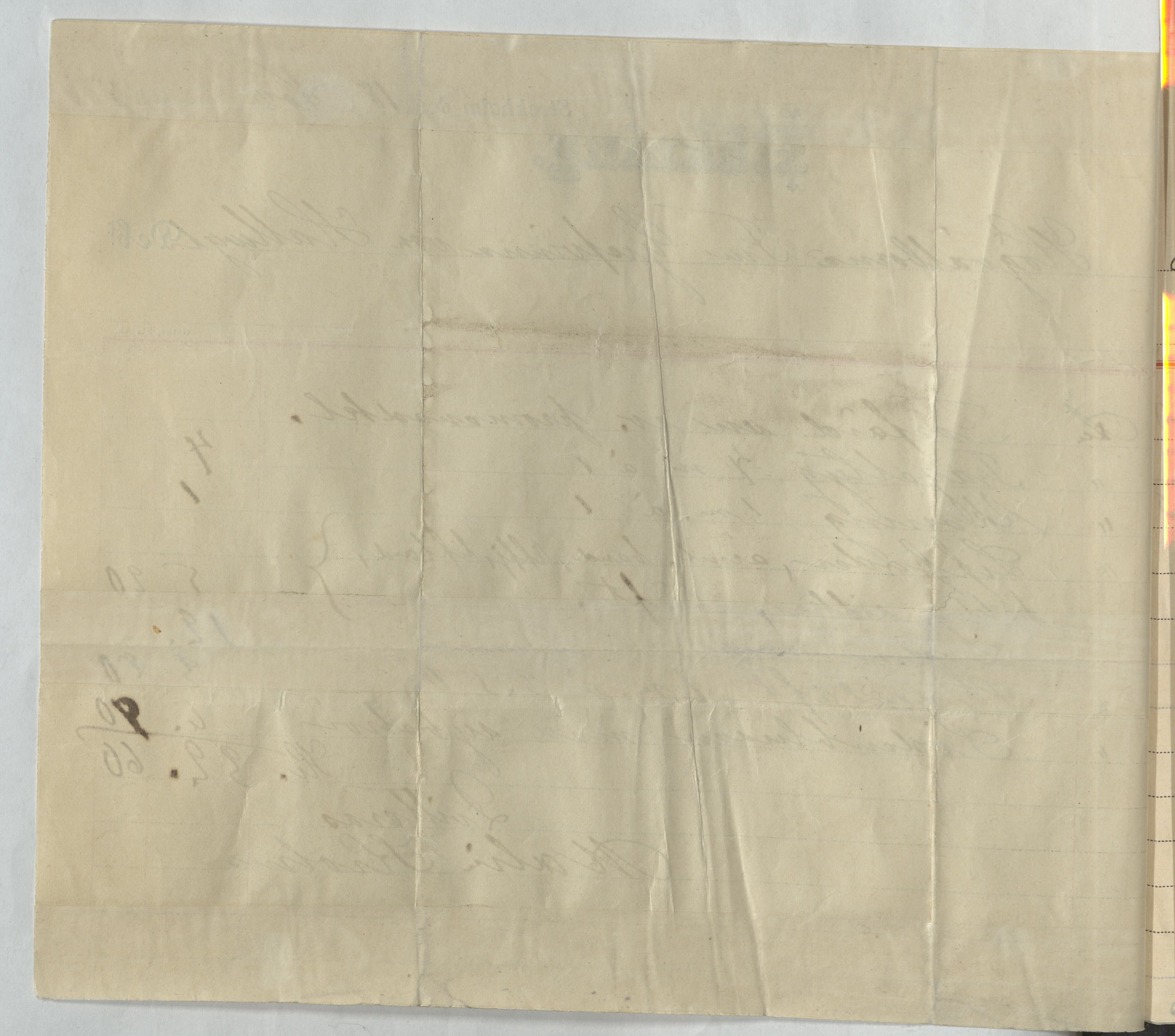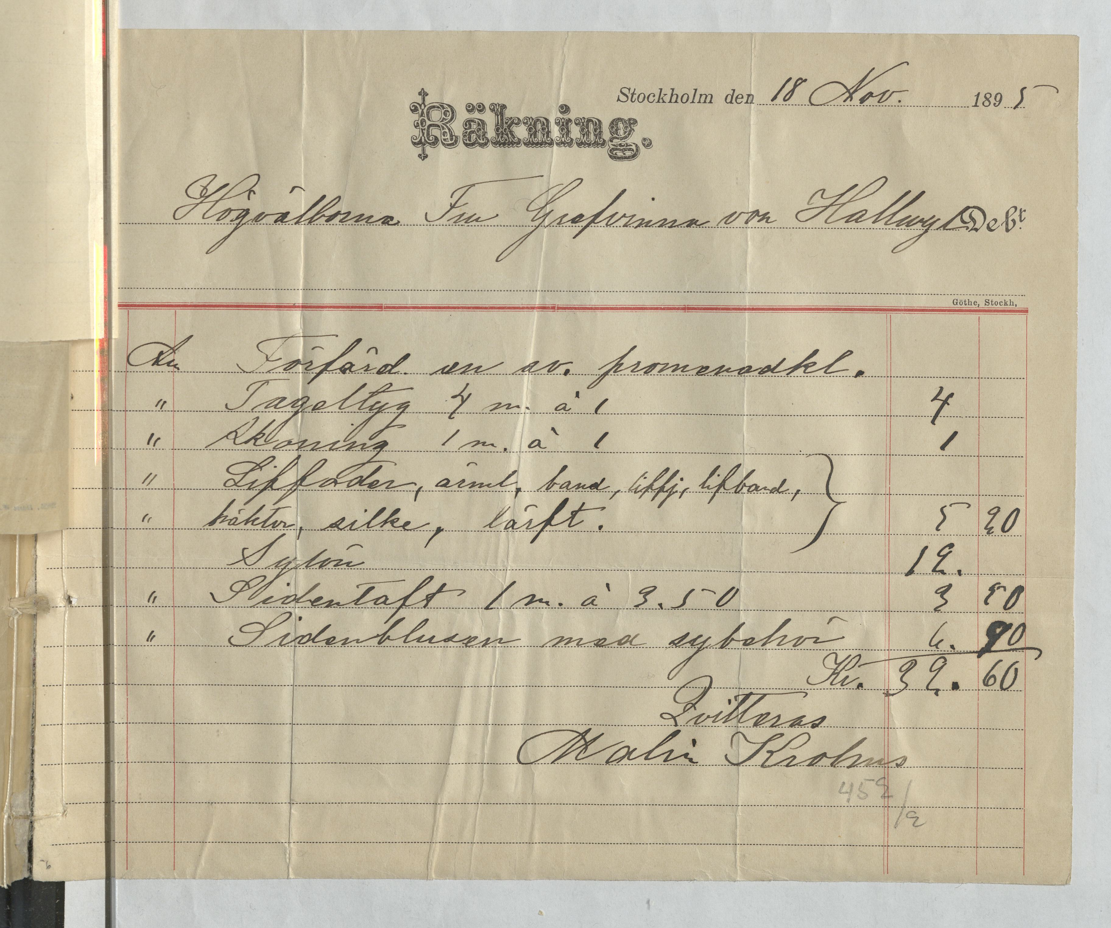 Kvitto från Malin Krohns ateljé. Gällande material och sylön för bland annat en promenadklänning. Stockholm, 1895.