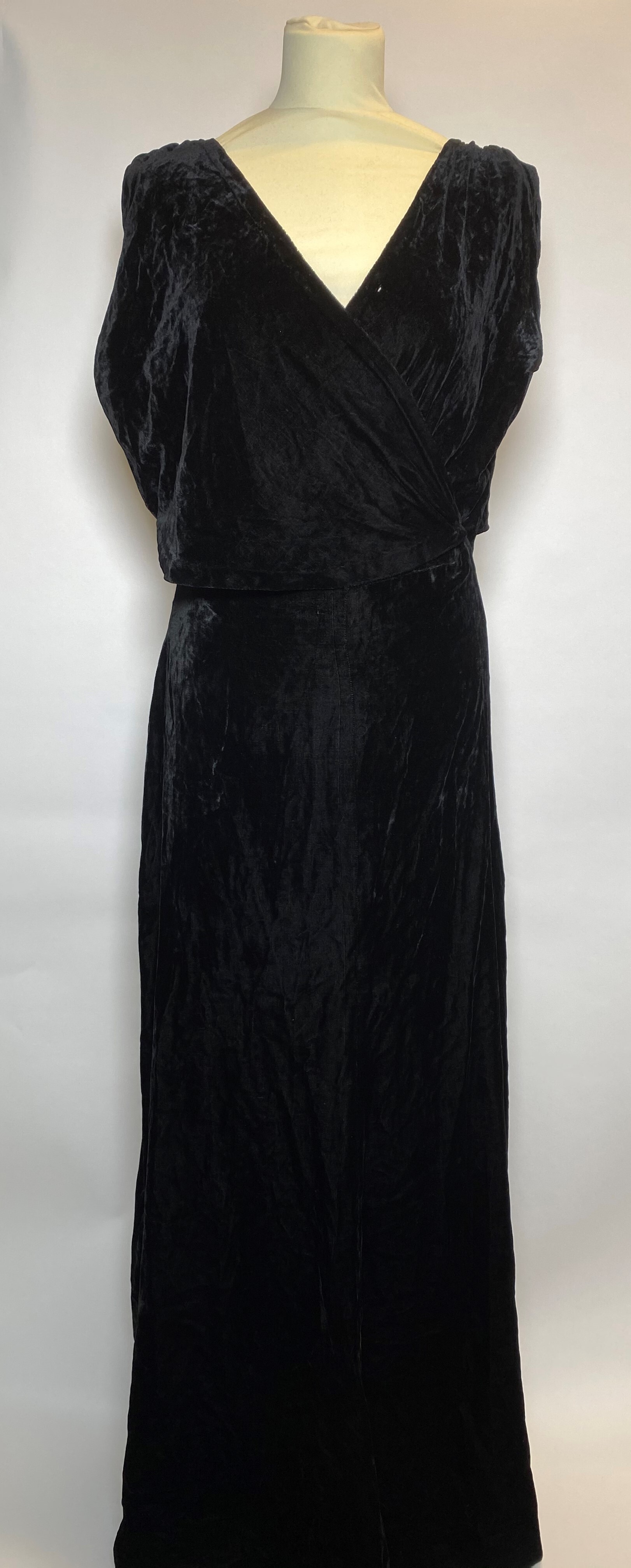 Klänning i svart silkessammet, som sannolikt tillhört Maria ”Maja” Mannerfelt (1892-1961) och tidigare burits med gallerärmar som hovdräkt. Klänningen består av ett liv och en kjol hopsydda i midjan med maskinsöm. Livets framstycke består av två delar som går omlott hvilket ger en omlotturringning. Höger framstycke ligger framför vänster framstycke och fästs med en haka och tränsad ögla. Vid hakan på höger framstycke är kanten rynkad. Framstyckets fållar i halsringningen är enkeltvikta och sydda med svart silkestråd och krejsöm. Höger framstycke har ett 6 cm vertikalt insnitt från midjan nära höger sidsöm, handsydd med svart silkestråd och glesa efterstygn. På höger framstycke finns en mindre maskinsydd skarvning vid höger sidsöm. Vänster framstycke har ett 3 cm långt insnitt för byst från armhålan, handsydd med svart silkestråd och glesa efterstygn. Framstyckena är rynkade vid axelsömmarna. Livets bakstycke består av två delar som går omlott och därmed speglar framstyckets halsringning. Bakstyckets fållar i halsringningen är enkeltvikta och sydda med svart silkestråd och krejsöm. Vänster bakstycke ligger framför höger bakstycke. Mitt bak vid urringningen där vänster bakstycke möter höger bakstycke finns det några glesa efterstygn sytt med svart silkestråd för att hålla ihop delarna. Höger bakstycke har en maskinsydd skarvning vid vänster sidsöm. Bakstyckerna är försiktigt rynkade vid axelsömmarna. I båda axelsömmar sitter en säkerhetsnål. Längd axelsöm: 70 mm. I vänster sidsöm finns en 24 cm lång öppning som stängs med 7 hyskor och tränsade öglor. Dom tränsade öglorna sitter på livets högra bakstycke och kjolens högra bakvåd. Klänningens kjol består av fem våder, två våder fram med en mittsöm lite förskjuten mot vänster och tre våder bak vilket ger totalt fem sömmar, alla maskinsydda. Höger framvåd har ett 11 cm långt insnitt i midjan som löper från höger sidsöm. Kjolens fåll är enkeltvikt och sydd med svart silkestråd och krejsöm. Klänningen är troligen hemsydd.