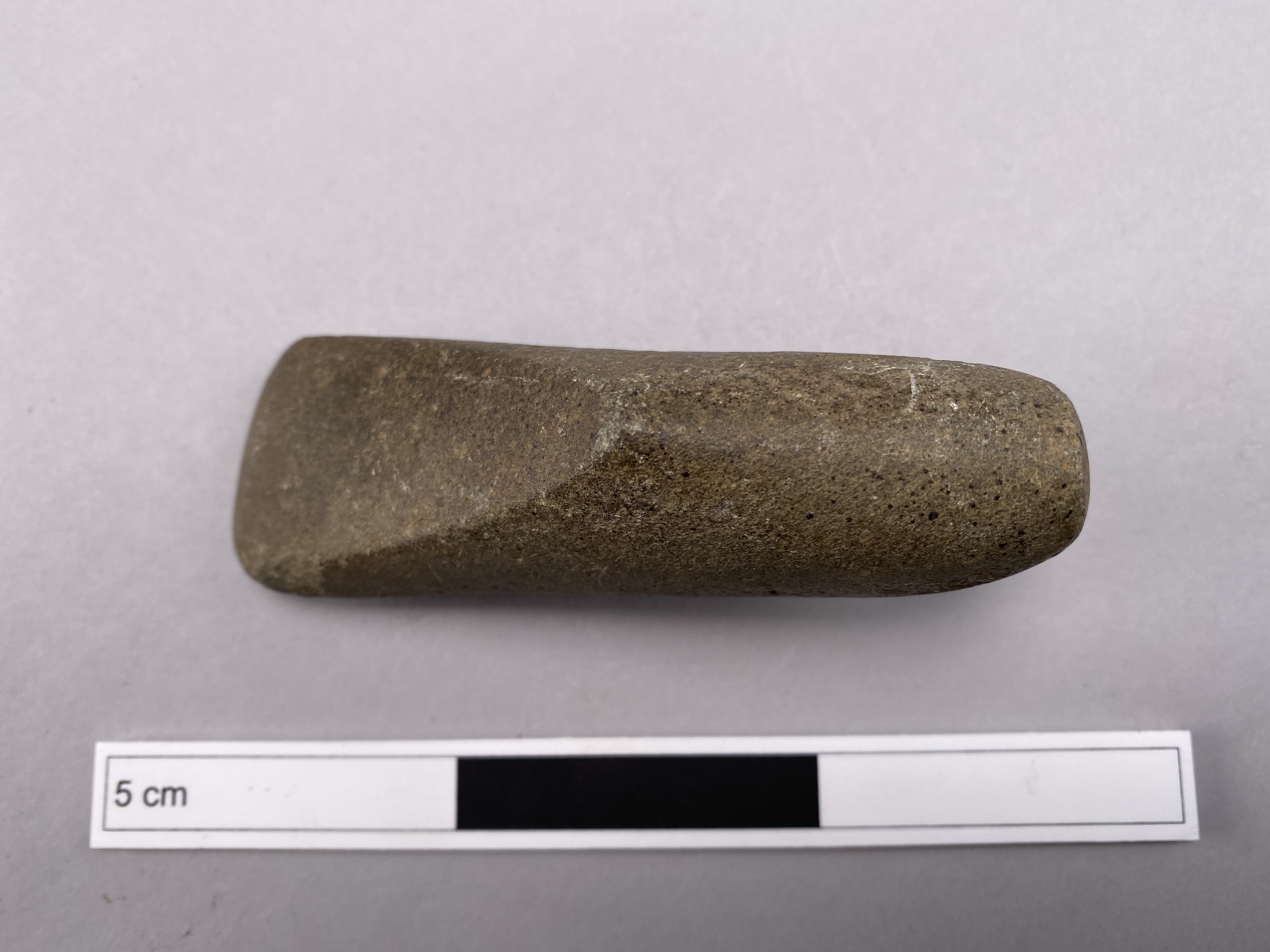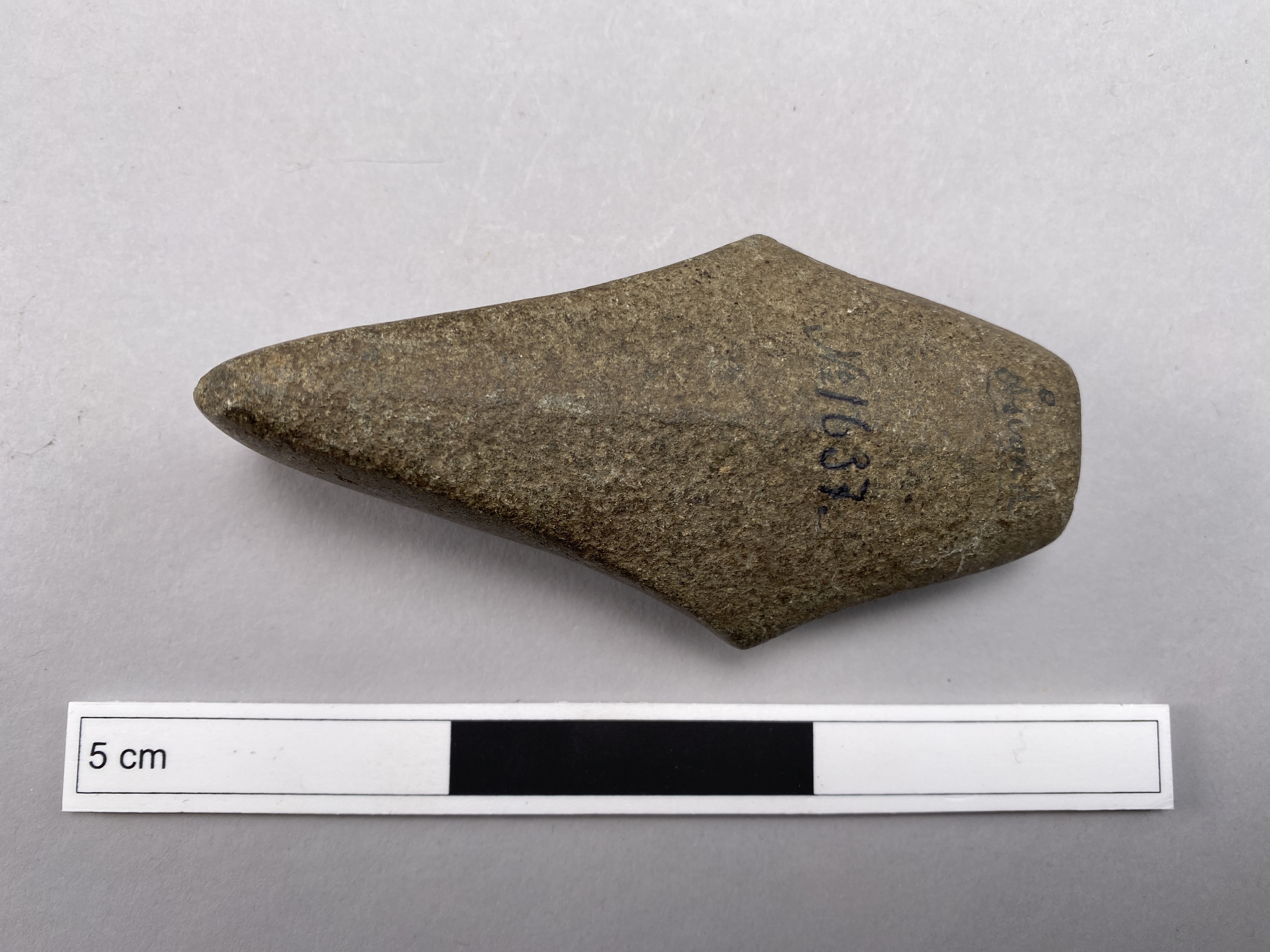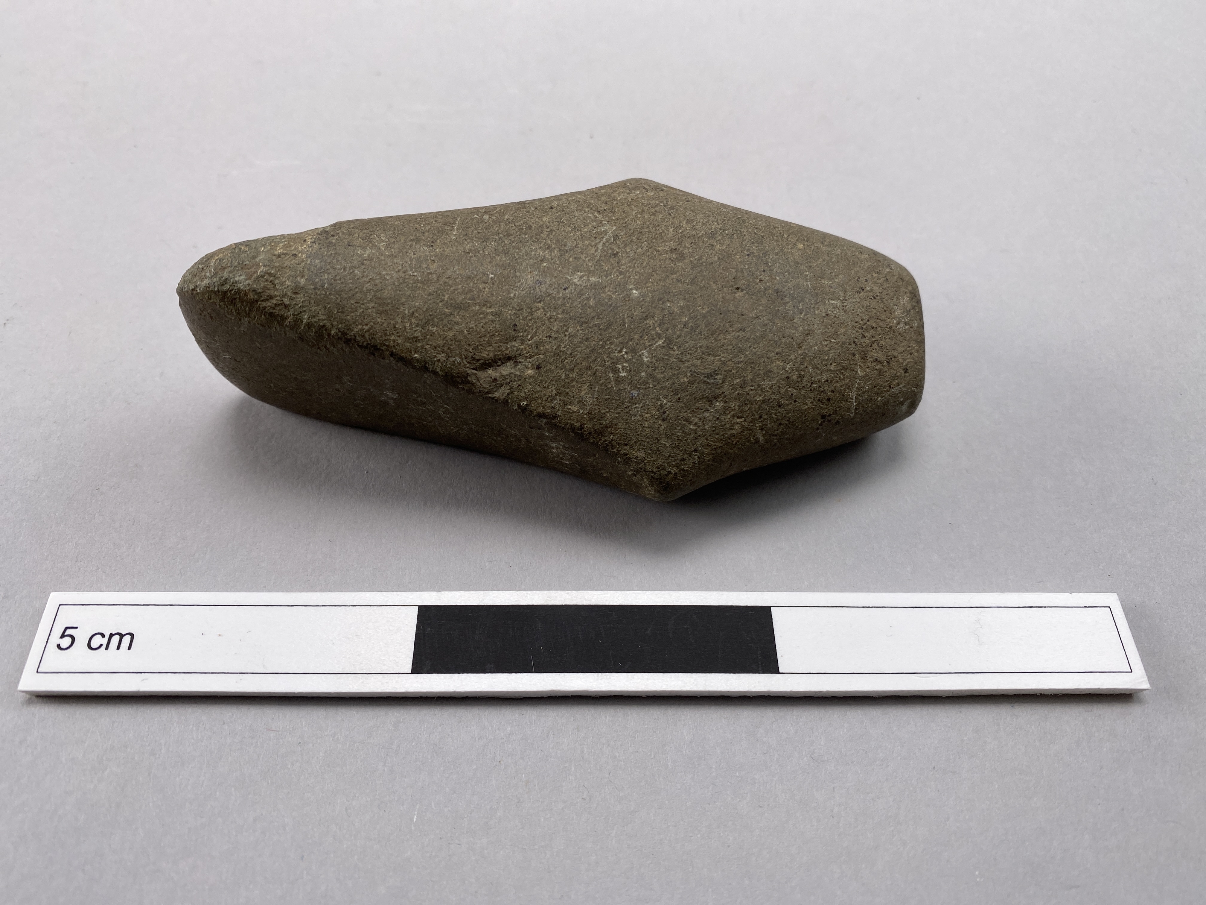 Rombiskt yxförarbete med ryggad översida och rundad undersida. Välslipad, men utan påbörjat skafthål.