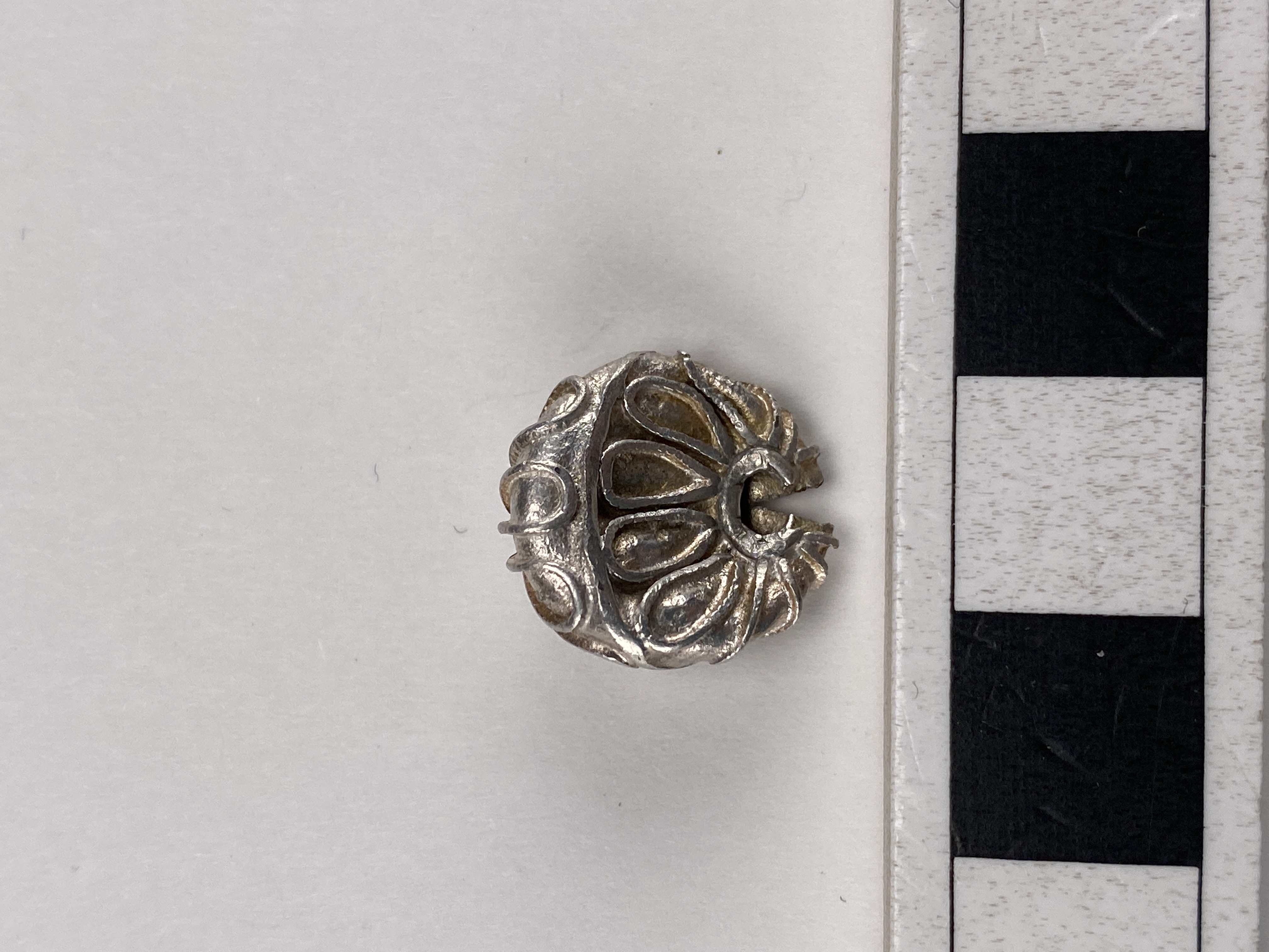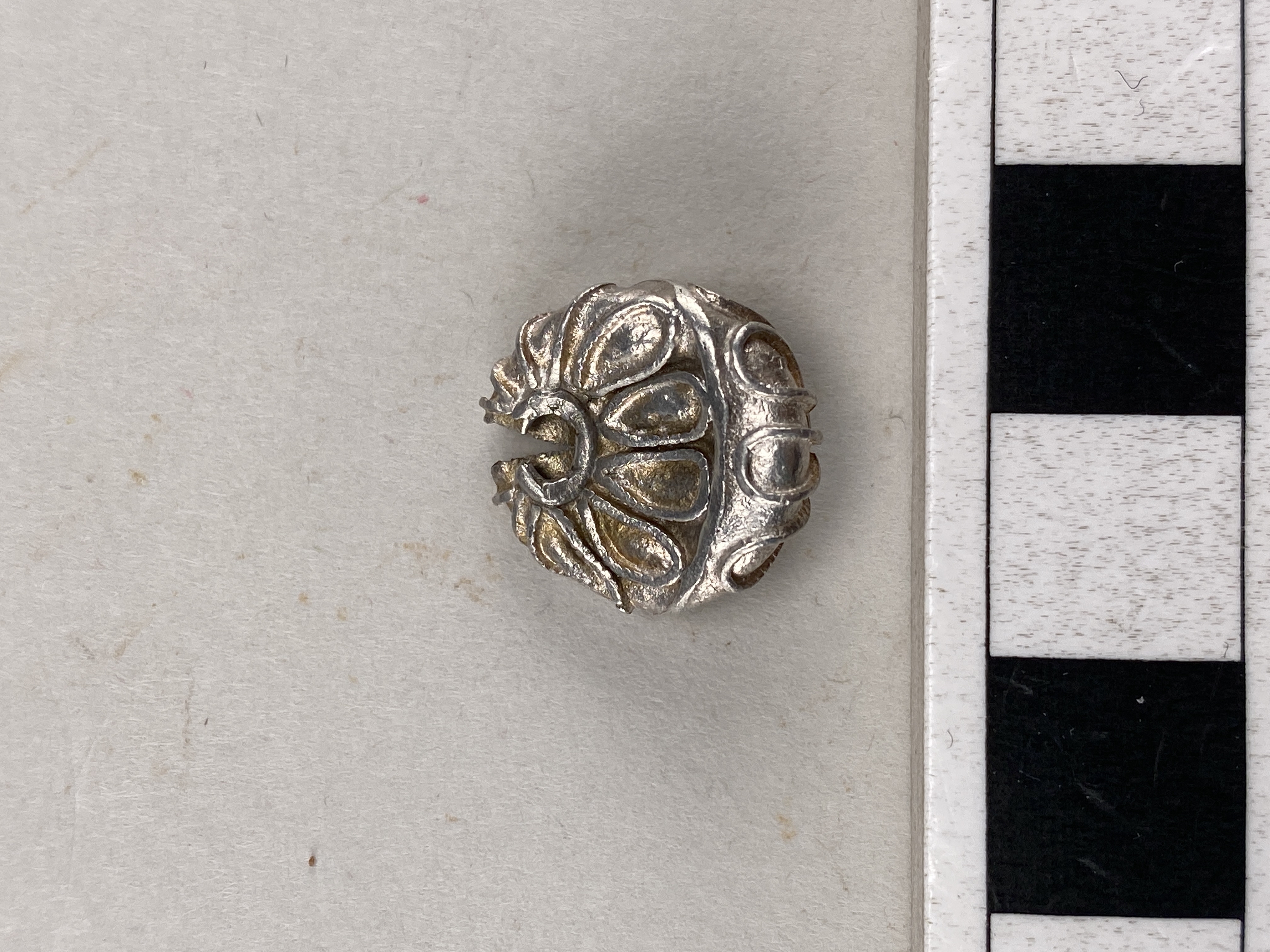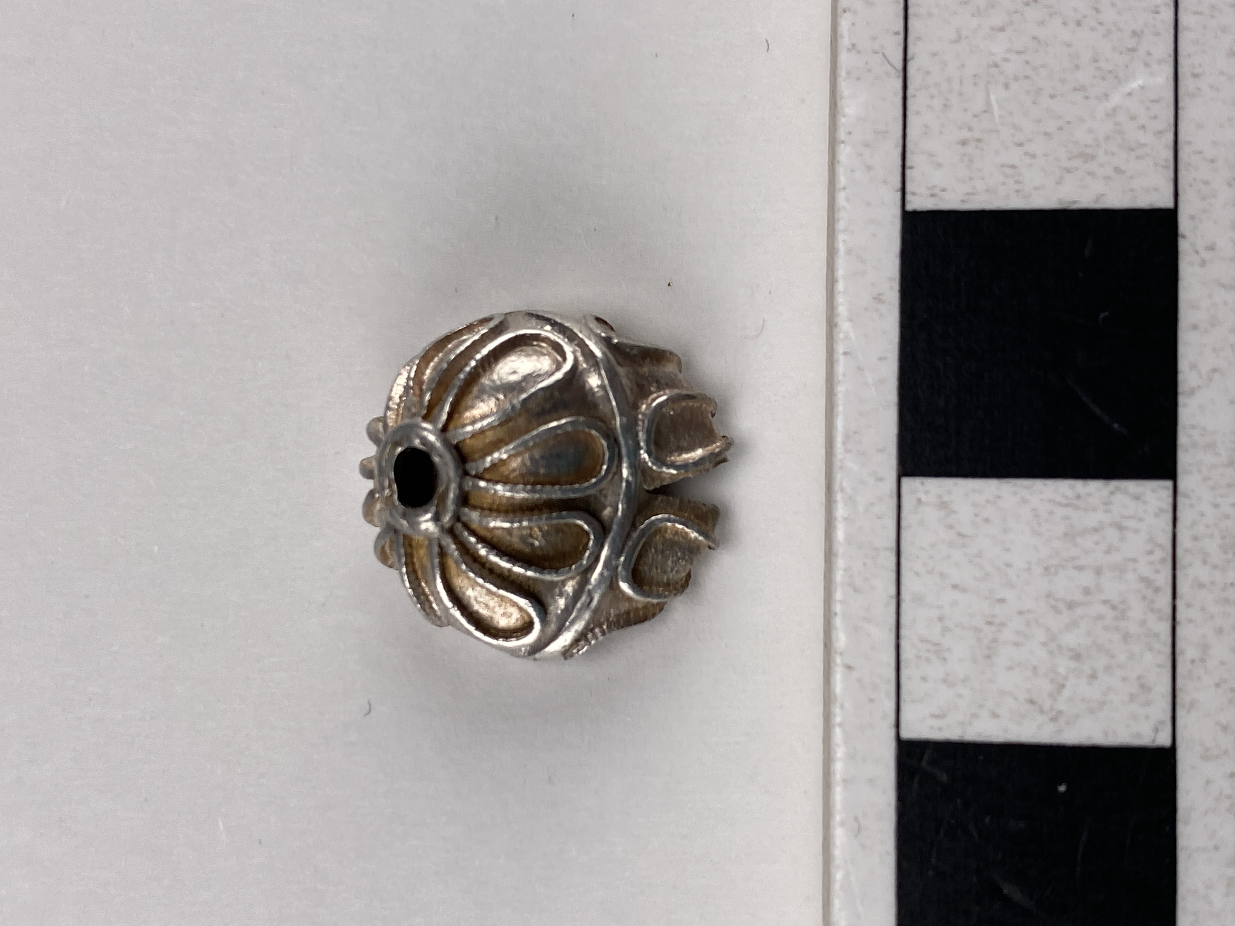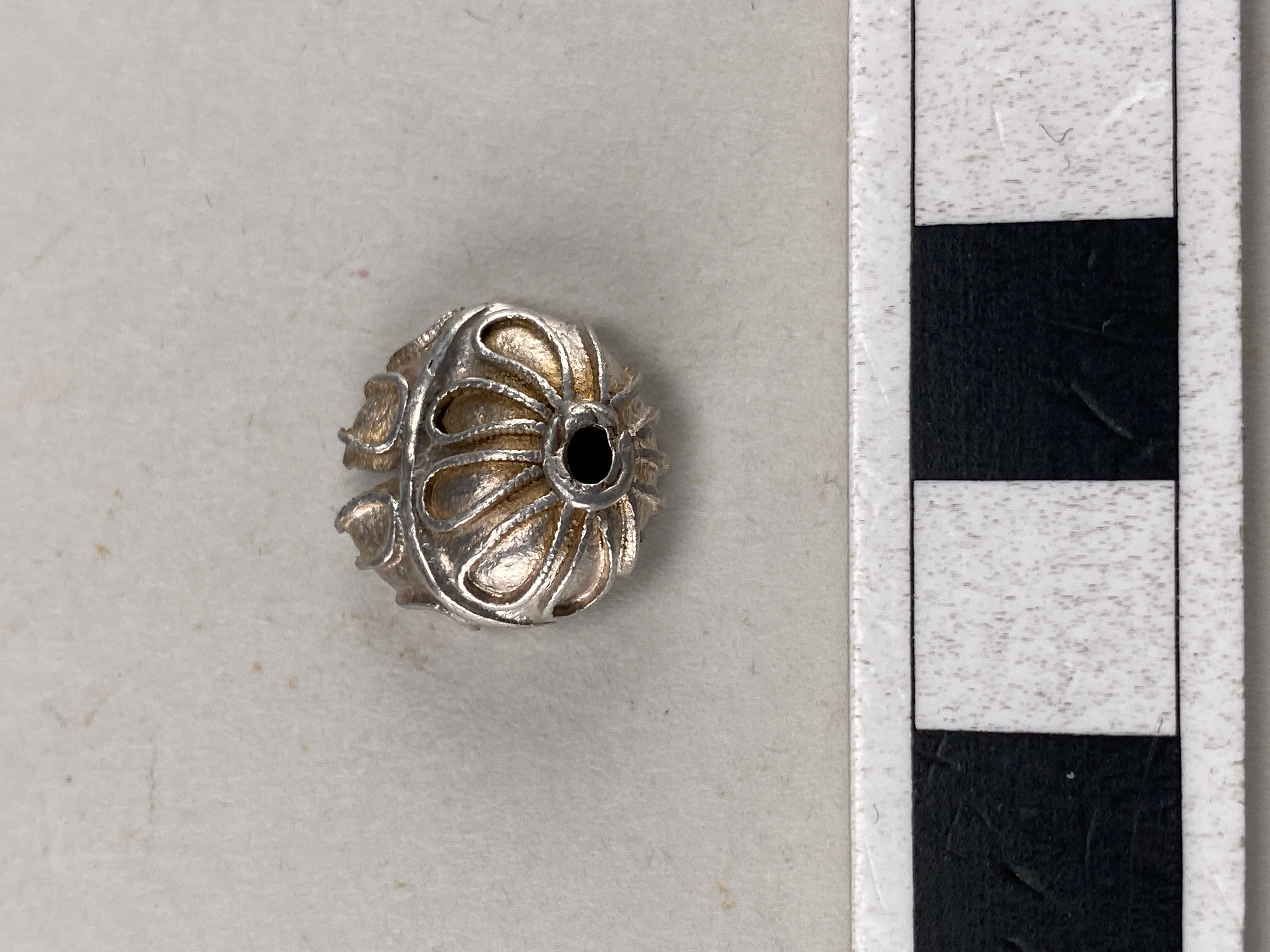 Pärlan är av tunn silverplåt. Silvertråd runt kanten av upphägningshål samt mage (sfärens storcirkel). Snedpärlade filigrantrådar som tvinnats för att efterlikna granulation, skapar ett blomliknande mönster genom att ett bladliknande ornament har lagts från upphägningshål till storcirkelns silvertråd, ornamentet utgår från upphäg- ningshålens kanttrådar. Pärlan är ihålig.