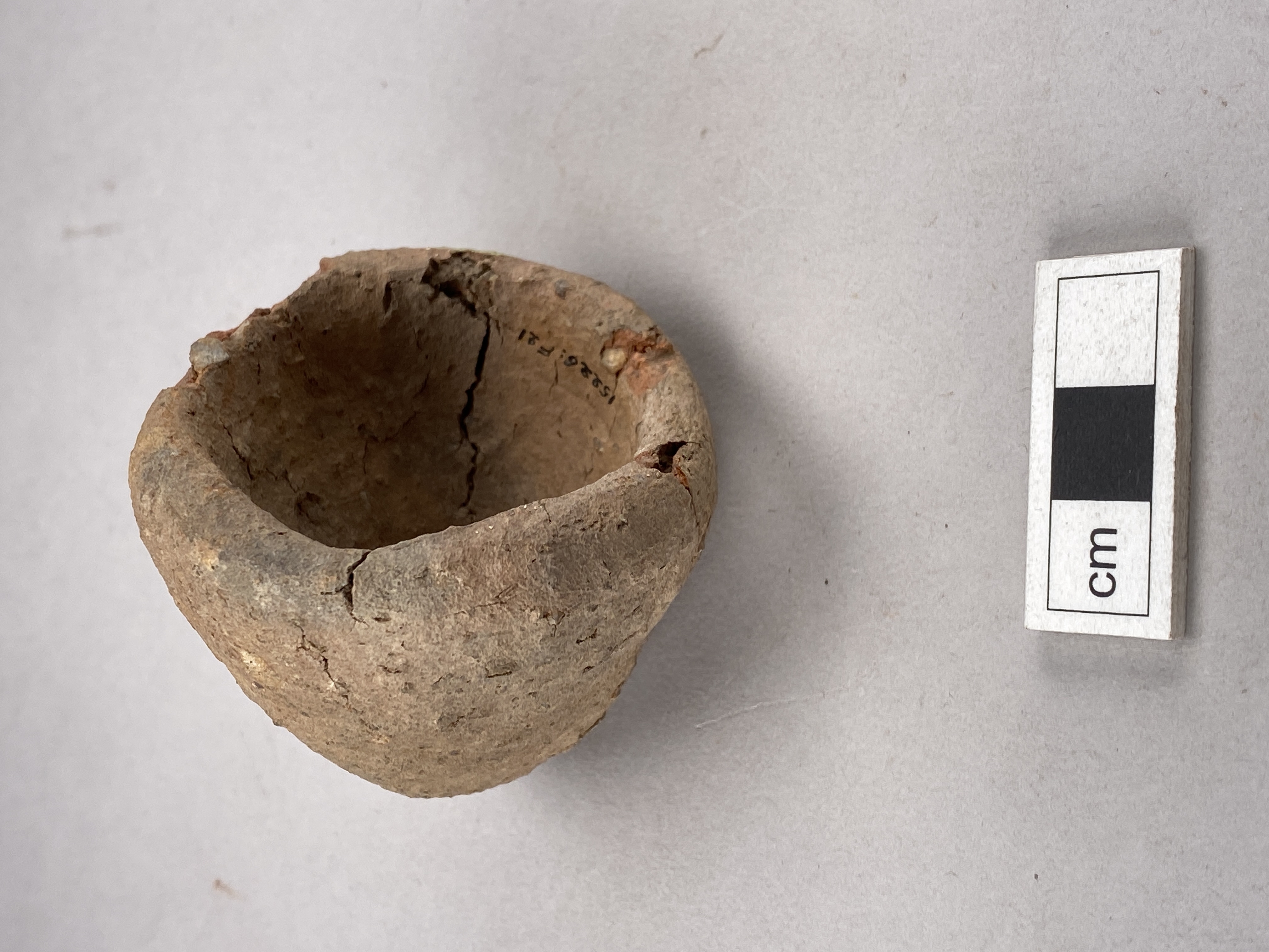 Oornerad miniatyrkärl. Skadad på ett par platser vid mynningen. Sentida beläggning på mynningsrand. Större spricka och några mindre. Spetsbottnad. Fast bergartmagrat gods.