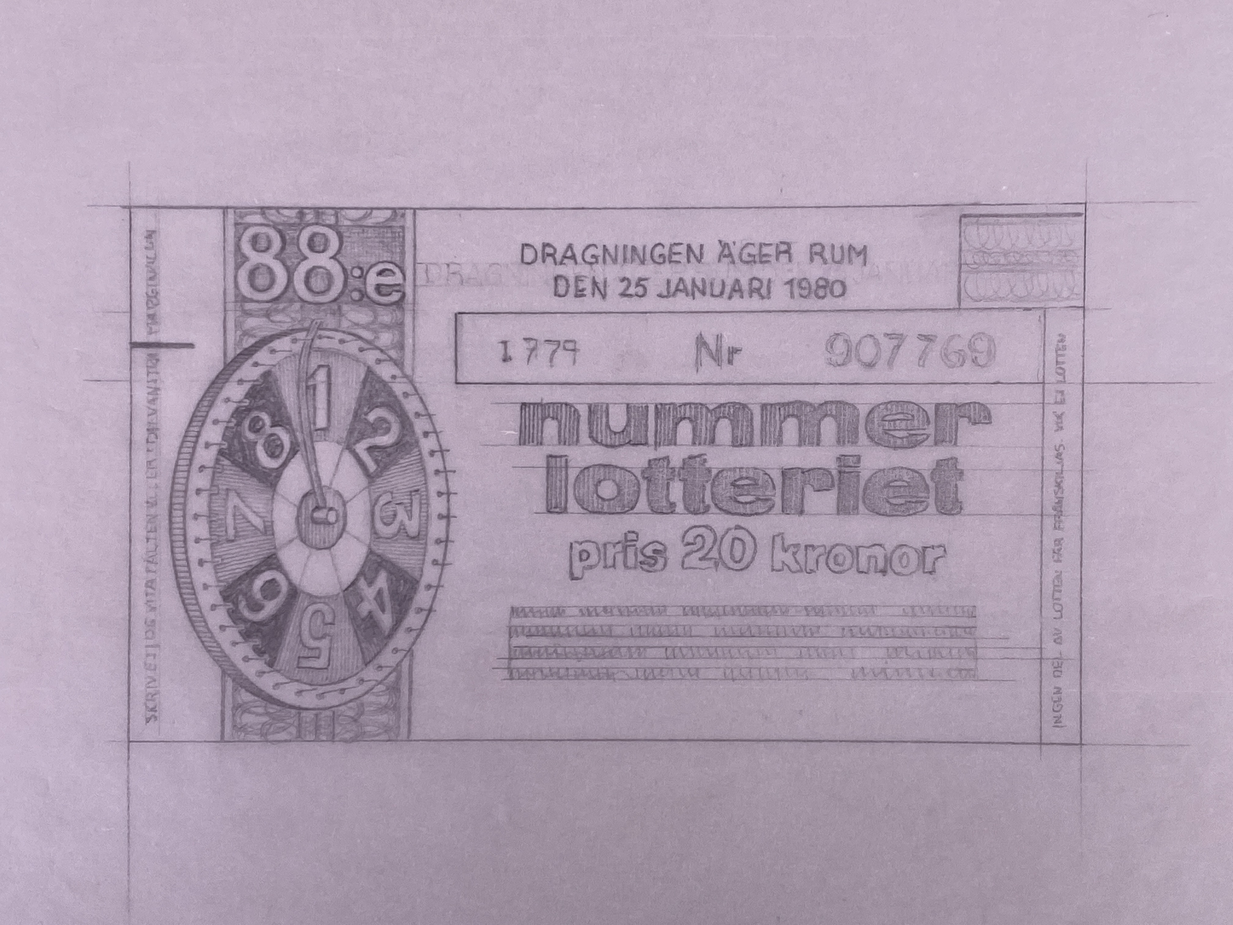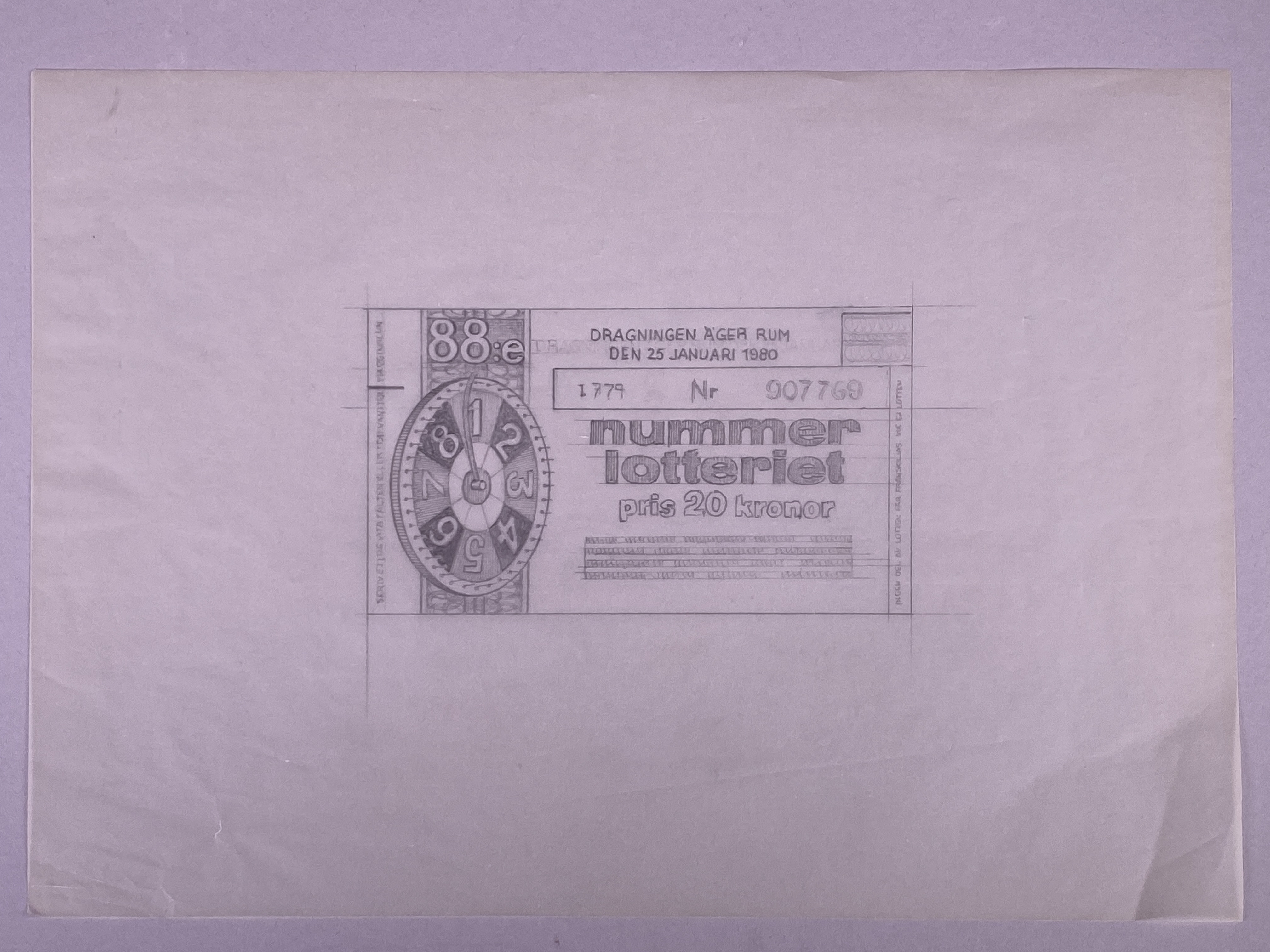 Tryck på vaxpapper ifyllt med grafitpenna. Designförslag på lott med dragningsdatum den 25 januari 1980.