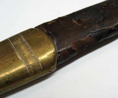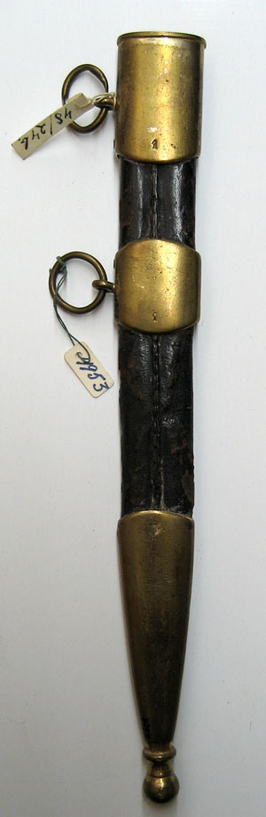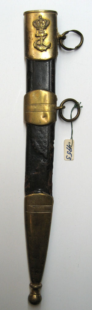 Balja med stomme av trä, överklädd med skinn. Beslag av mässing. Munbleck av mässing med bärring. På munbleckets utsida ett ankare krönt av en kunglig krona. Mellanband med bärring. Doppsko med kulformig ände. Beslagen märkta 1 på baljans insida.