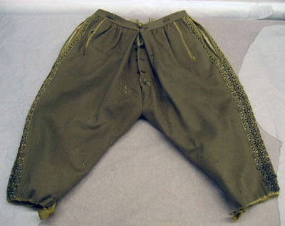 Smala knälånga byxor av grågrönt kläde, fodrade med vit taft samt med revärer garnerade med galoner av guld- och silvertråd samt svart silkestråd. En 34 mm bred midjelinning nedanför vilken byxornas vidd har samlats i rynkor. Mitt bak på midjelinningen ett kilformat, midjereglerande sprund. Sprundet är försett med två snörhål, kantade med stygn av silvertråd. Mitt fram på midjelinningen sitter ett 30 mm brett knapphål kantat med guldtråd med en motsvarande rund hög knapp klädd med snörmakeriarbete av guldtråd och gul silkestråd. På vardera sida om knappen ett igensytt knapphål , 25 mm brett, kantat med guldtråd och svart silkestråd. Sprund mitt fram, 250 mm. Sprundet knäpps av fyra runda knappar klädda med svart silkestråd och silvertråd i ett snörmakeriarbete samt motsvarande knapphål, 22 mm breda, kantade av stygn av svart silkestråd och guldtråd. På vardera sida nedanför midjelinningen en sprundficka, 230 mm lång, samt en vertikal ficka på framstyckena intill sprundfickan, 70 mm långa och kantade med ett smalt guldskimrande sidenband, 6 mm brett. En omvikt fåll, 7 mm bred, vid byxbenens slut. Fållen är av samma slags guldskimrande sidenband som kantar fickroan på framstyckena. Bandet bildar en dragsko knuten med en bred rosett. Ett sprund i byxbenens innersöm, 45 mm högt. Galonerna kallas 1698 för "Mouschaes Galoner", vilket syftar på det mouschliknande mönster som den svarta silkestråden bildar. Dräkten är troligen sydd i Sverige. Den uppvisar stora likheter med Karl XI:s bröllopsdräkt vad gäller dragskon nertill på byxorna samt byxornas främre sprund som knäpps utan särskild knäppslå som på franska byxor.