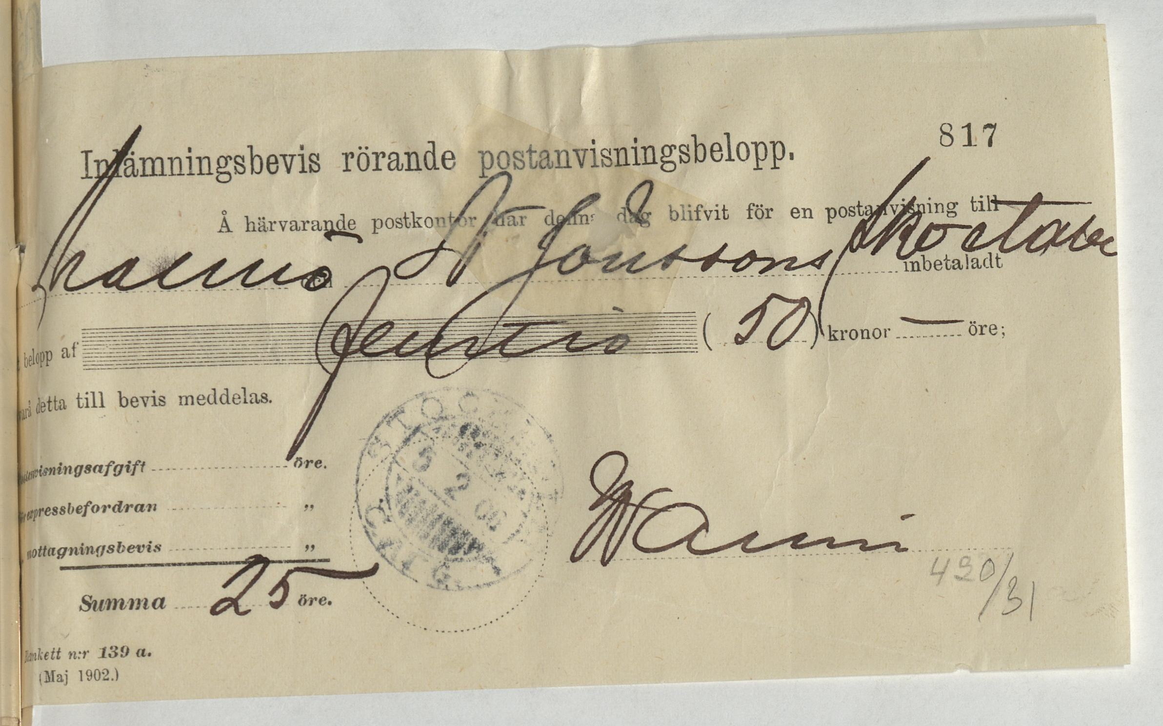 Inlämningsbevis rörande postanvisningsbelopp till N. Jönssons Skoetablissement
