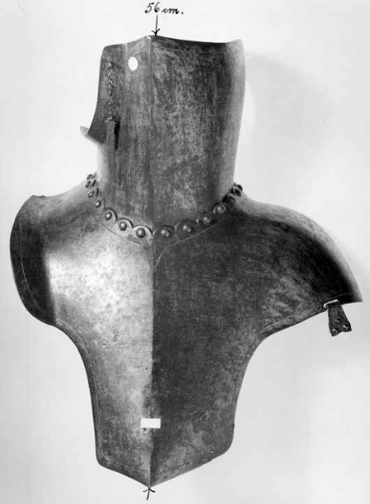 bröstharnesk med 2:ne sleifer af jern och jernhylsor, deraf 4 för tornerhaken och en för förstärkningsharneskets fästande
