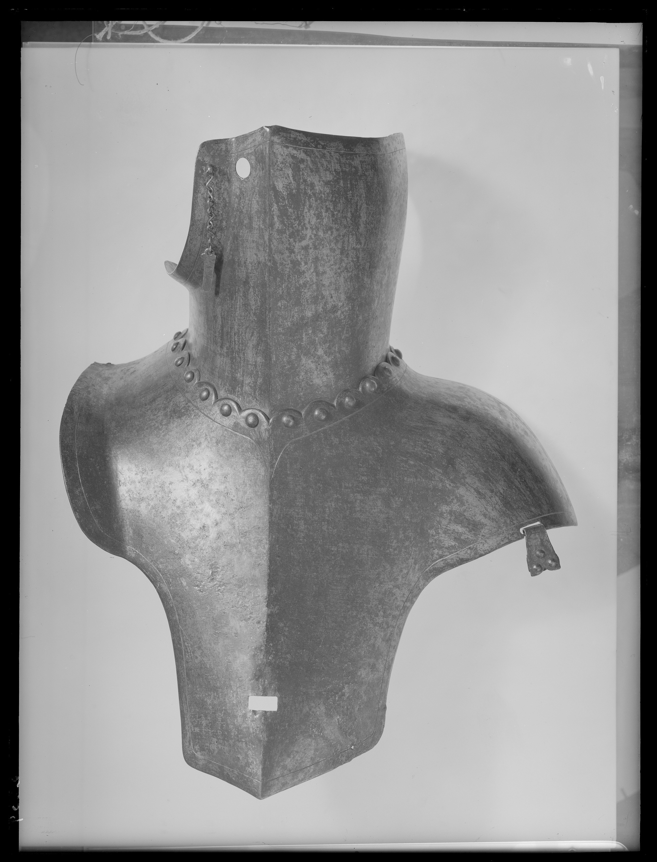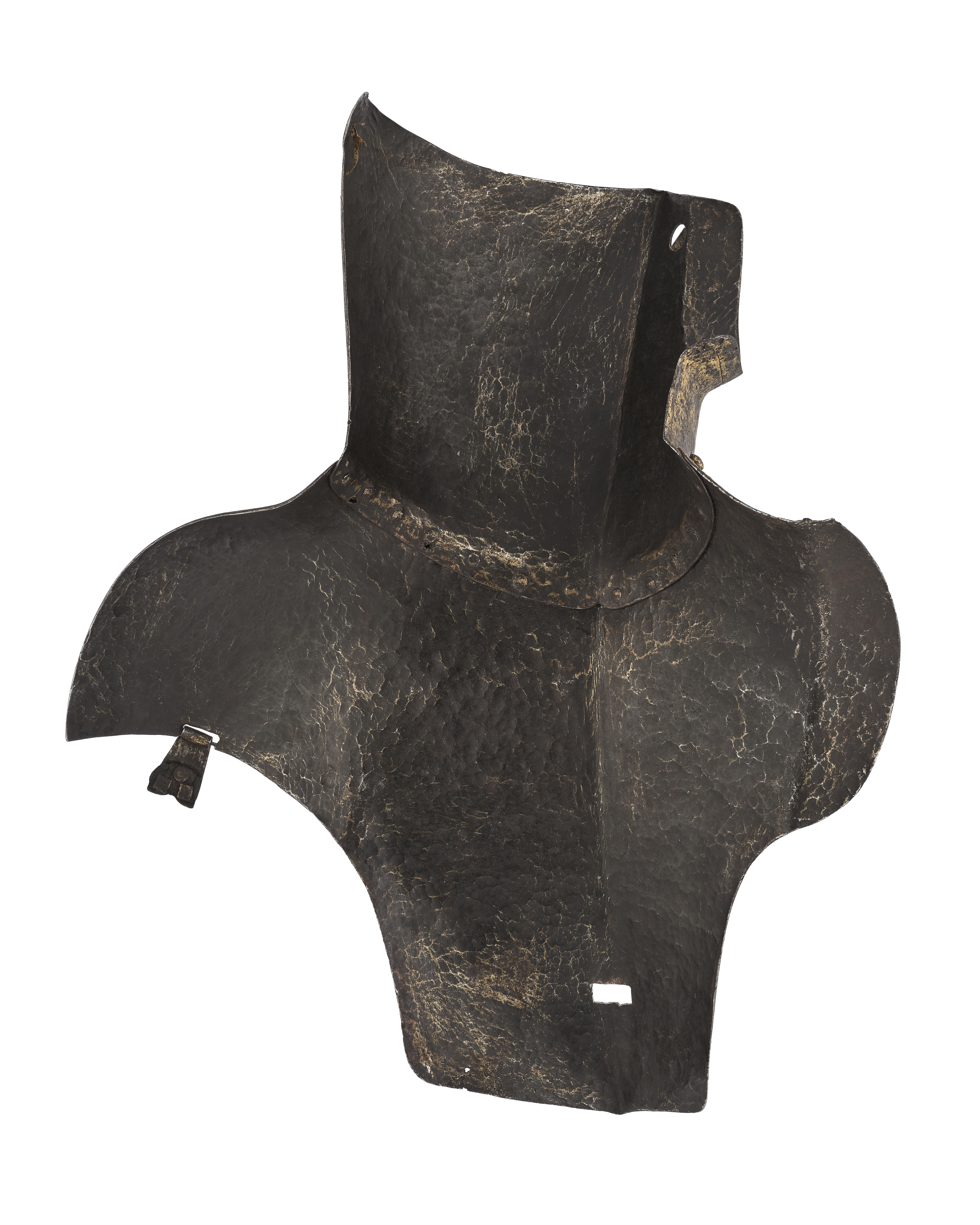 Nedre delen utdragen och välvd över höger axlel, avtagen med uppvikt rundad kant över vänster och nedåt avsmalnande över buken med svagt spetsigt avslut. Längsgående mittås. Övre kant vågig med en nit i varje "våg". I nederkant vid vänster axel ett hål med del av spänne. 70 mm från nederkant ett rektangulärt hål för harneskets tapp. Dekor av enkel kantlinje, under halsen nedvängd en spets.