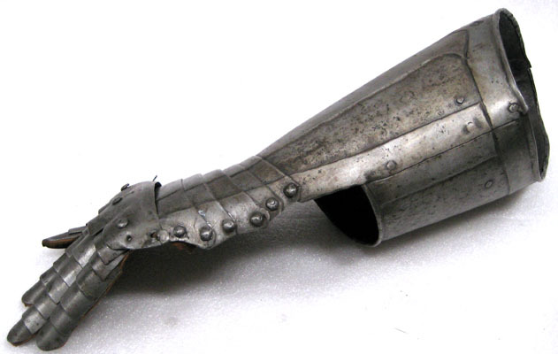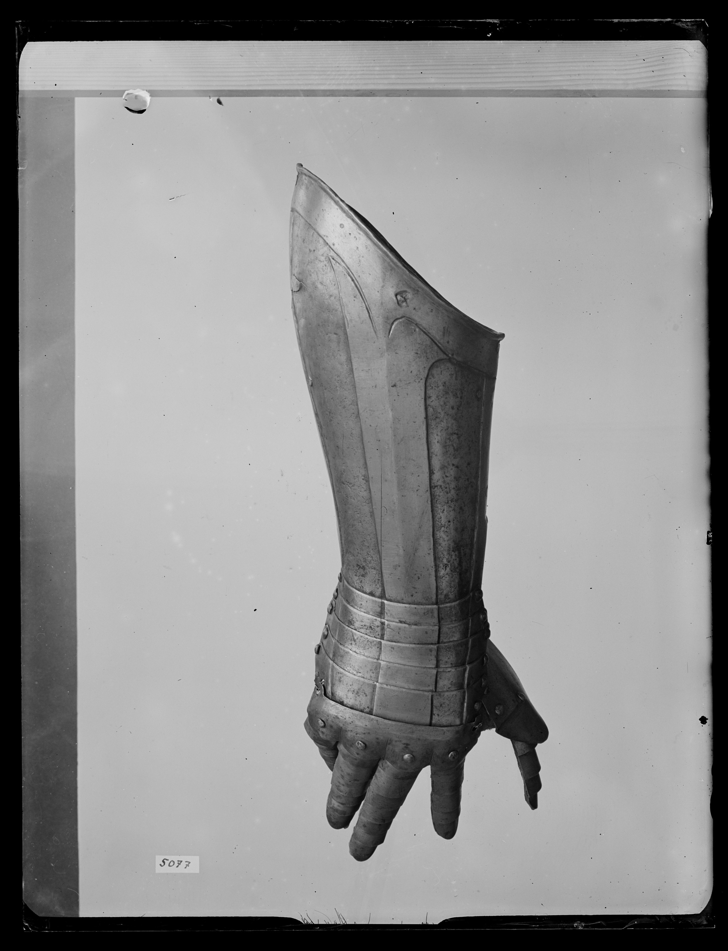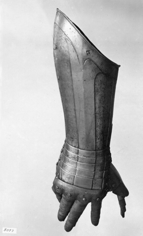 Av stålplåt. Utsidan metallren med mörka partier, släta bårder mot hammrad yta. Insidan ljusbrun, bahandlad, med tyliga slagmärken. Sammanlagt 31 delar. Lång krage av två nitade och sammansmidda halvor. Utsidan utdragen över armbågen, kanten vikt och rundsmidd. Kragen har förhöjd kantbård och från denna utgående tre bårder som fortsätter över handen. Denna består av fyra skenor samt en femte formad efter knogarna. Fingerskydd av lameller omlott nitade i bruna läderband. På kragen inslagen stämpel, otydlig men möjligen föreställande två korslagda svärd.